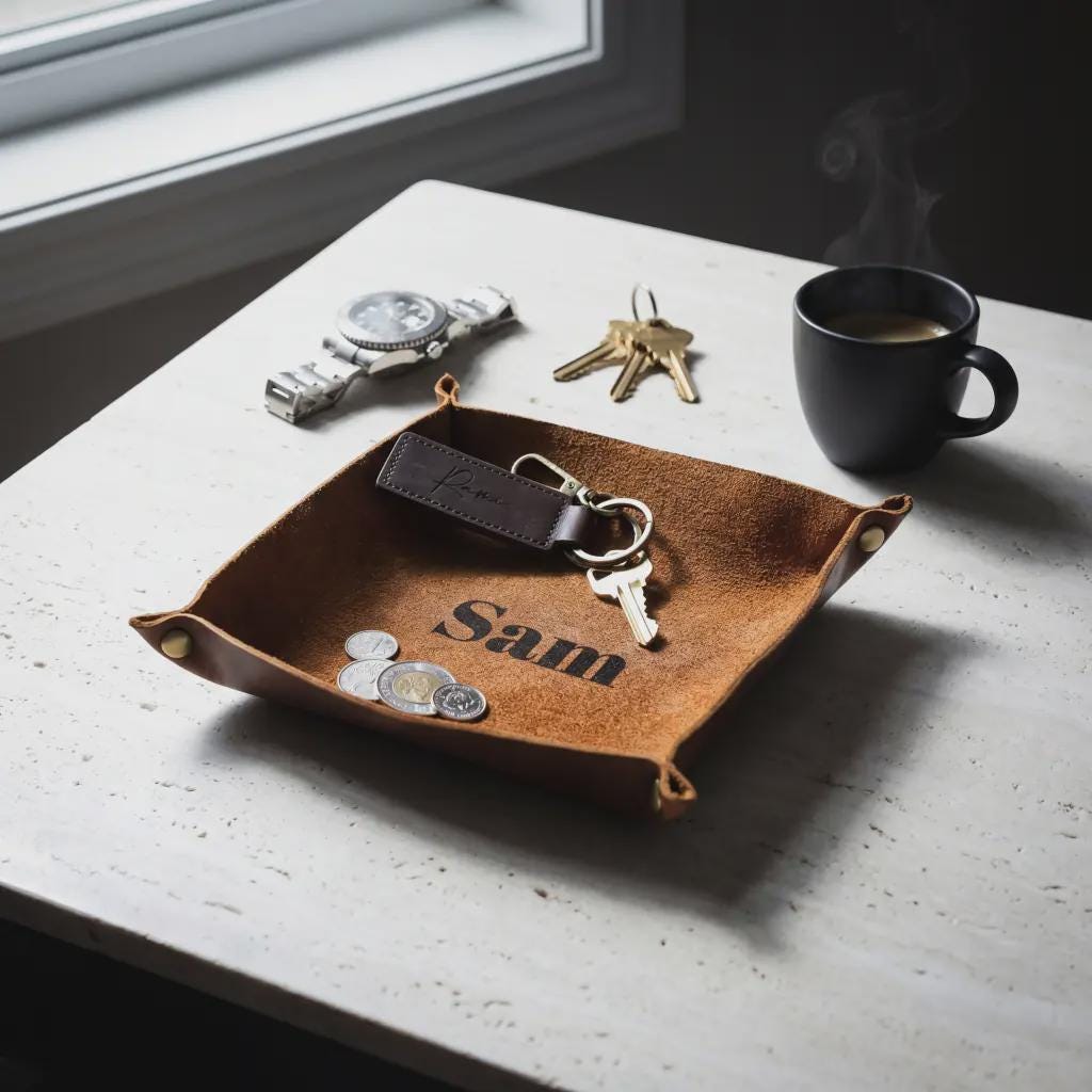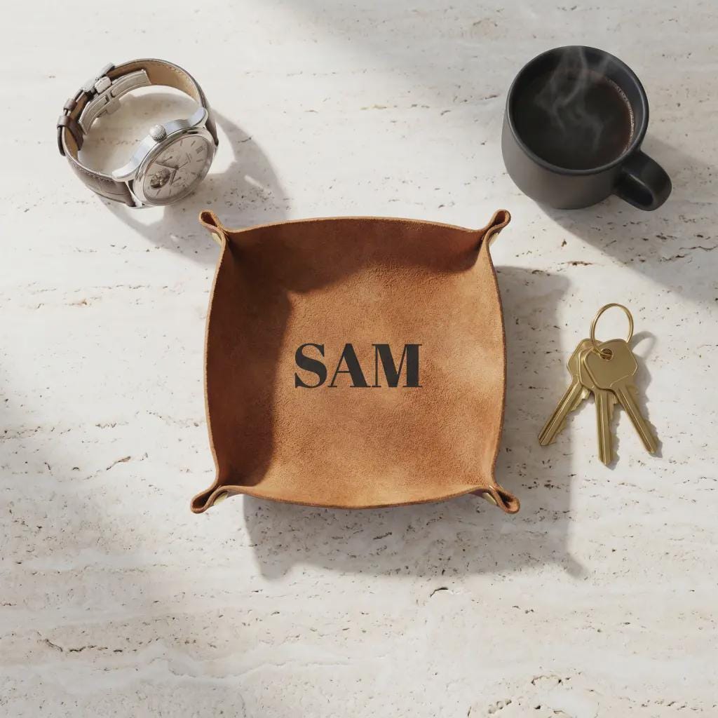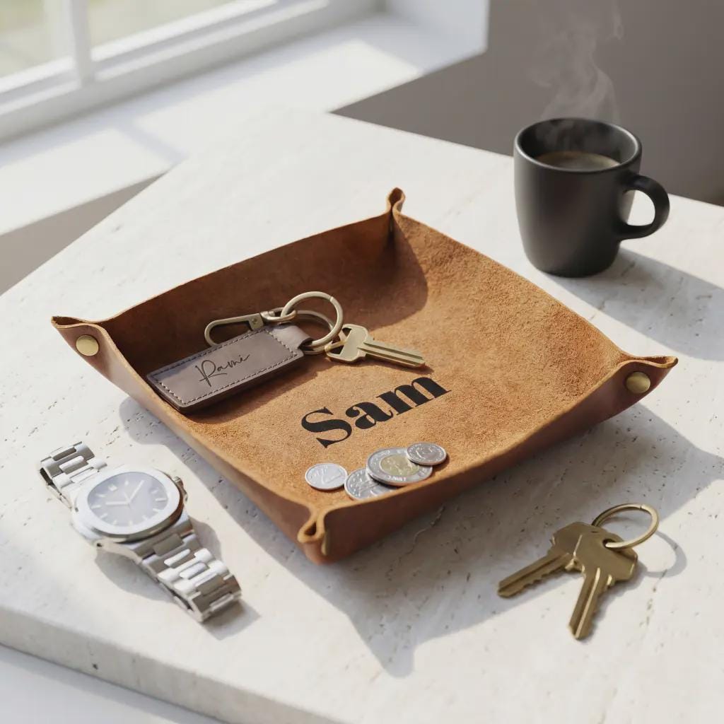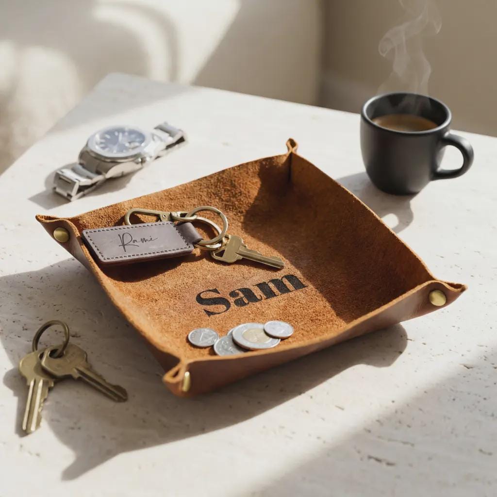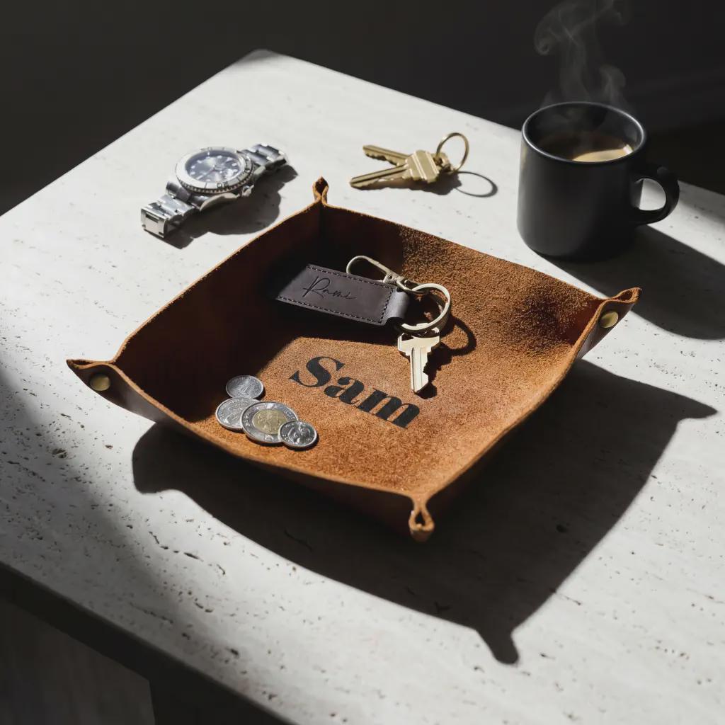 Simplify your space with a touch of timeless class. Our Personalized Genuine Leather Valet Tray is the perfect marriage of luxury materials and daily functionality.