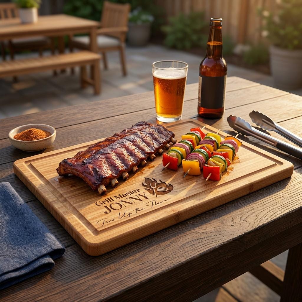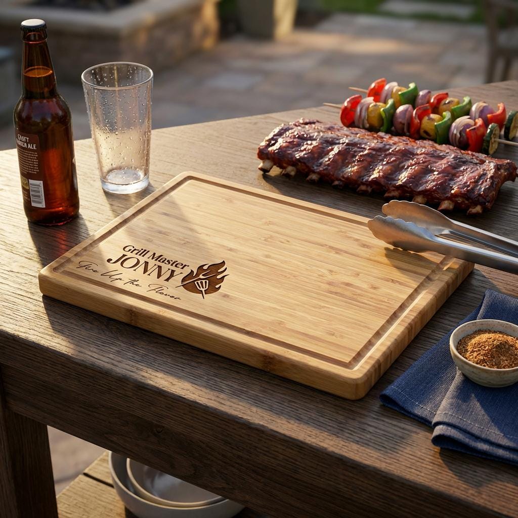 Master the grill with this personalized bamboo cutting board. This 1-inch thick custom engraved butcher block is a functional gift for home cooks and BBQ enthusiasts.