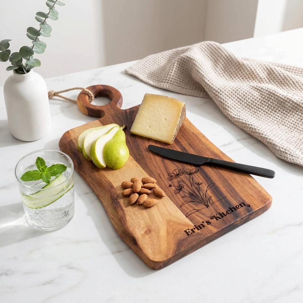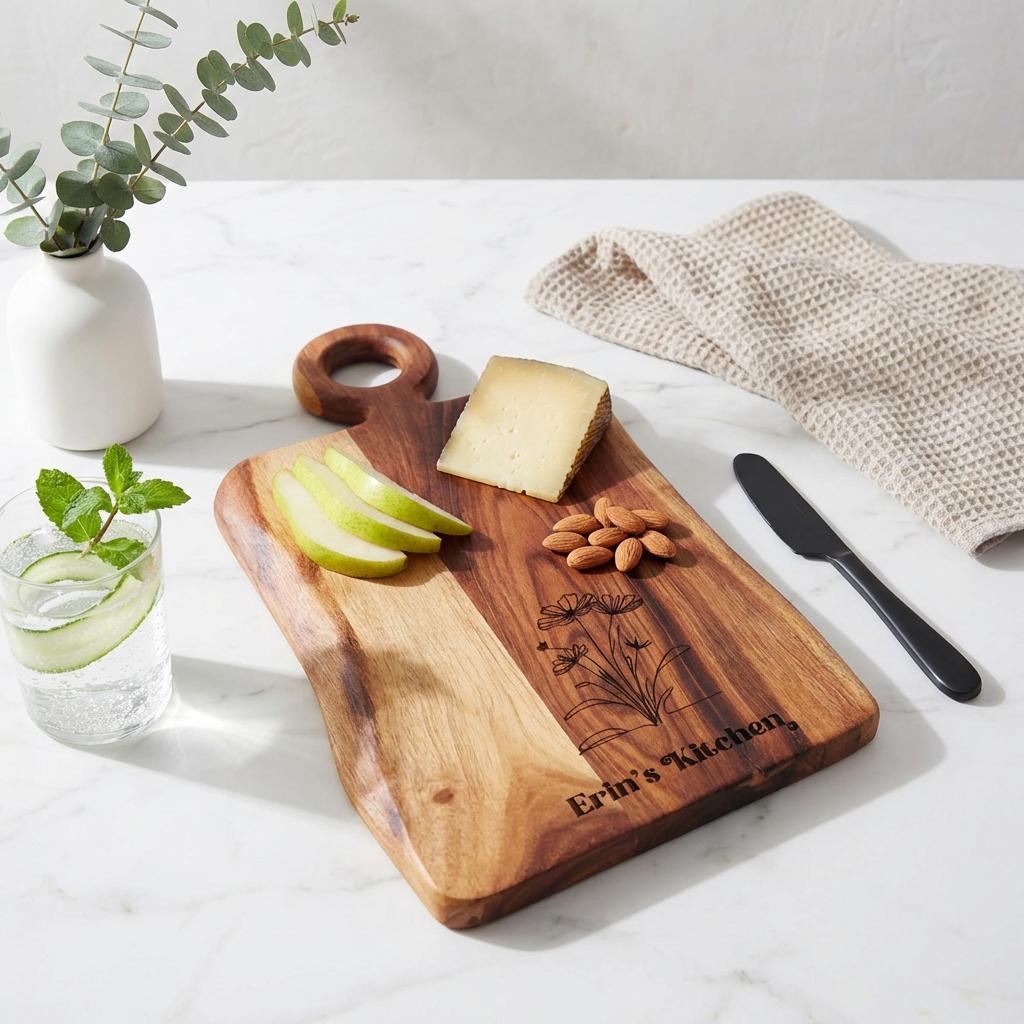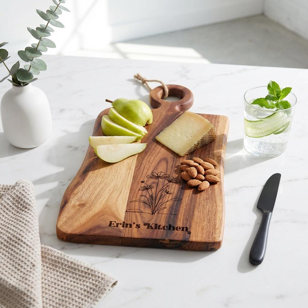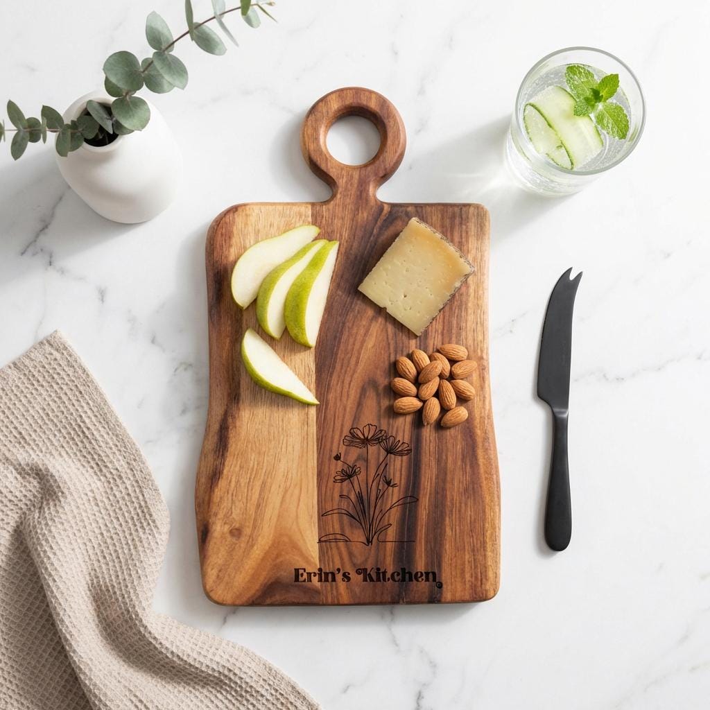 Personalized Wildflower Live Edge Cutting Board, Custom Wood Serving Tray with Handle