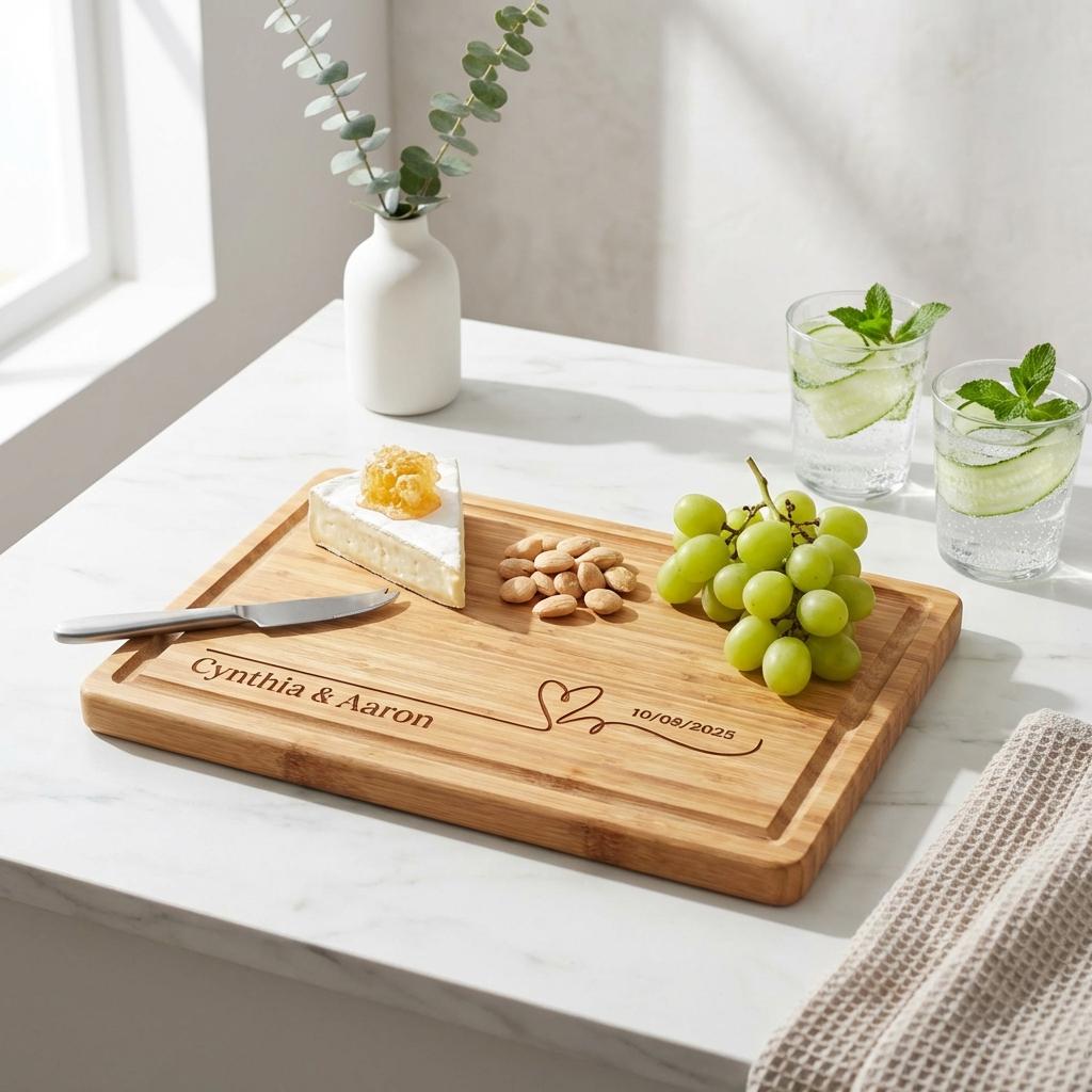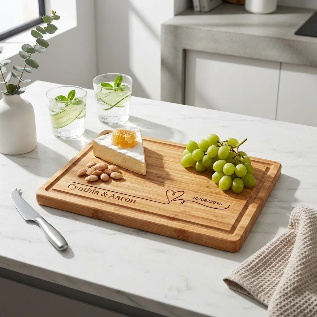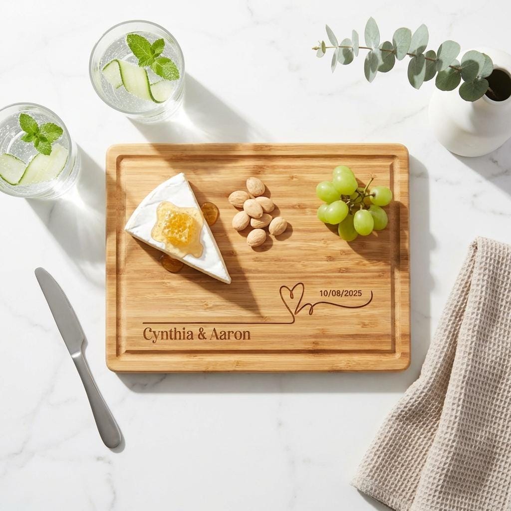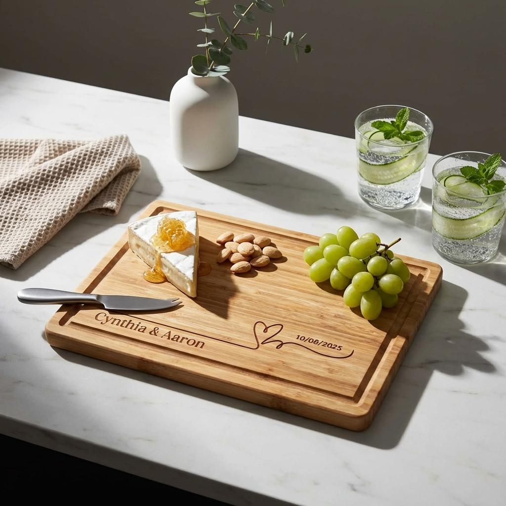 Elevate their home kitchen with this personalized 1-inch thick bamboo butcher block. Engineered using deep carbonization technology, this board provides 20-50% increased hardness and superior water resistance compared to standard wood. Precision laser-engraved with a custom heart design, names, and any date, it serves as a professional-grade food prep surface and a sophisticated charcuterie platter for entertaining.