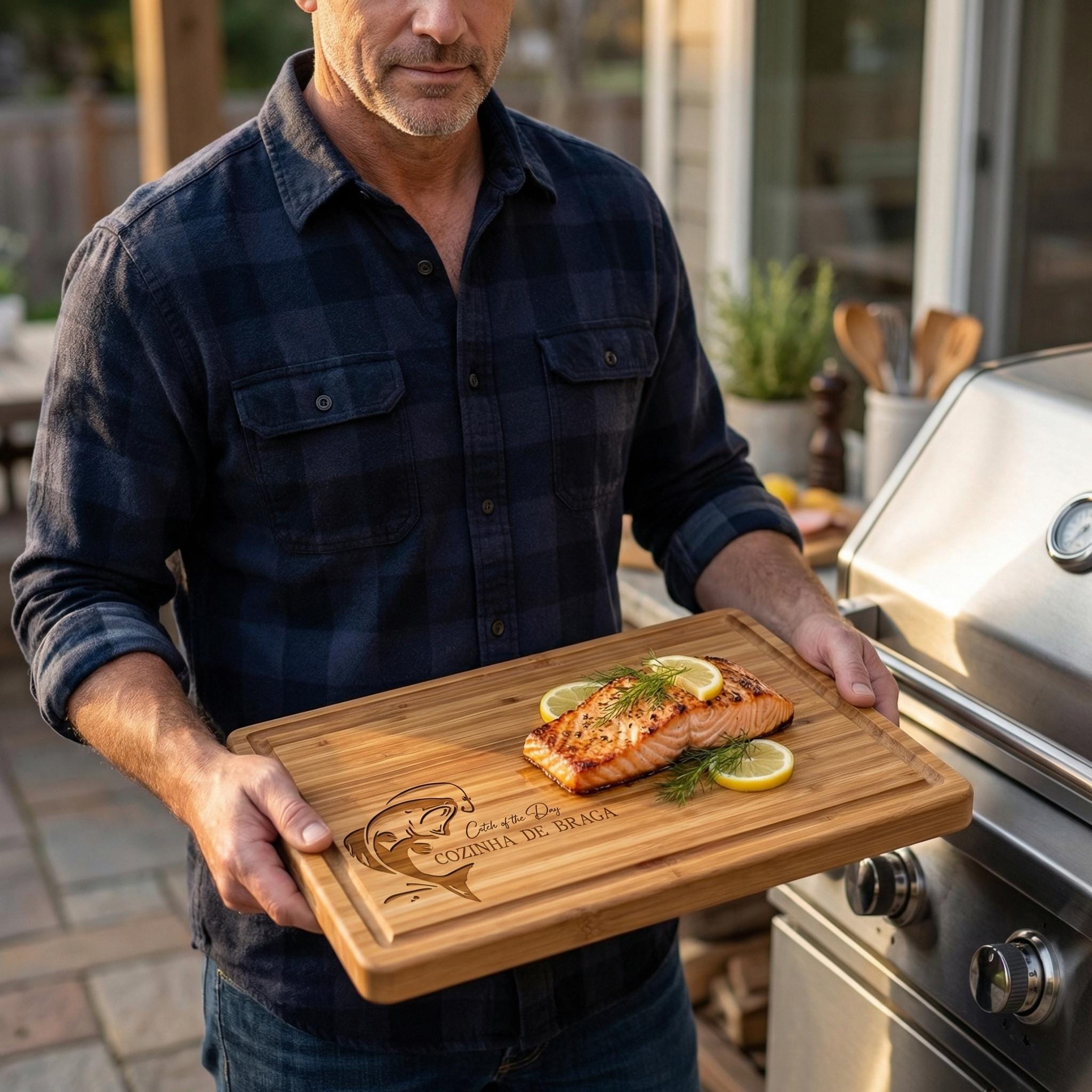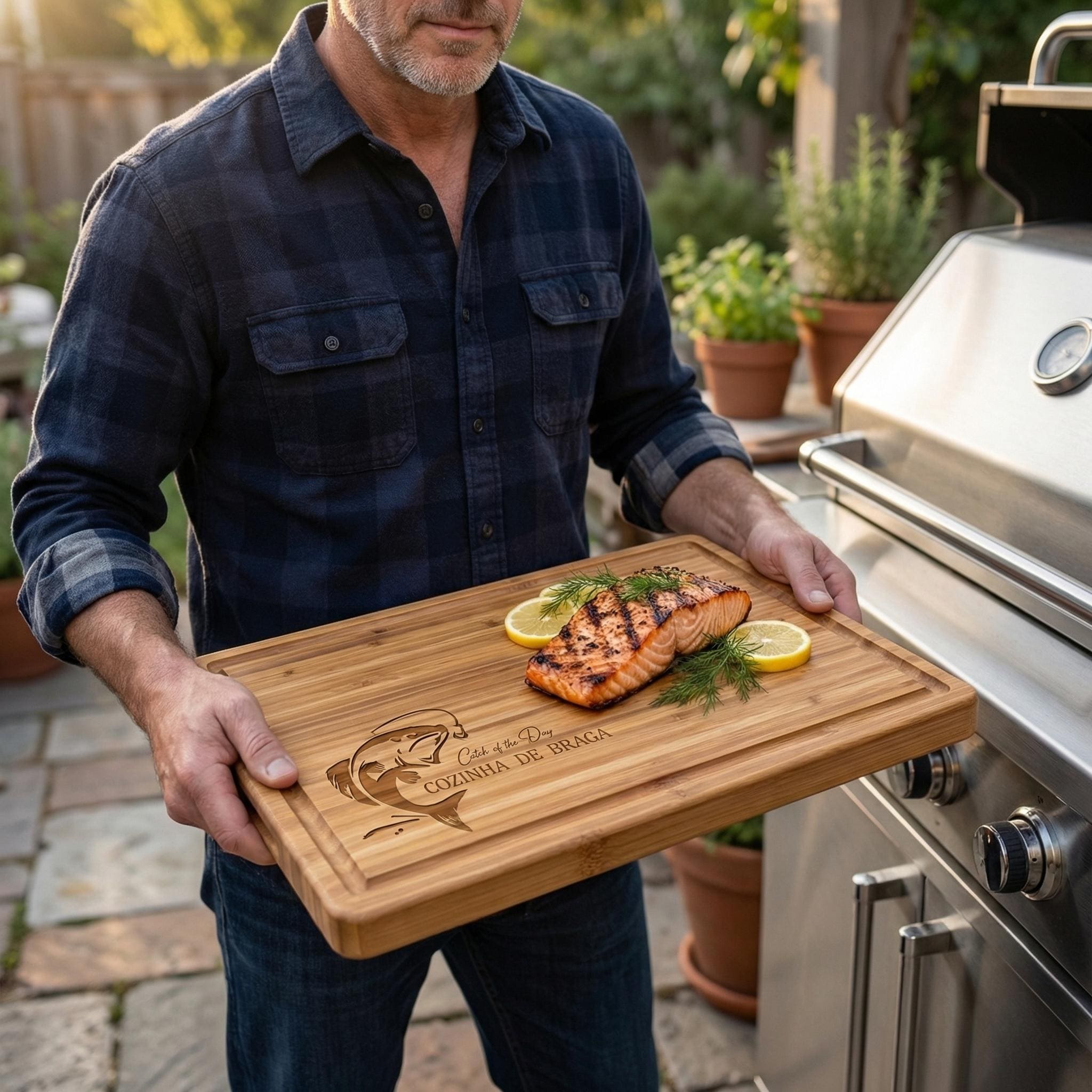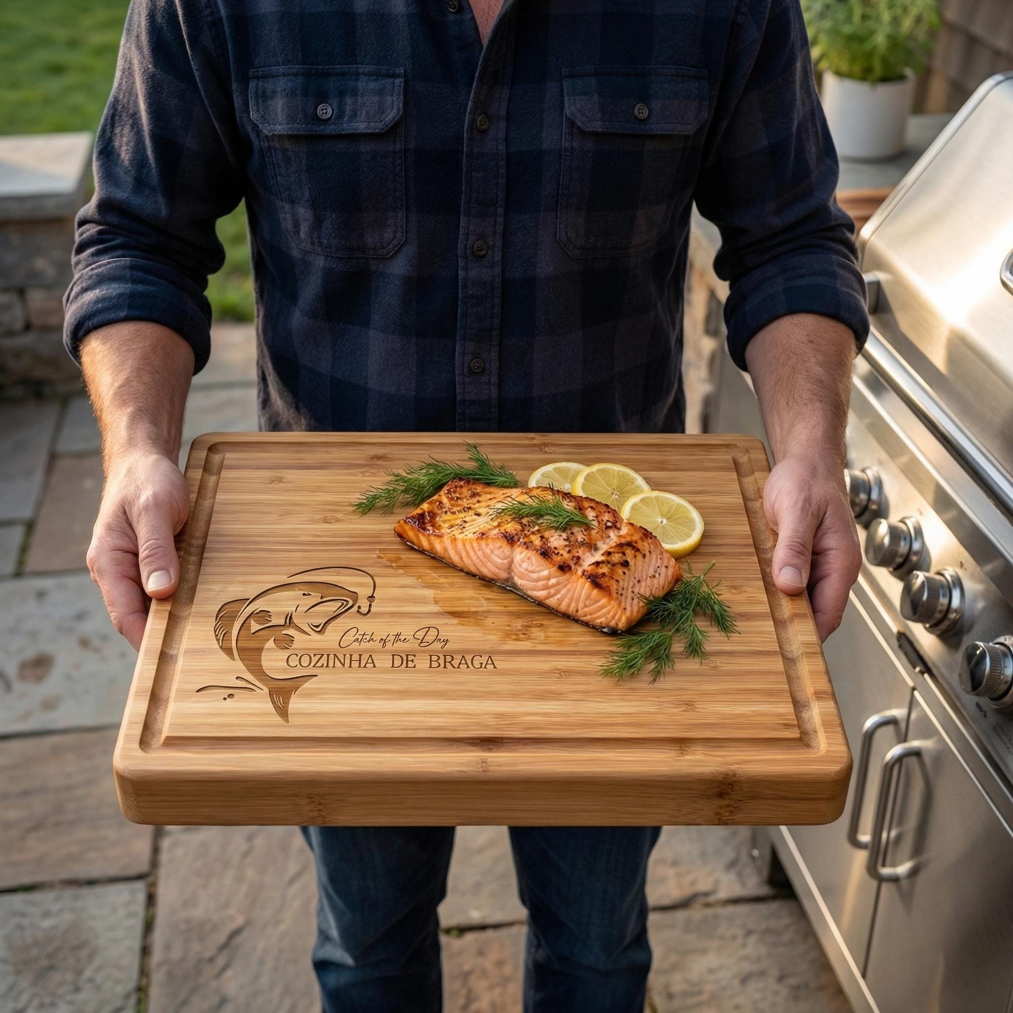 Celebrate his catch with this personalized 1-inch thick bamboo butcher block. Custom laser-engraved with names or a logo, this board is an ideal gift for Dad.
