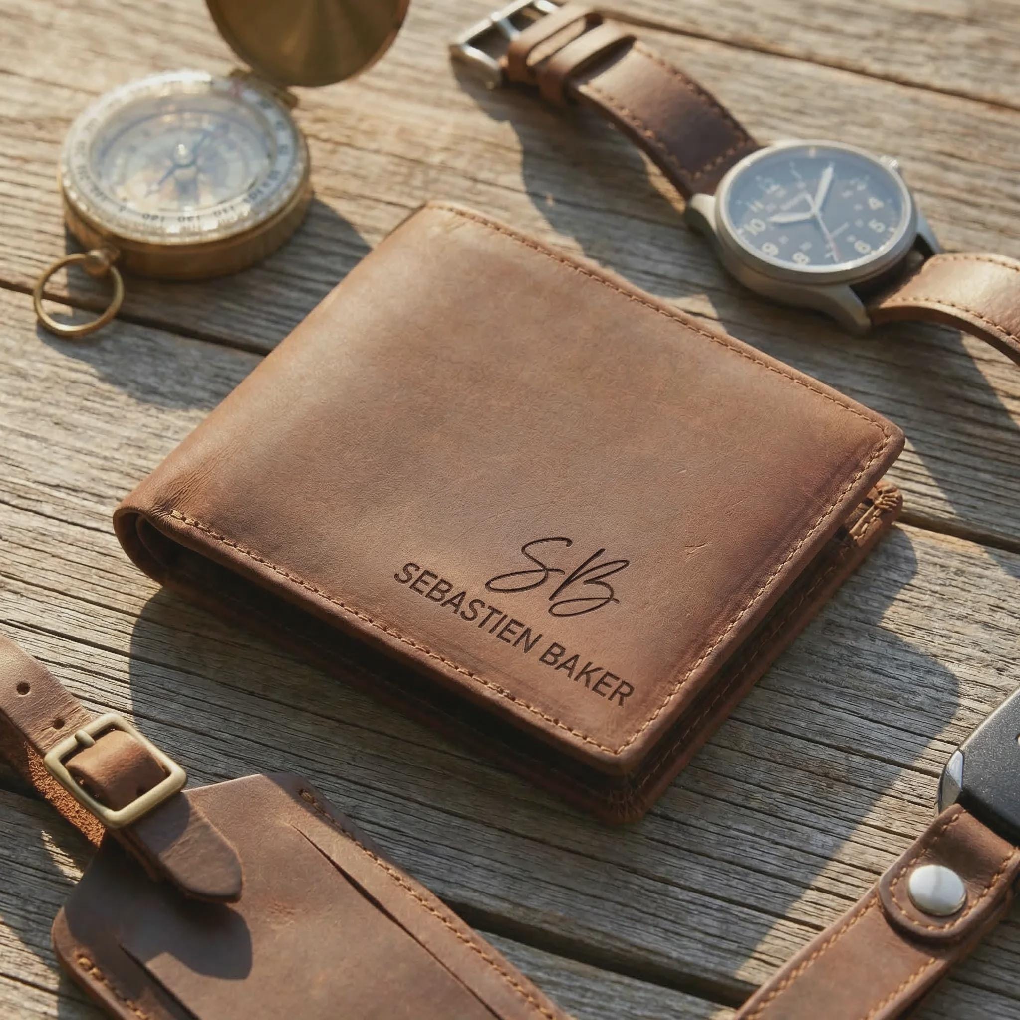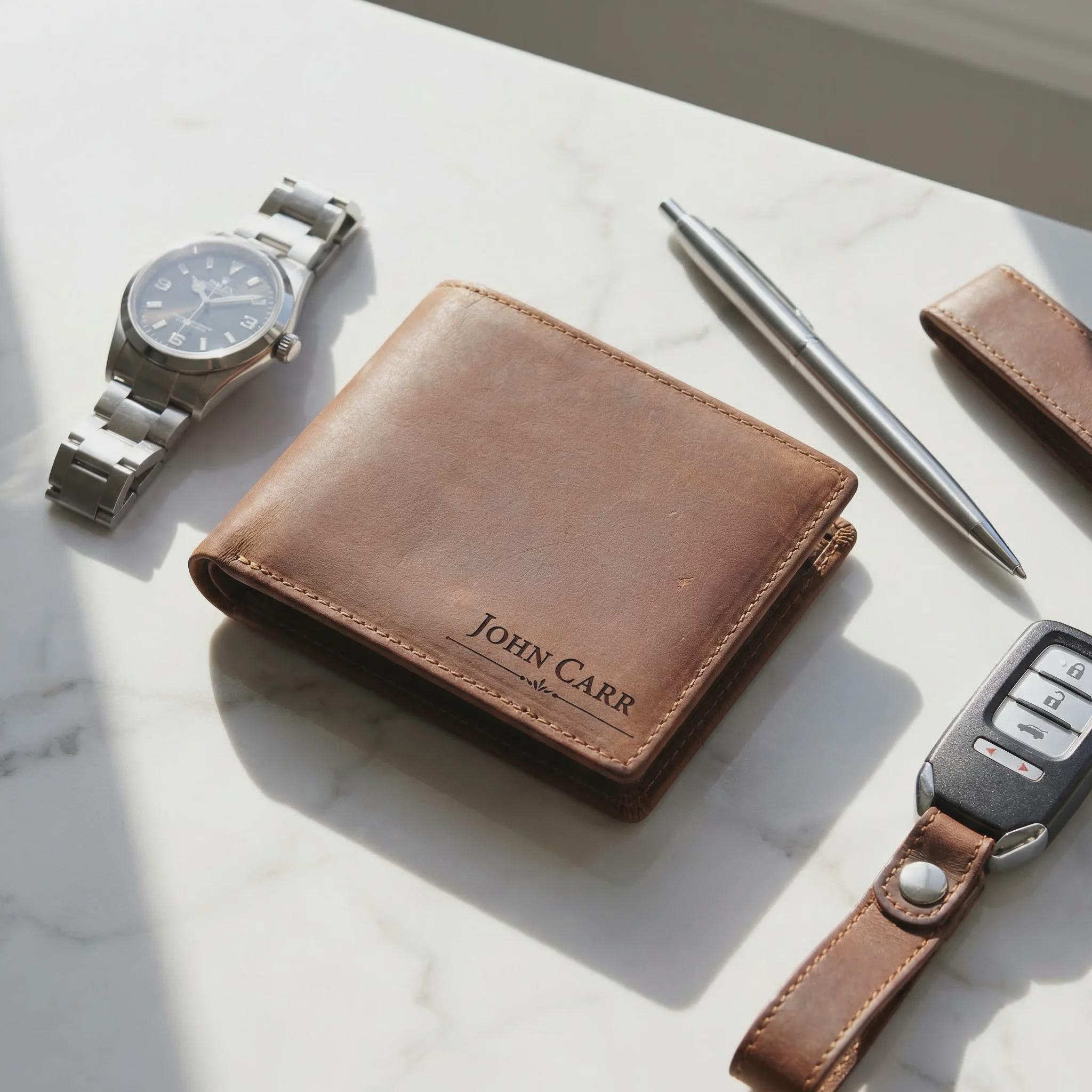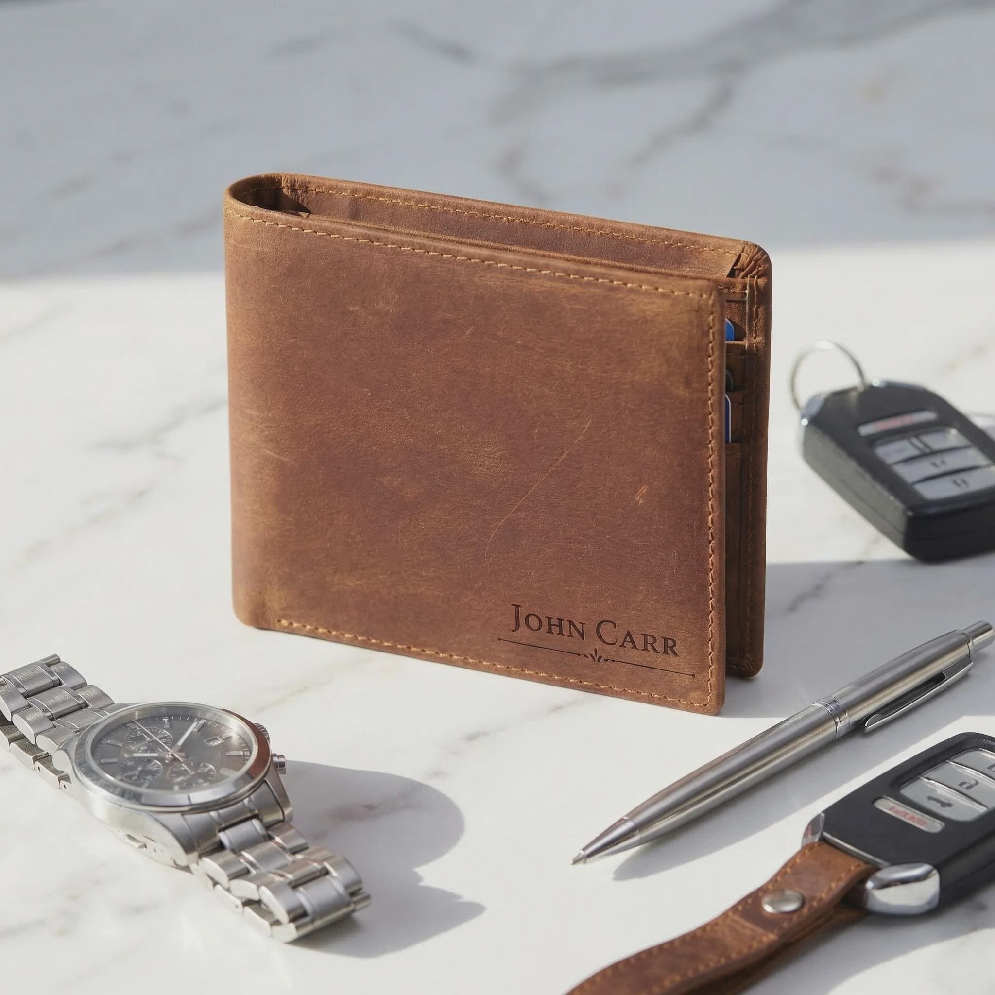 Elevate his daily carry with this personalized Crazy Horse leather bifold wallet. Sourced for its rugged durability and vintage aesthetic, this full-grain cowhide is treated with a specialized wax that creates a unique "distressed" finish. Precision laser engraved with your choice of 16 designs, it serves as a professional-grade accessory that only gets better with age.