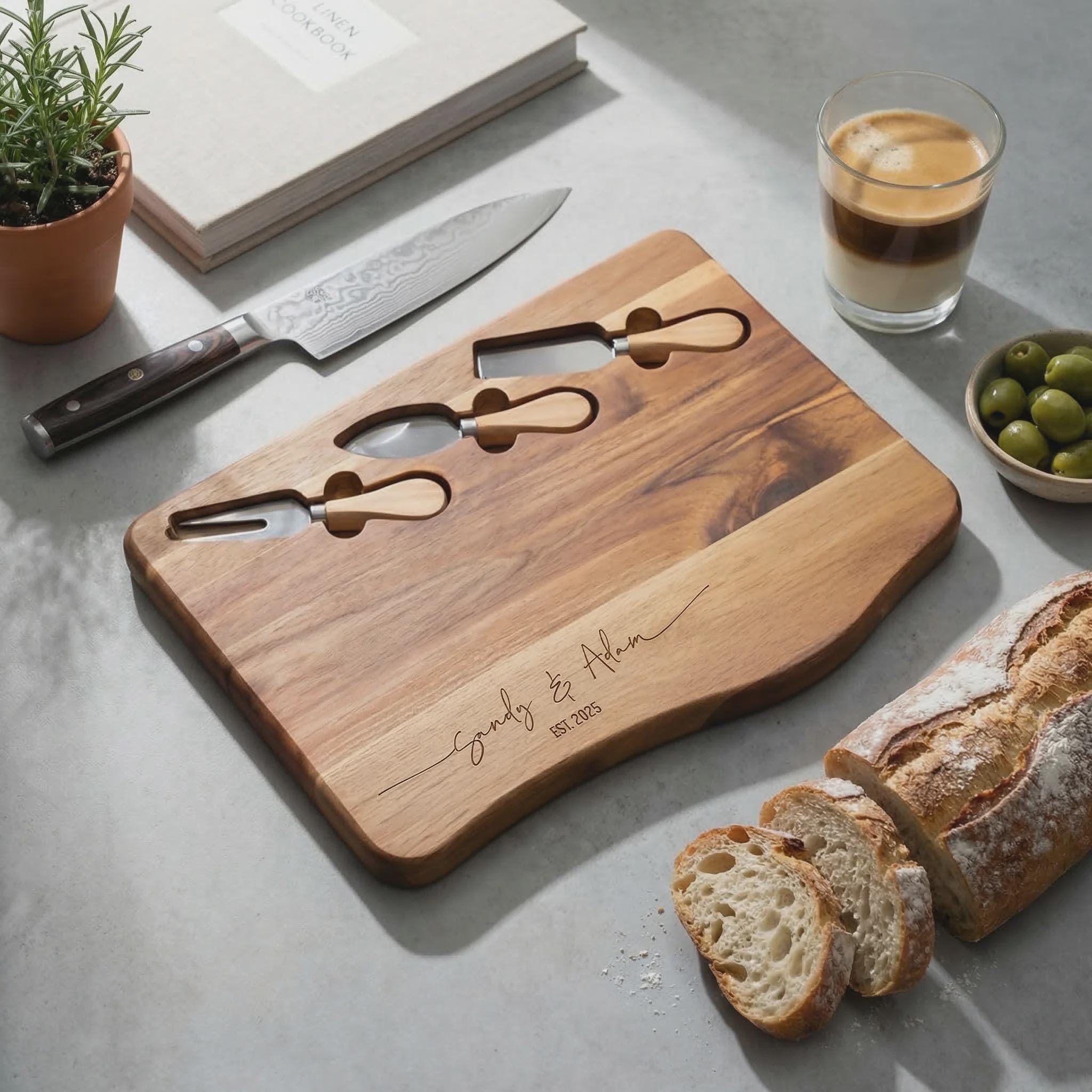 This personalized charcuterie board, crafted from durable acacia wood, measures 12.5 x 10 inches, providing ample space for delicious appetizers and cheeses. The unique shape adds a touch of sophistication to any table, while the included set of three cheese knives ensures effortless entertaining.