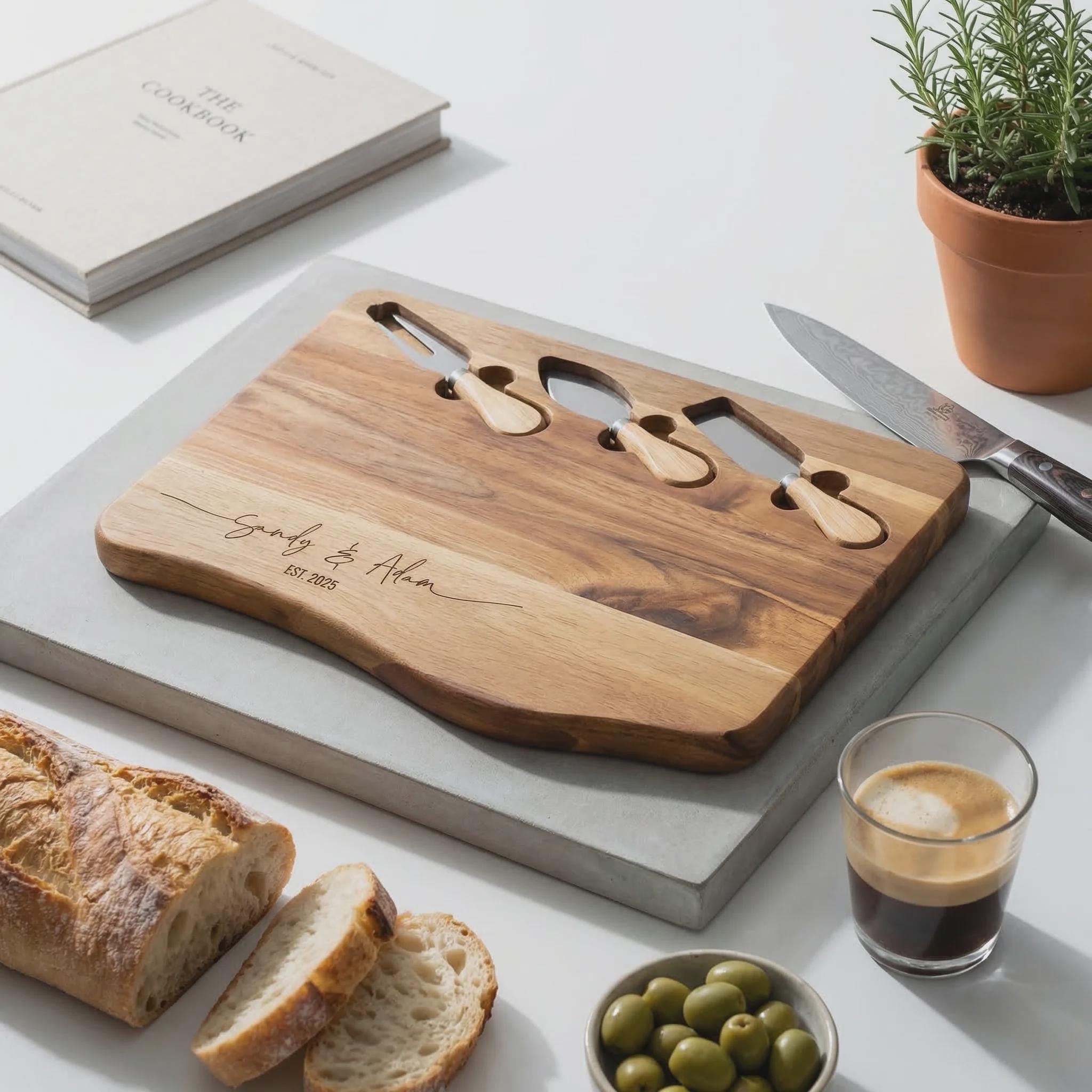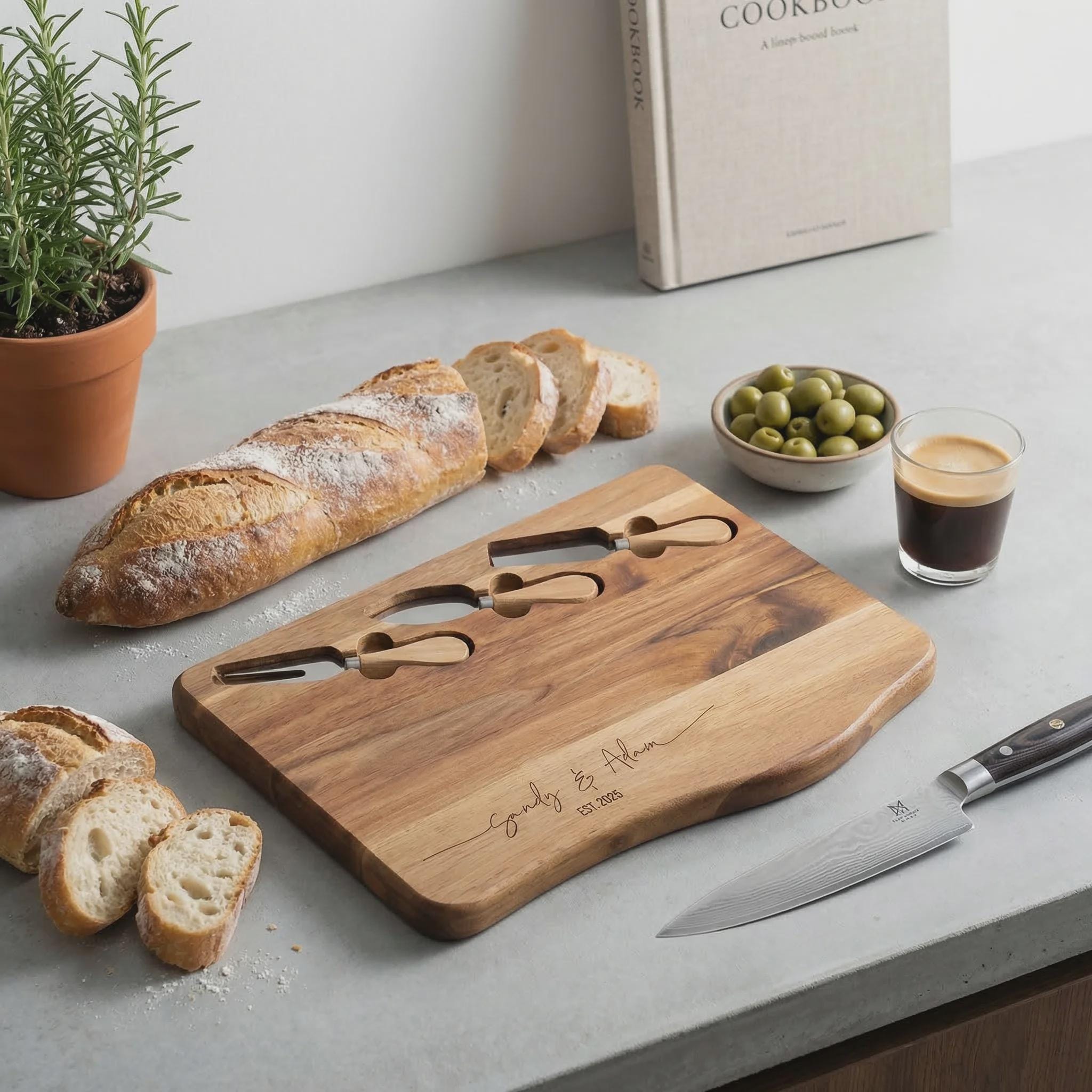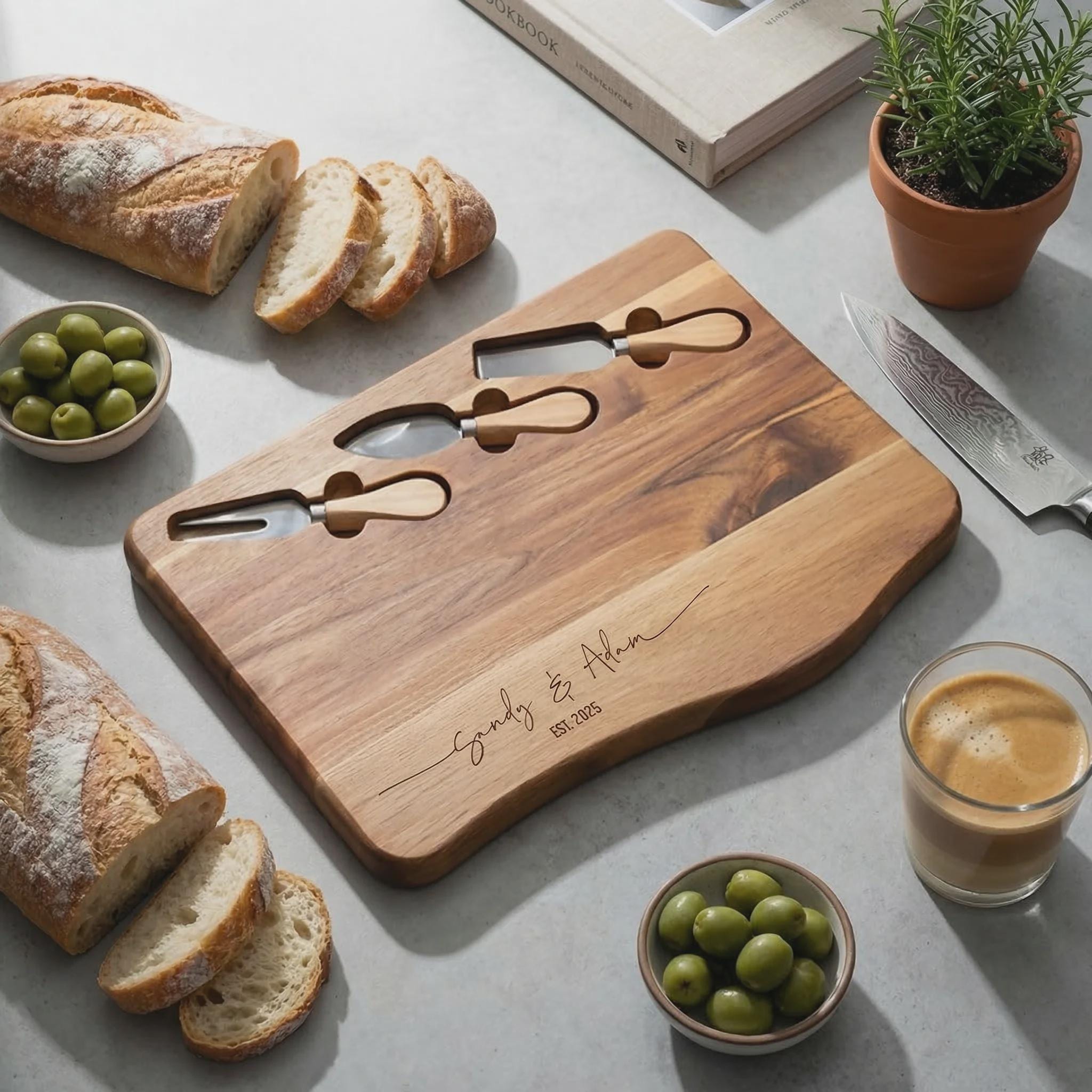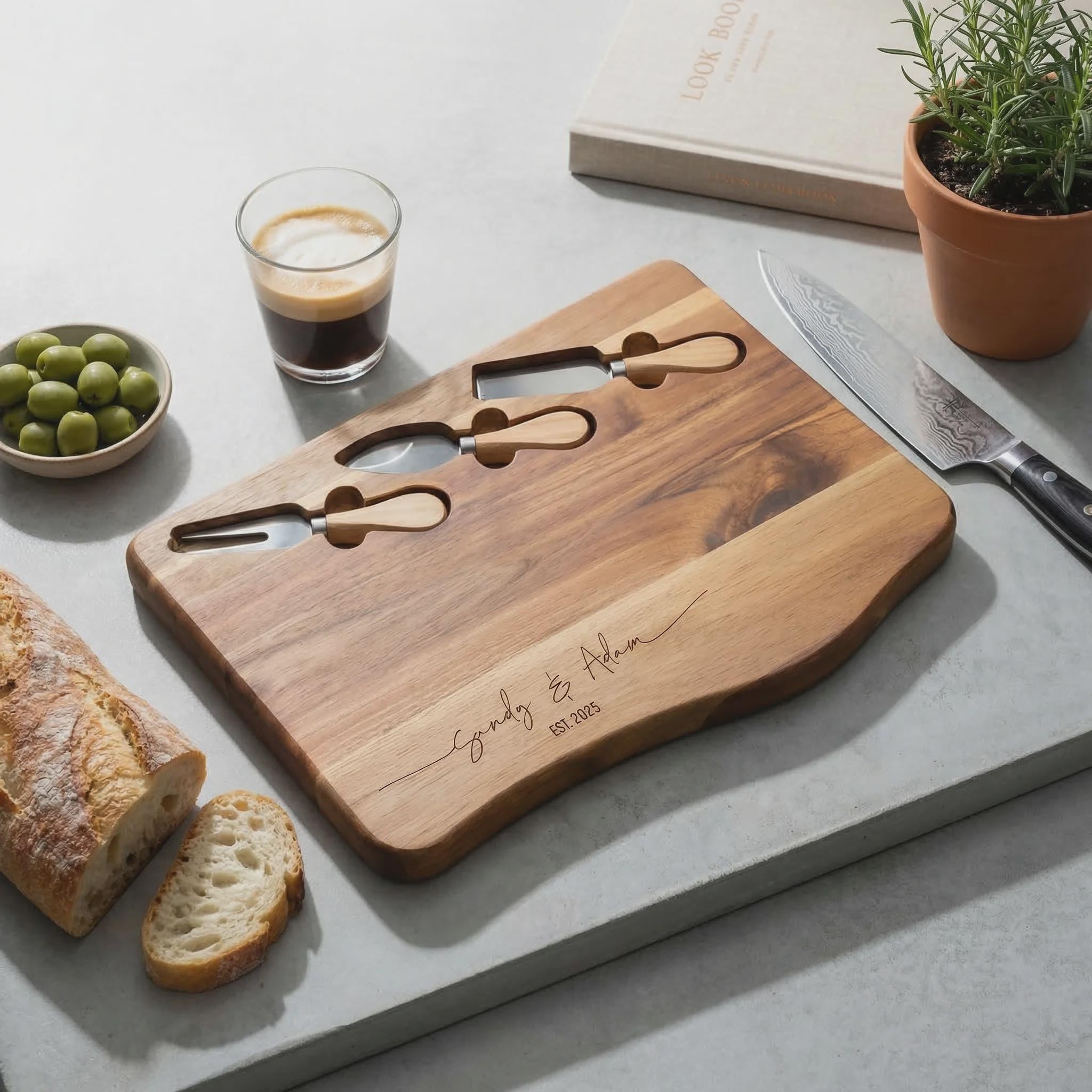 Personalized Acacia Charcuterie Board with Knife Set, Custom Engraved Wedding Gift for Couples