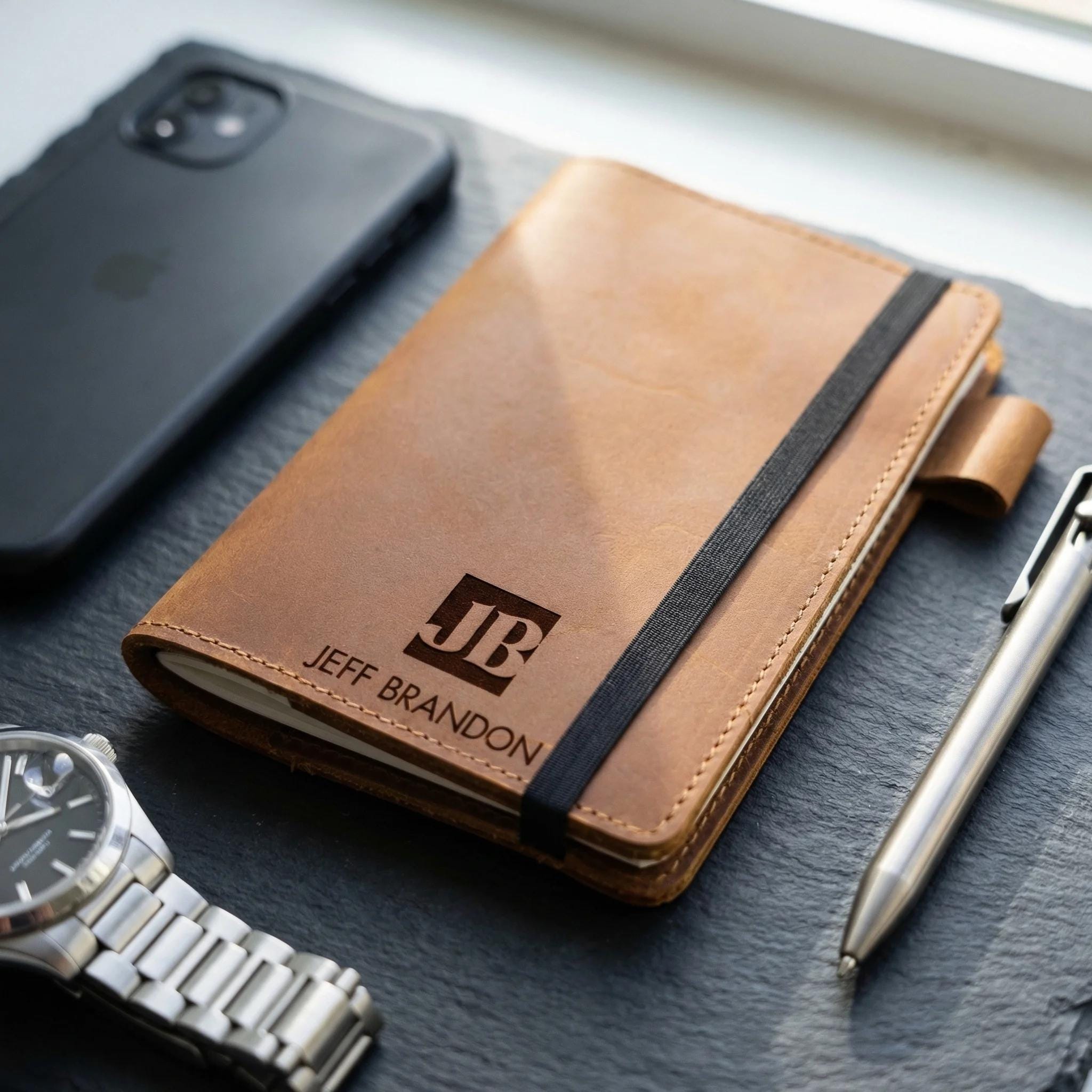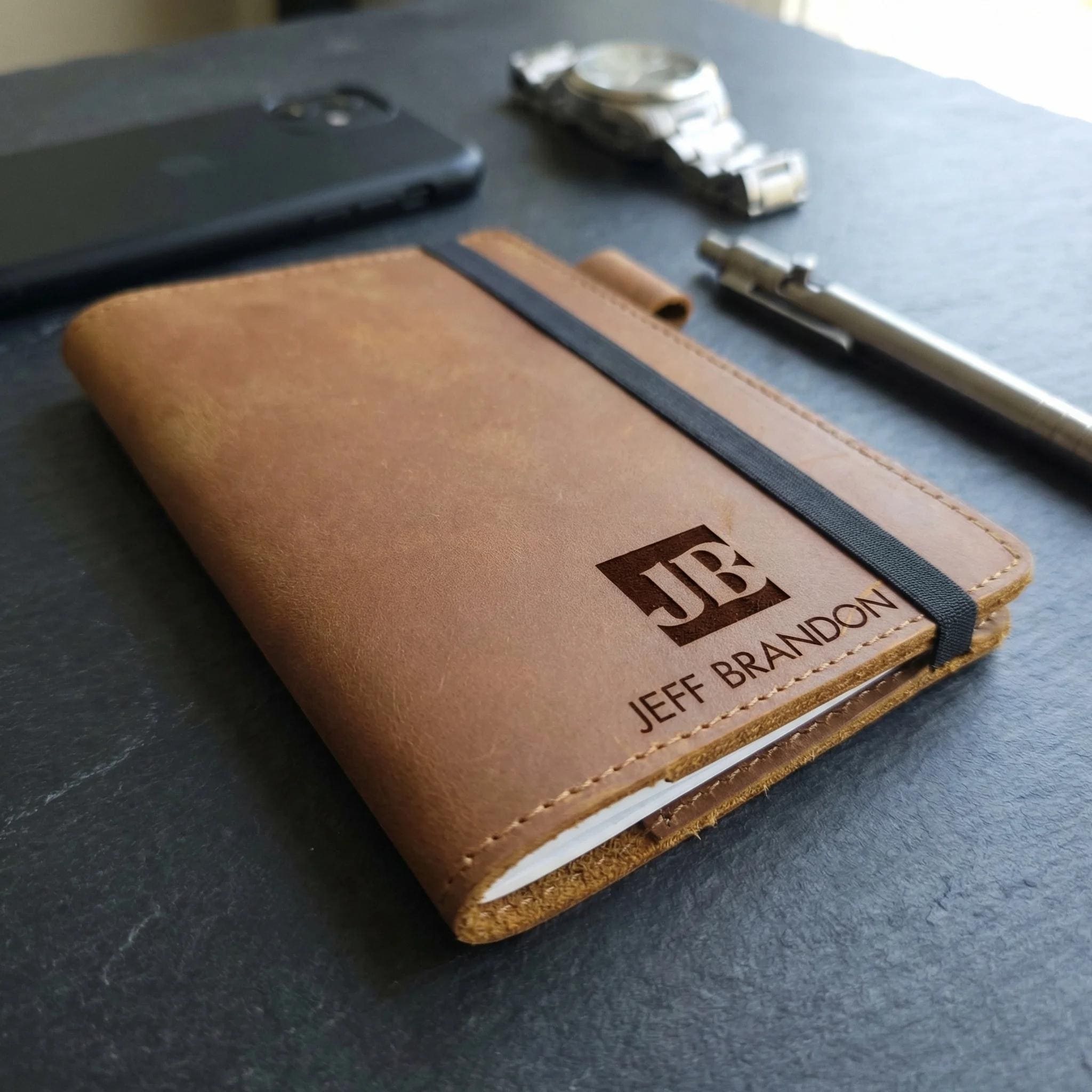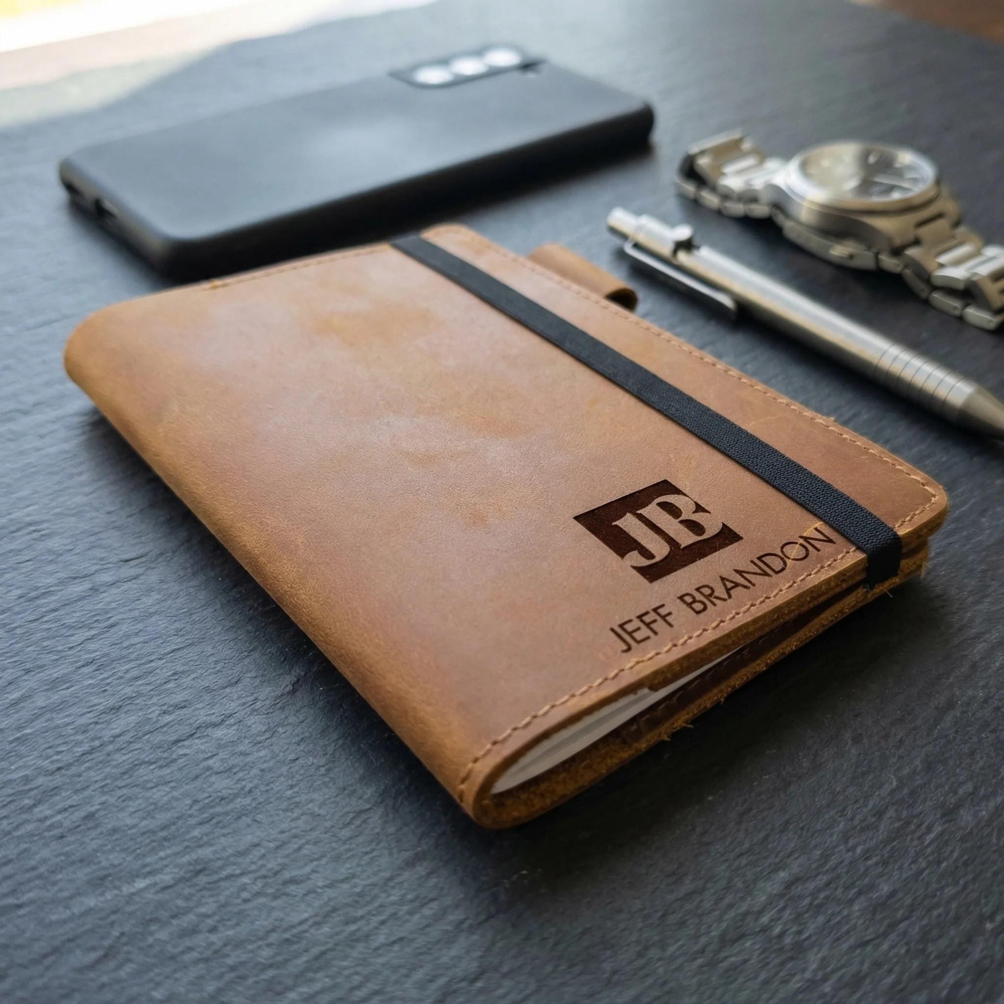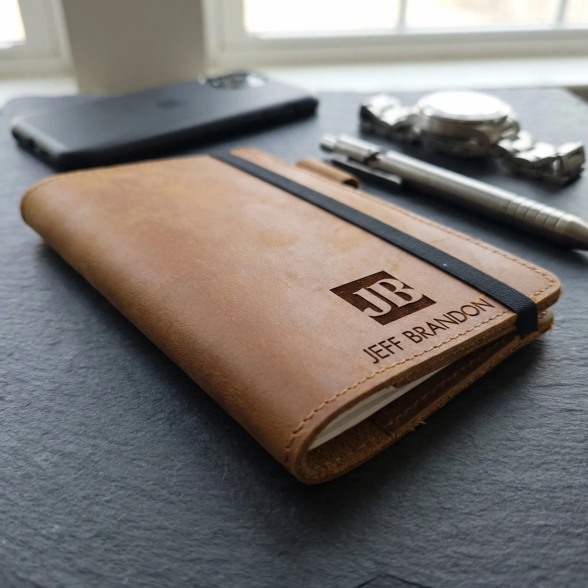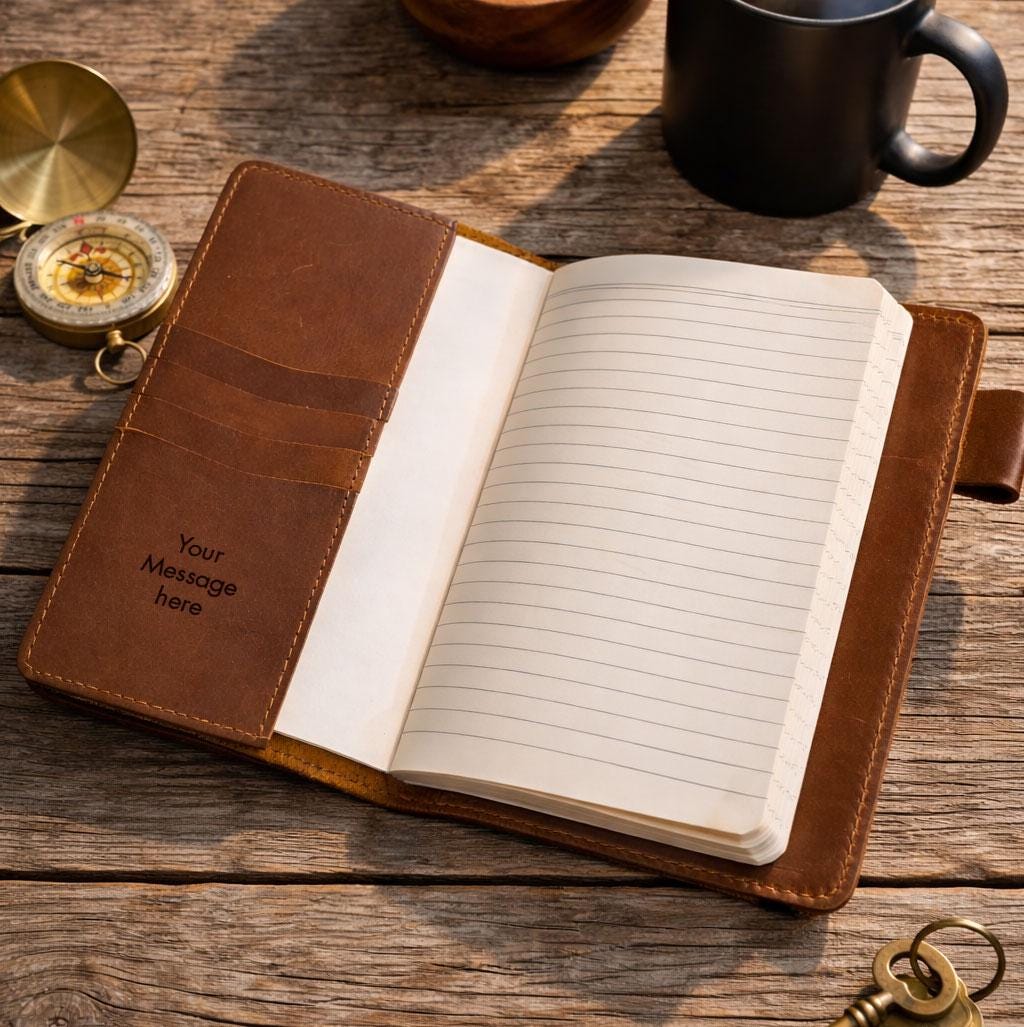 Elevate his daily carry with this personalized Crazy Horse leather travel journal. Hand-crafted from premium full-grain cowhide, this durable notebook is designed to protect your thoughts and cards for a lifetime. Featuring a secure black elastic closure and four internal card slots, it serves as a professional-grade field notes cover and a meaningful custom keepsake.