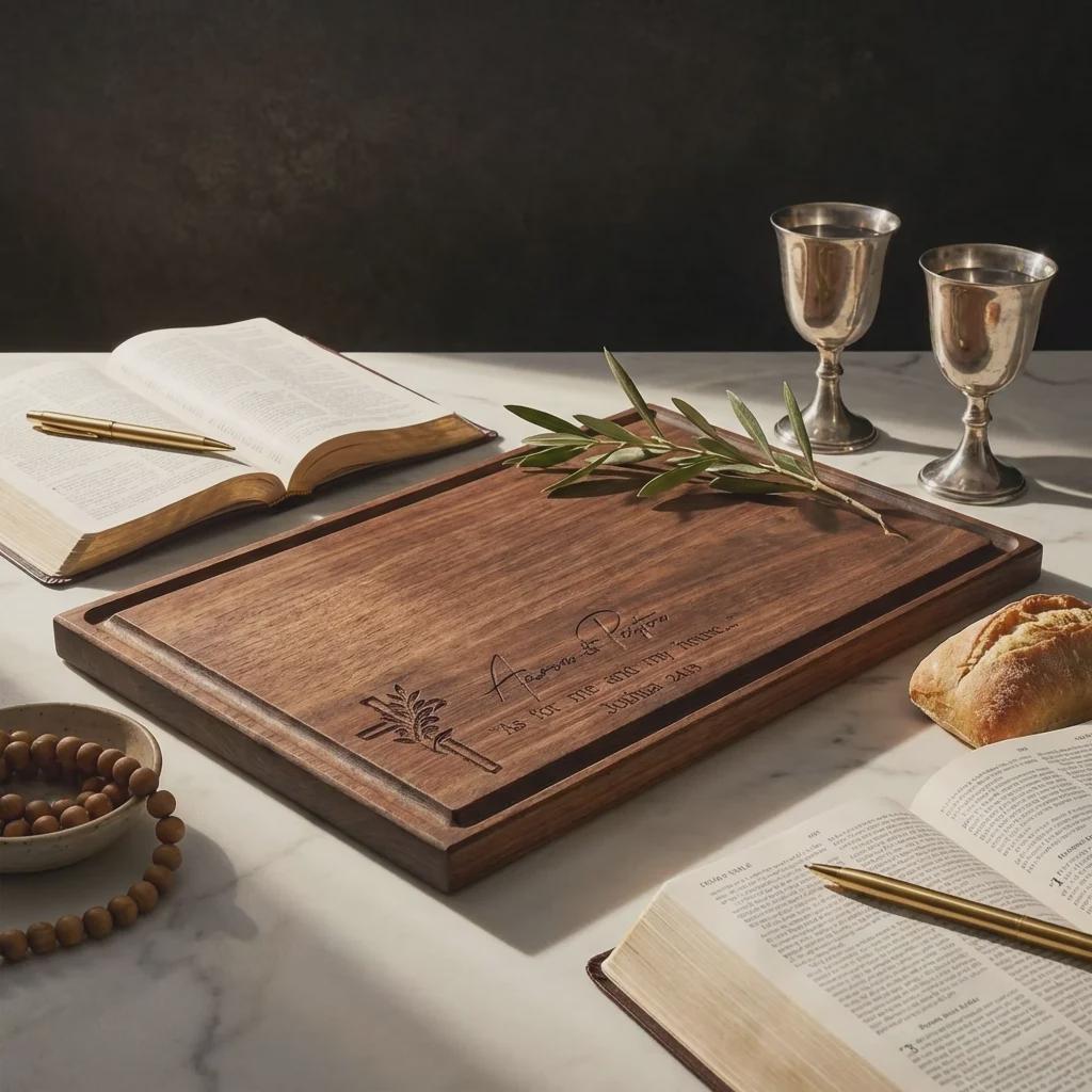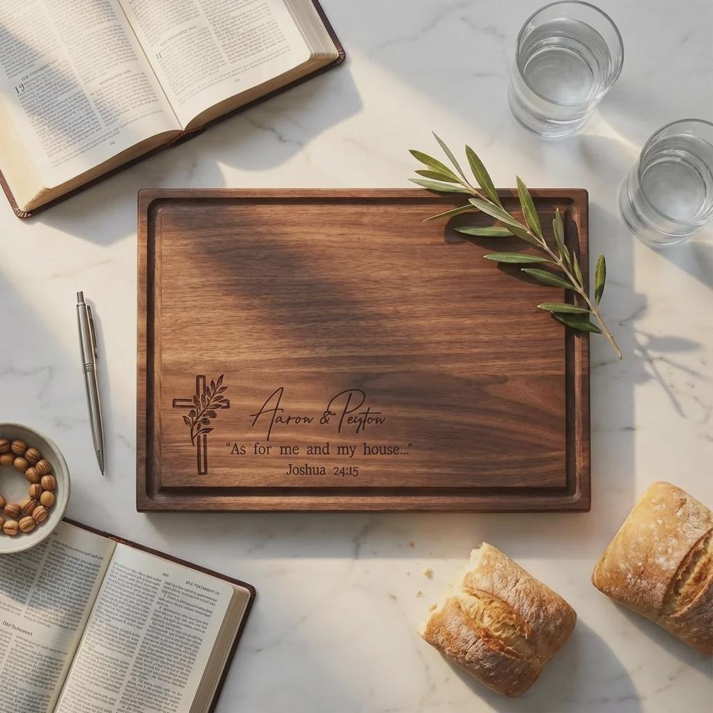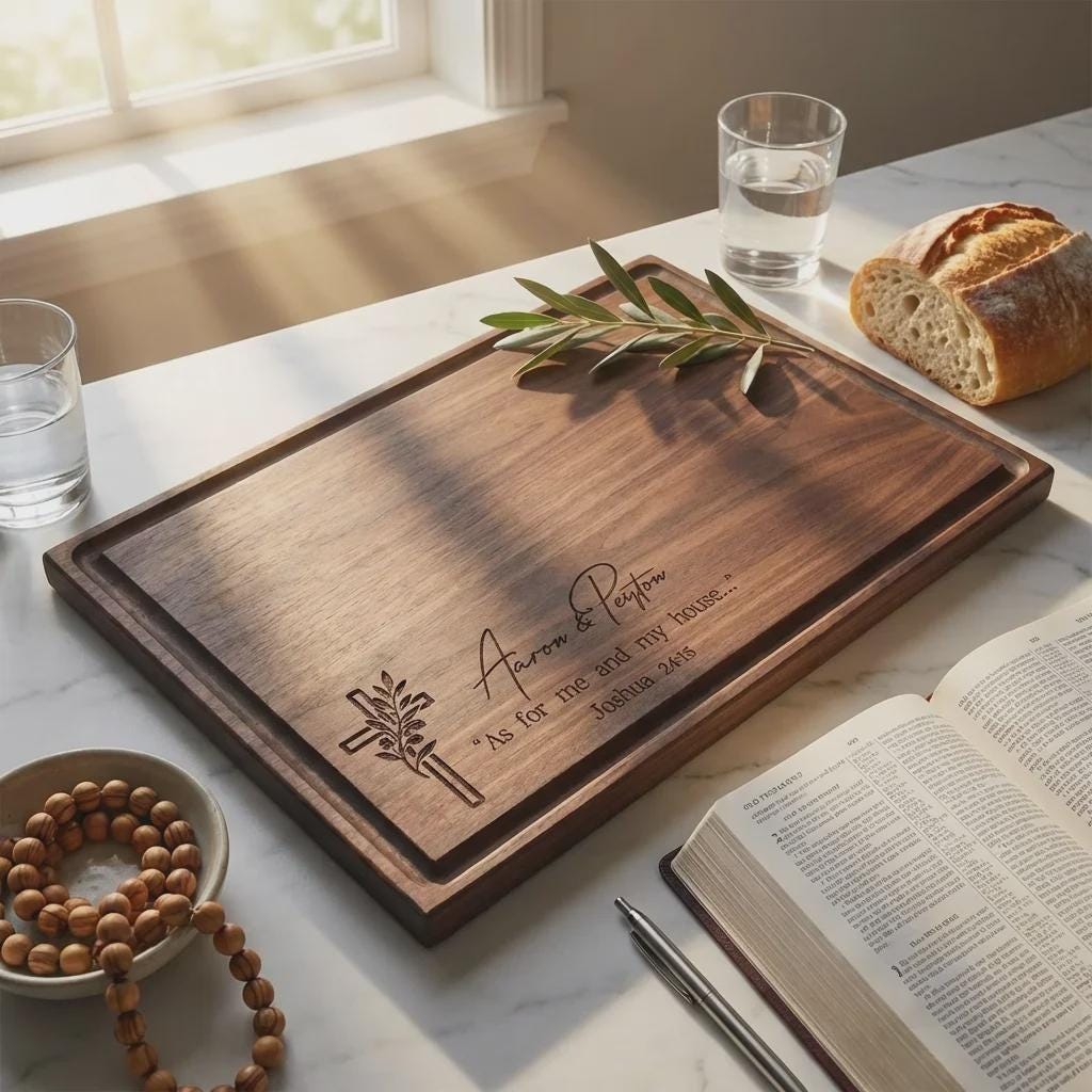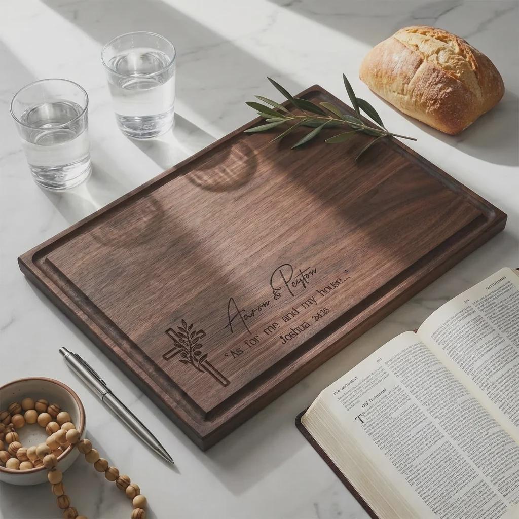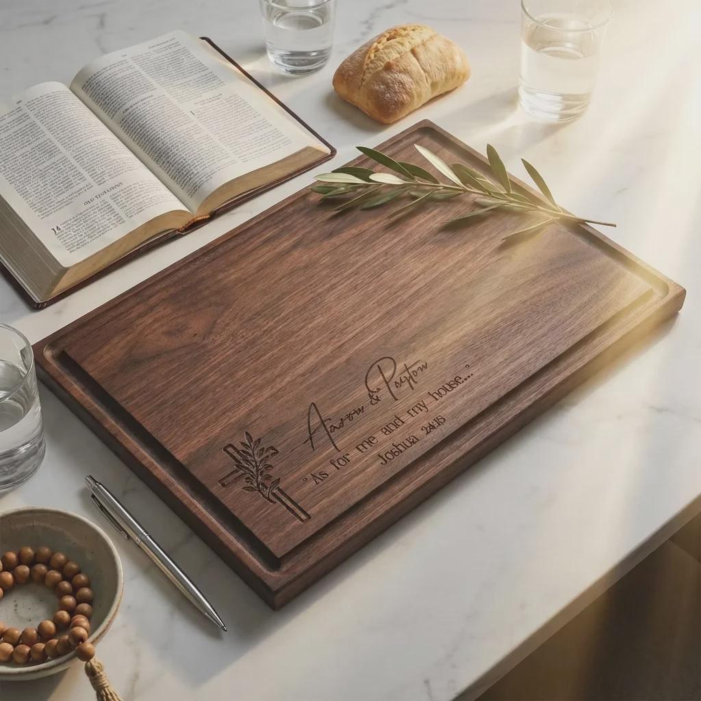 Elevate your kitchen with this personalized faith-themed walnut cutting board. Hand-crafted from premium solid North American walnut, each board is precision laser-engraved with the inspiring "As for me and my house" (Joshua 24:15) scripture, custom names, and any special date. Featuring a sleek profile and a functional juice groove, it serves as a professional-grade food prep surface and a sophisticated centerpiece for Christian homes.