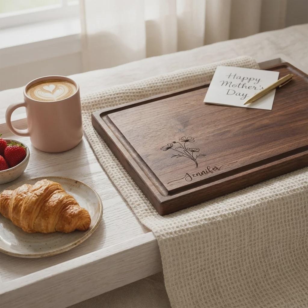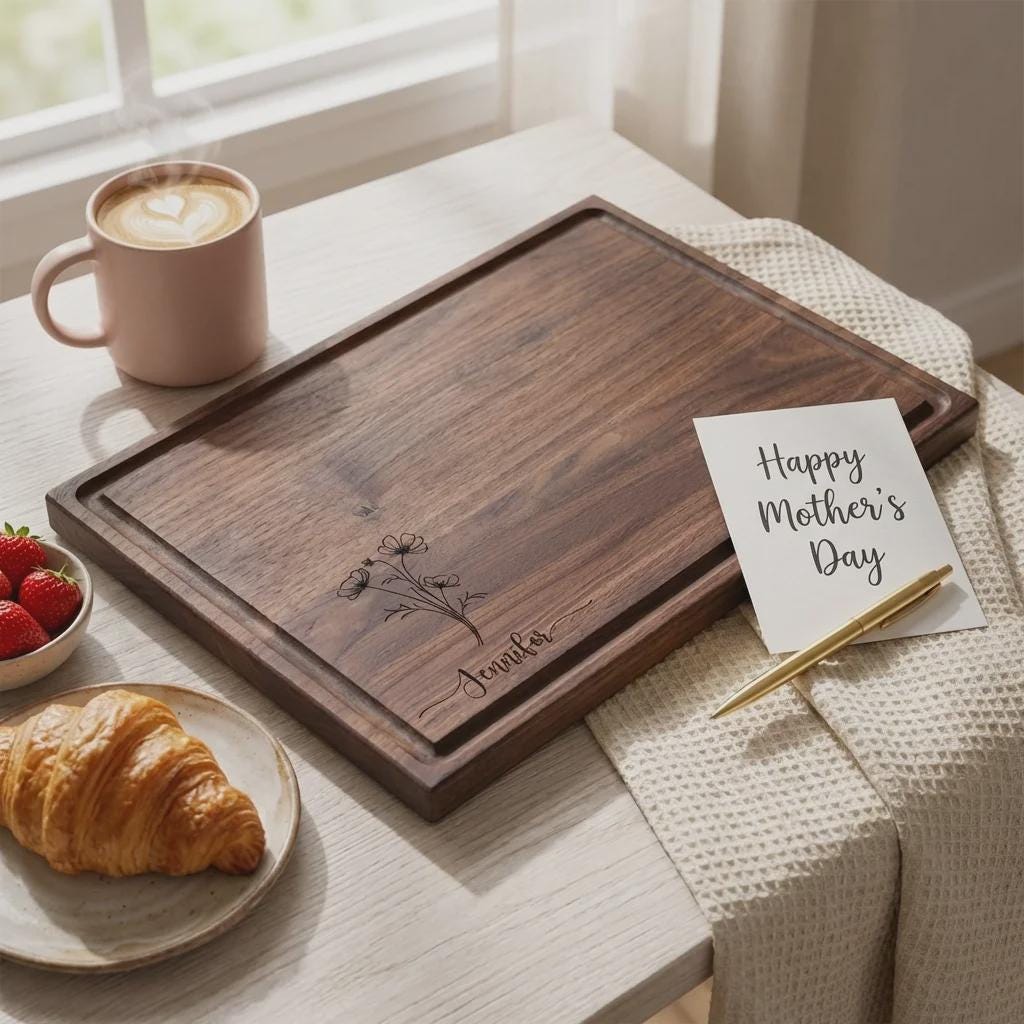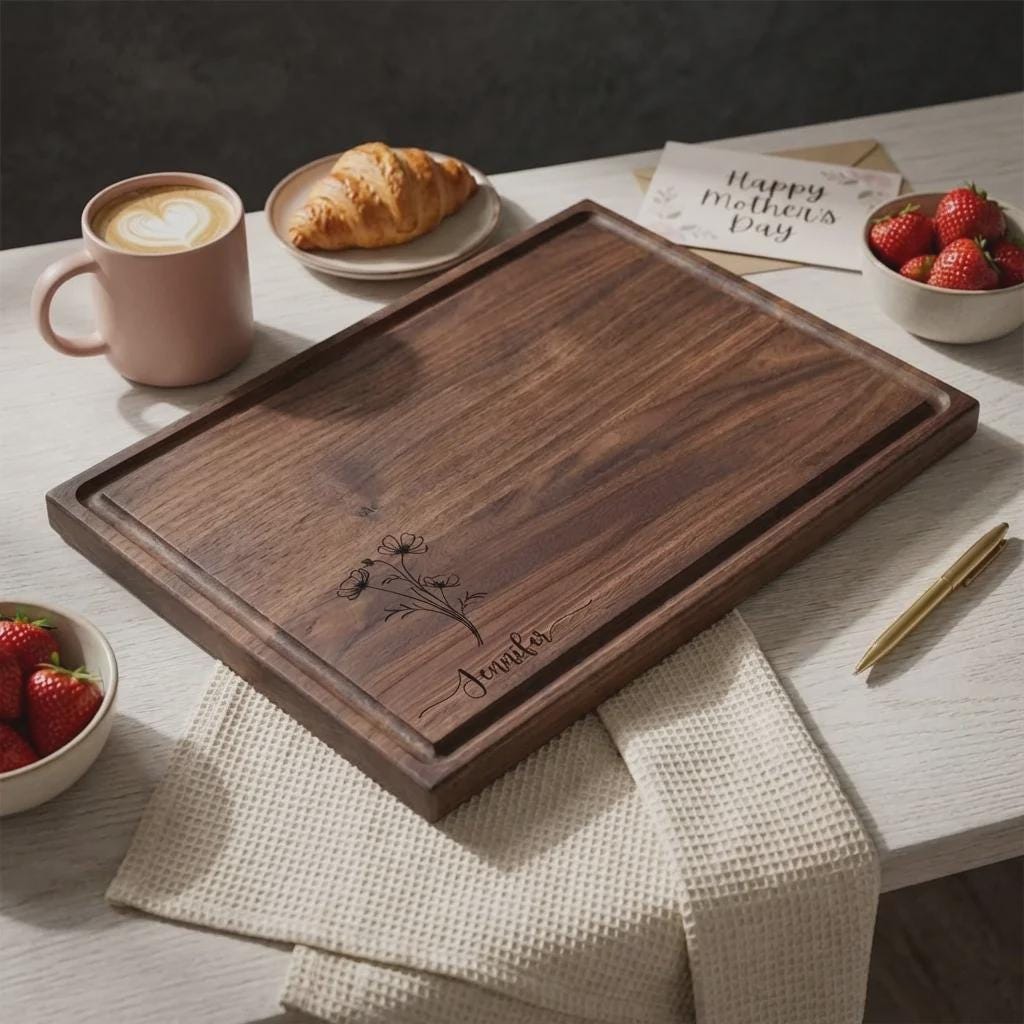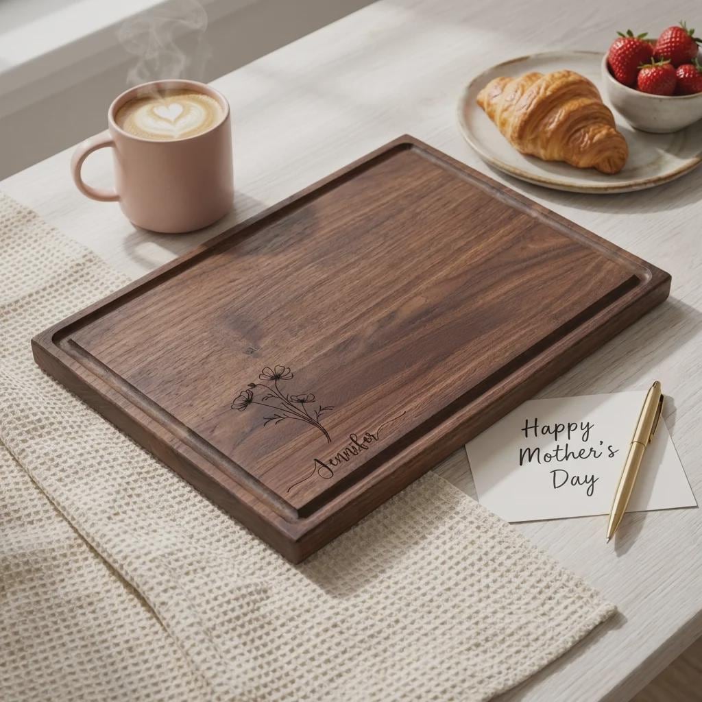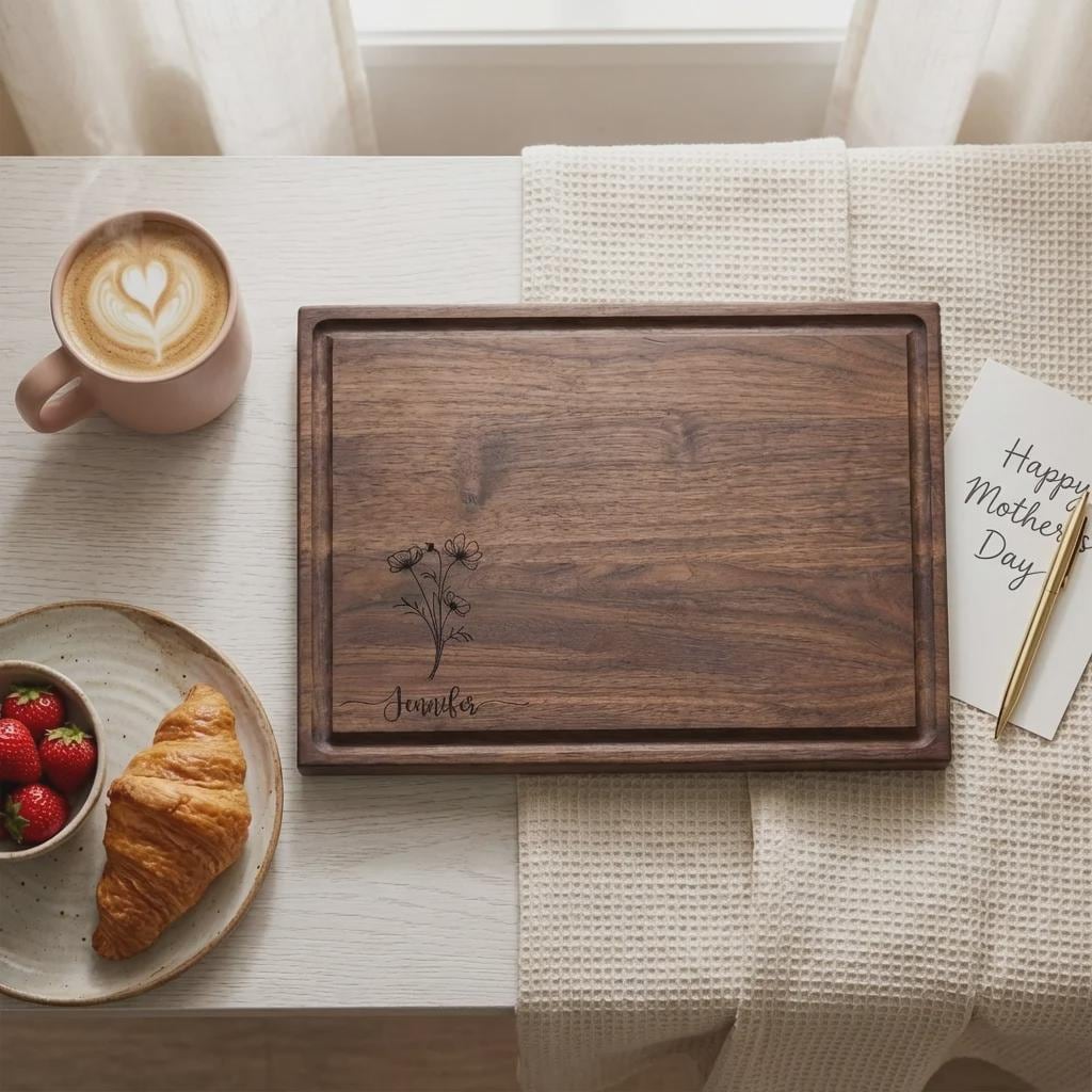Elevate her kitchen with this personalized wildflower walnut cutting board. Hand-crafted from premium solid North American hardwoods, each board is precision laser engraved with a delicate botanical bouquet and your custom name. Featuring a sleek profile and a functional juice groove, it serves as a professional-grade food prep surface and a sophisticated centerpiece for Mother's Day hosting or charcuterie display.