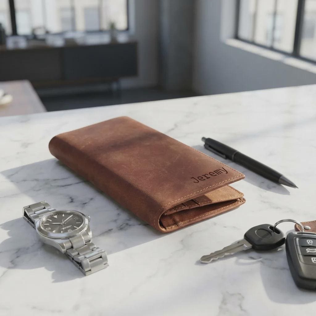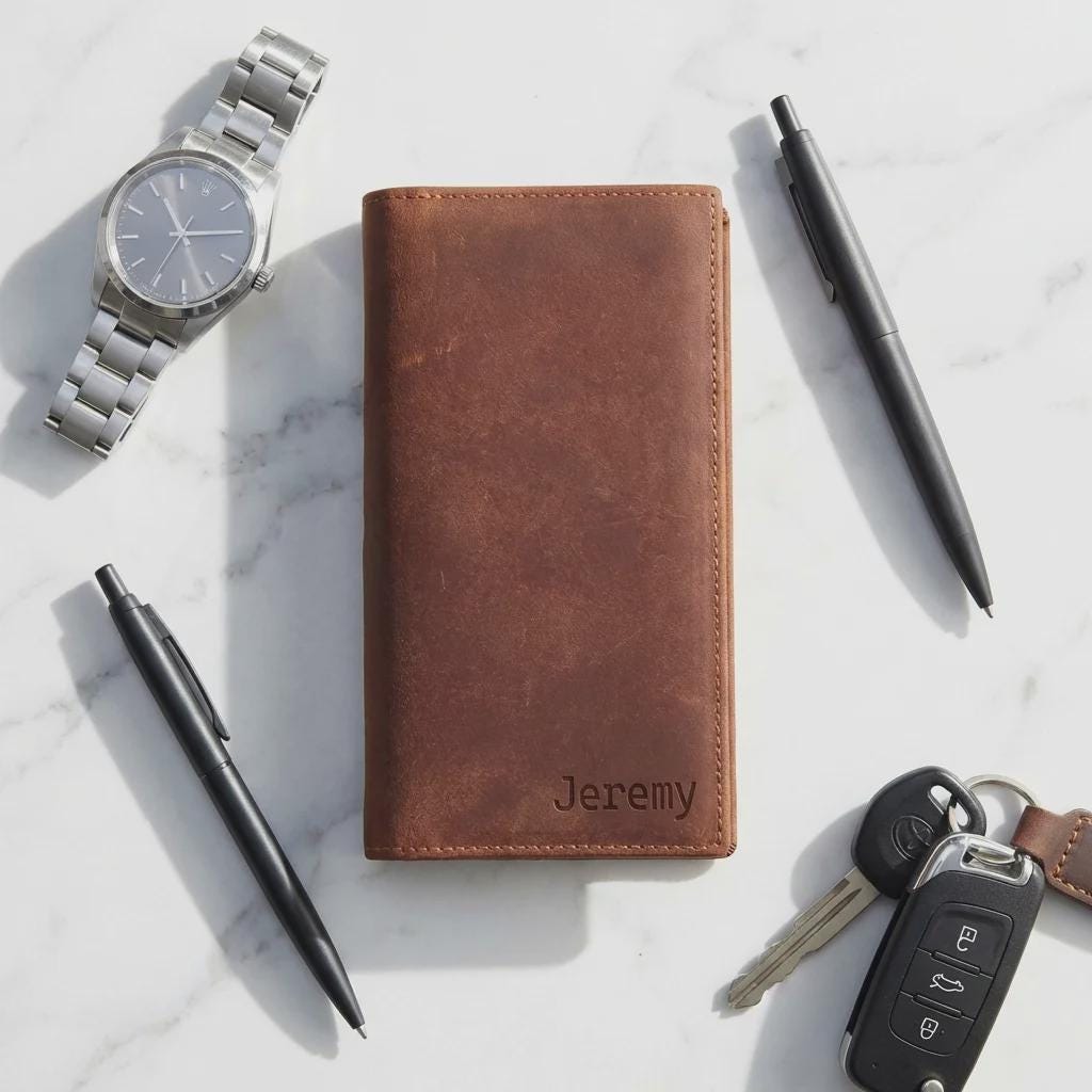 Elevate his organization with this personalized Crazy Horse leather long wallet. Hand-crafted from premium full-grain cowhide, this durable checkbook-style wallet is designed to carry a high volume of essentials while developing a rich, natural character. Featuring 11 card slots, a secure zipper compartment, and a dedicated ID window, it serves as a professional-grade travel organizer and a meaningful custom keepsake.
