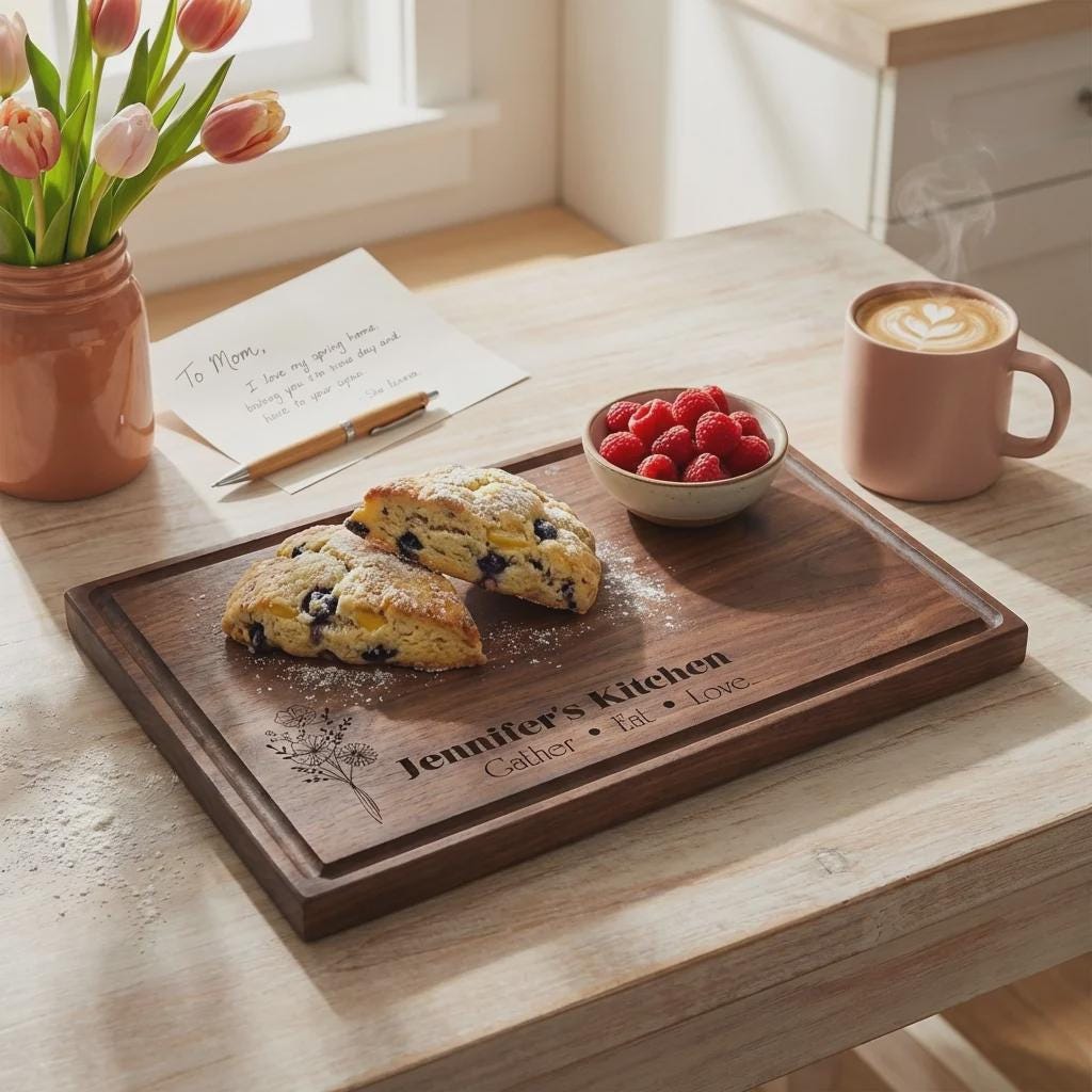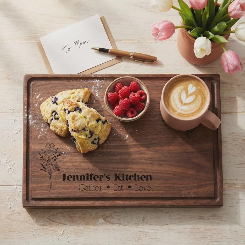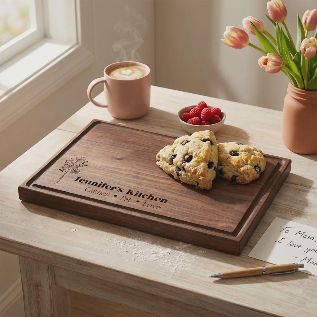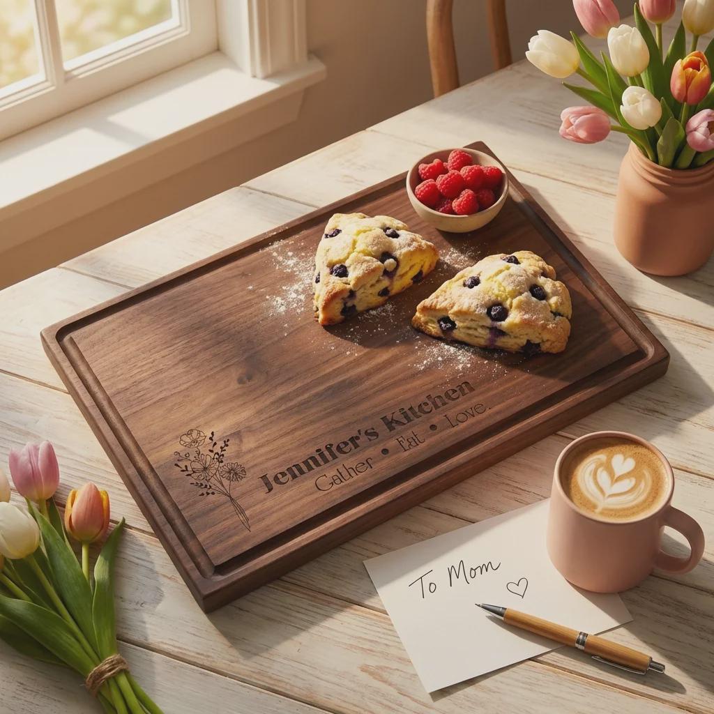 Elevate her kitchen with this personalized wildflower walnut cutting board. Hand-crafted from premium solid North American hardwoods, each board is precision laser engraved with a delicate botanical bouquet and your custom name. It serves as a professional-grade food prep surface and a sophisticated centerpiece for Mother's Day hosting or charcuterie display.