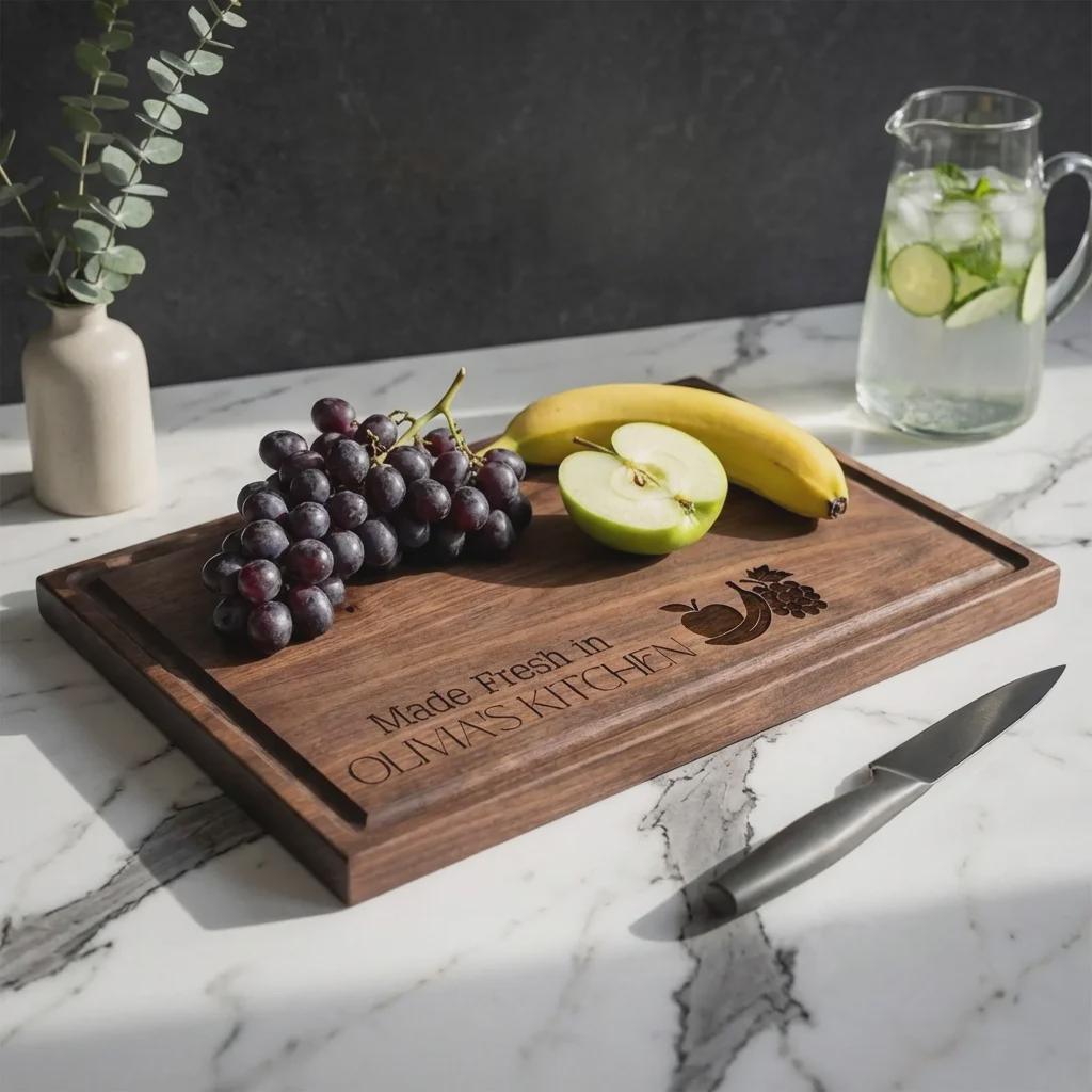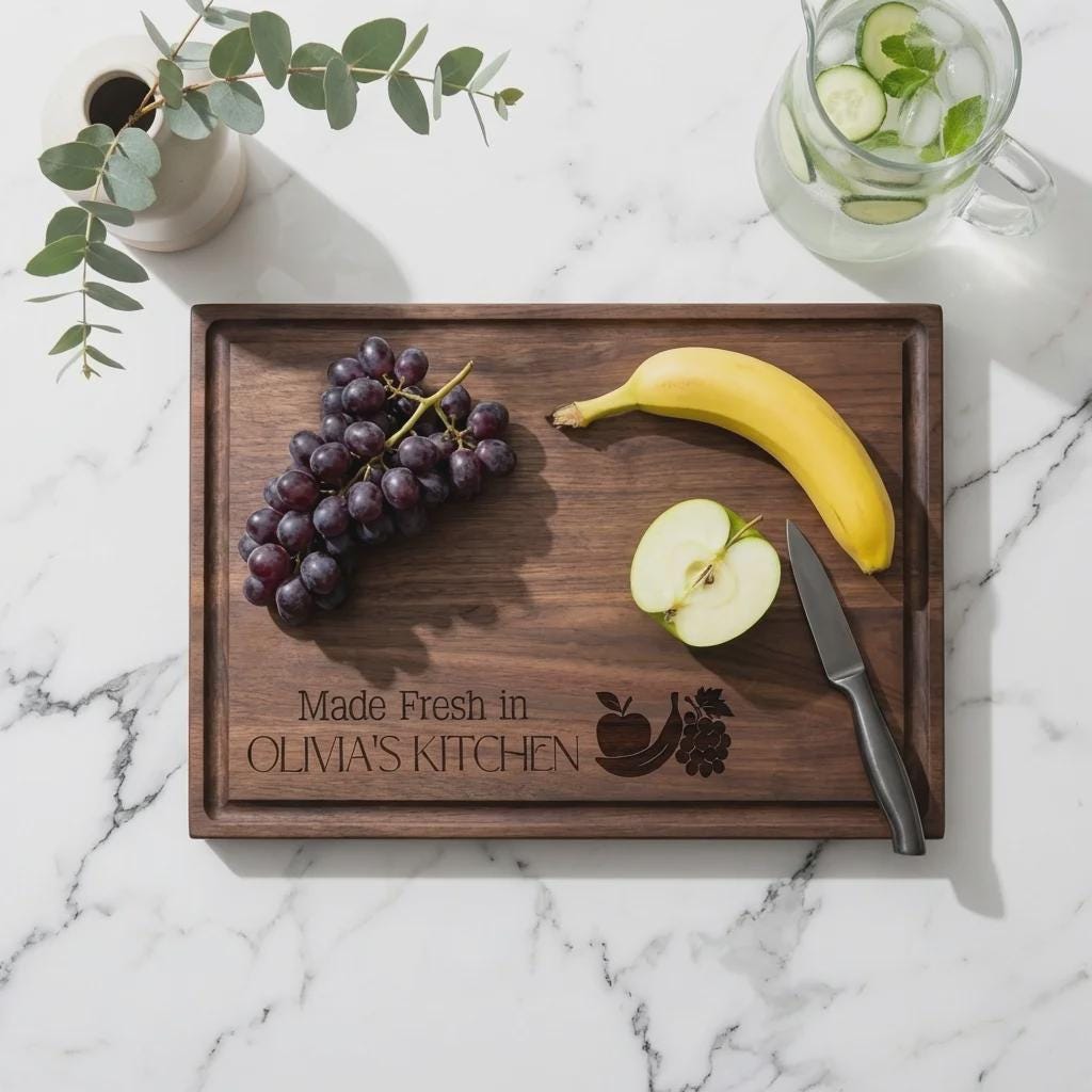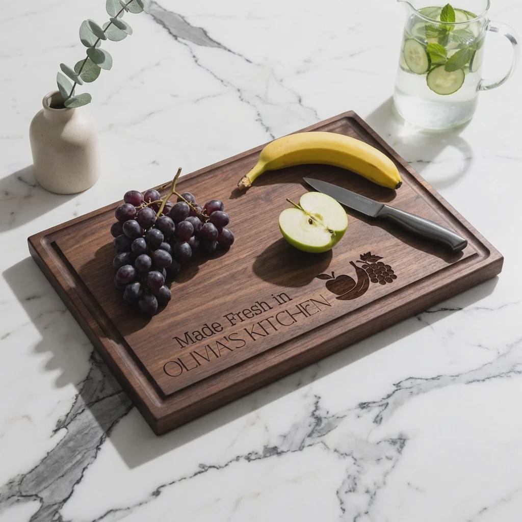 Elevate her kitchen with this personalized "Made Fresh" walnut cutting board. Hand-crafted from premium solid North American walnut, each board is precision laser-engraved with a custom name and a vibrant fruit motif featuring an apple, banana, and grapes. With a sleek profile and a functional juice groove, it serves as a professional-grade food prep surface and a sophisticated centerpiece for Mother's Day hosting or charcuterie display.