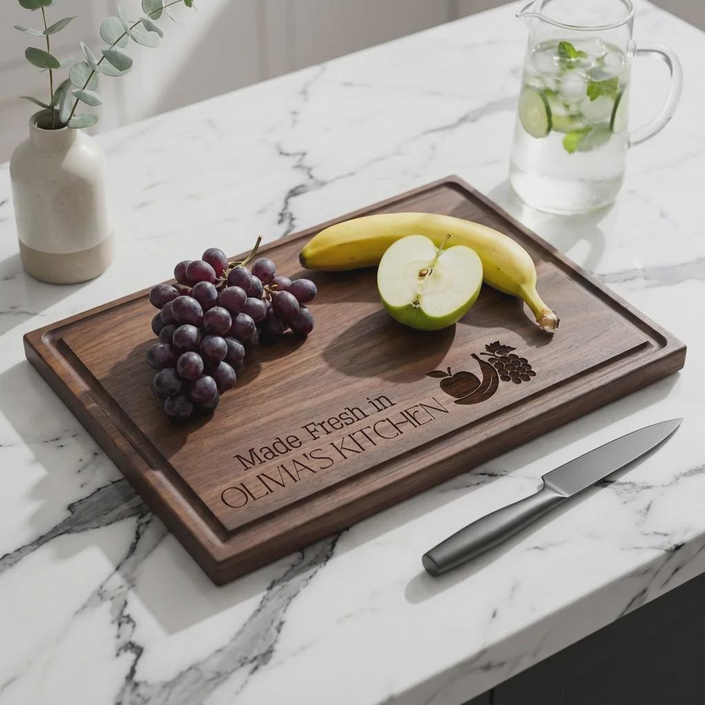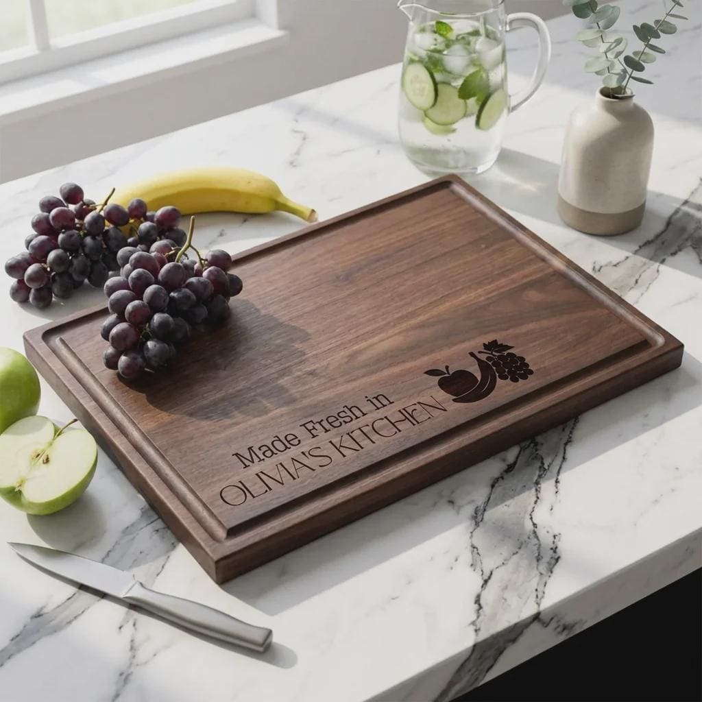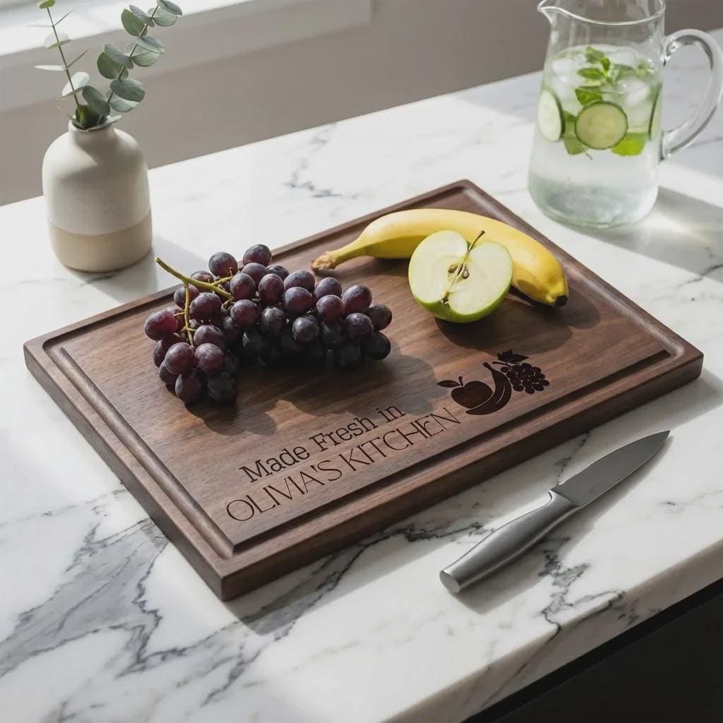 Elevate her kitchen with this personalized "Made Fresh" walnut cutting board. Hand-crafted from premium solid North American walnut, each board is precision laser-engraved with a custom name and a vibrant fruit motif featuring an apple, banana, and grapes. With a sleek profile and a functional juice groove, it serves as a professional-grade food prep surface and a sophisticated centerpiece for Mother's Day hosting or charcuterie display.
