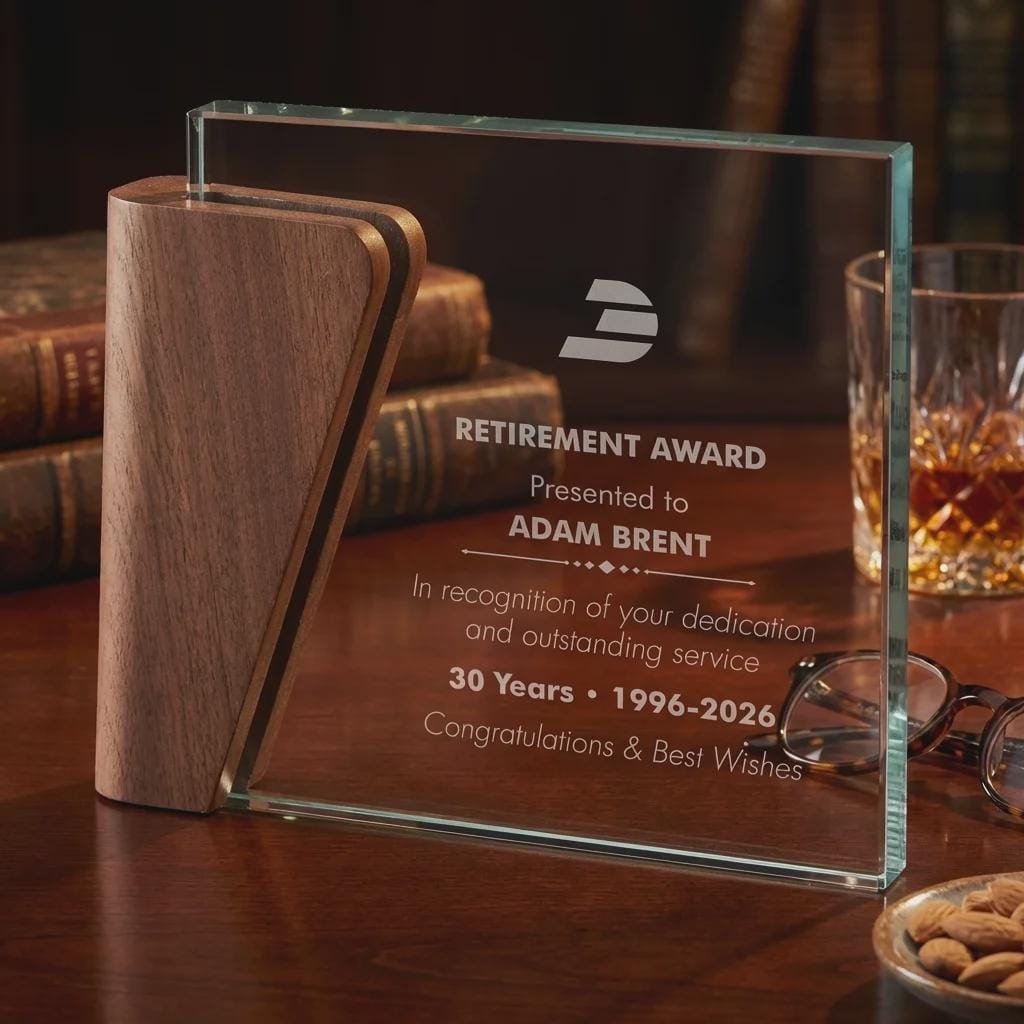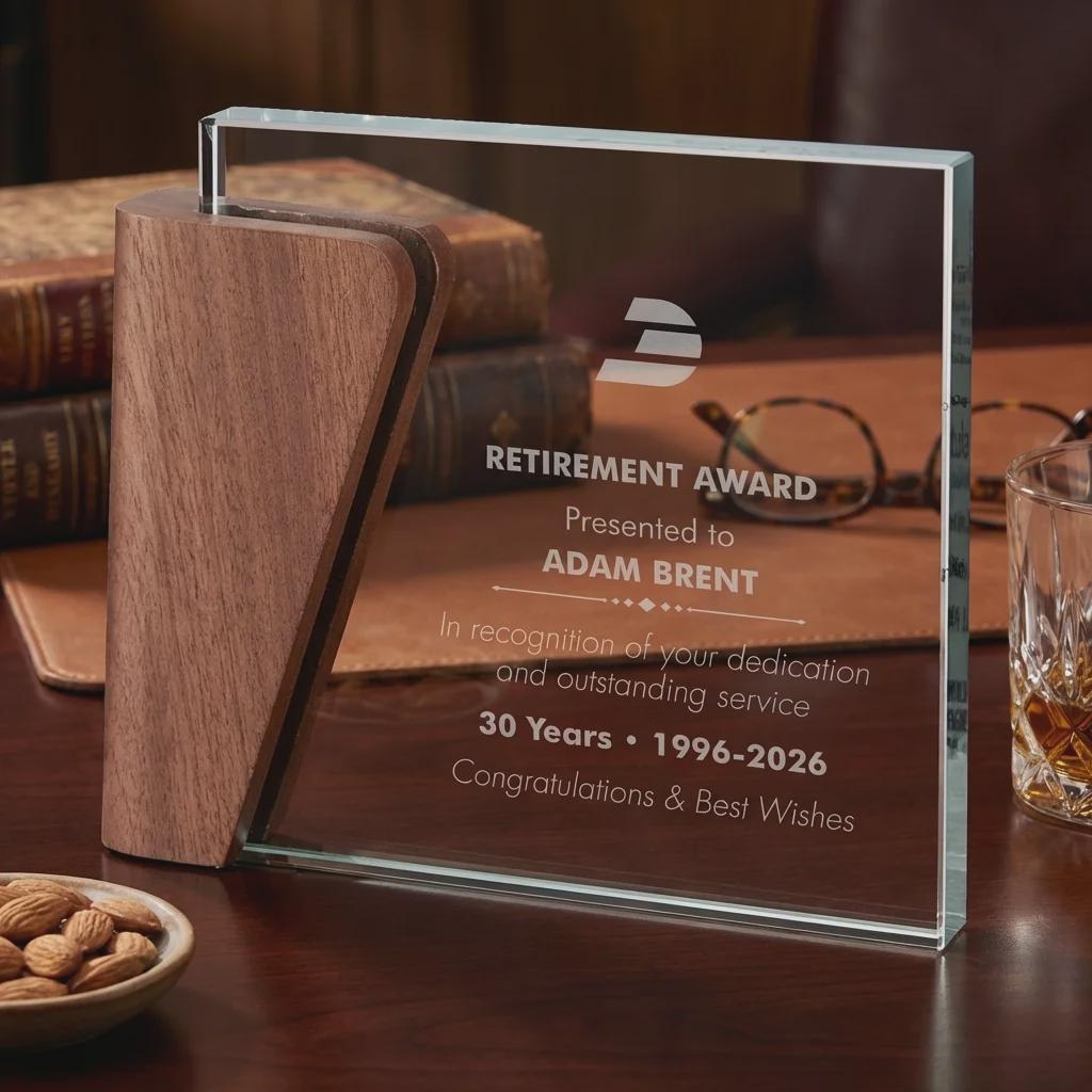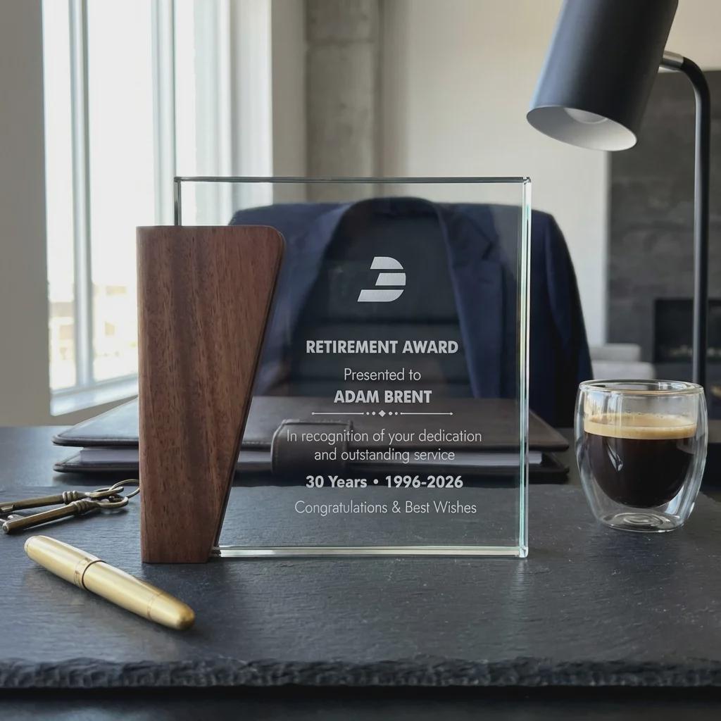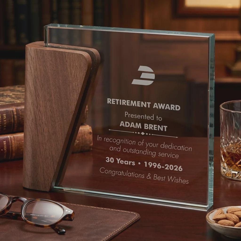 Personalized Retirement Award, Custom Crystal Glass and Wood Employee Appreciation Trophy, 7x6 inch