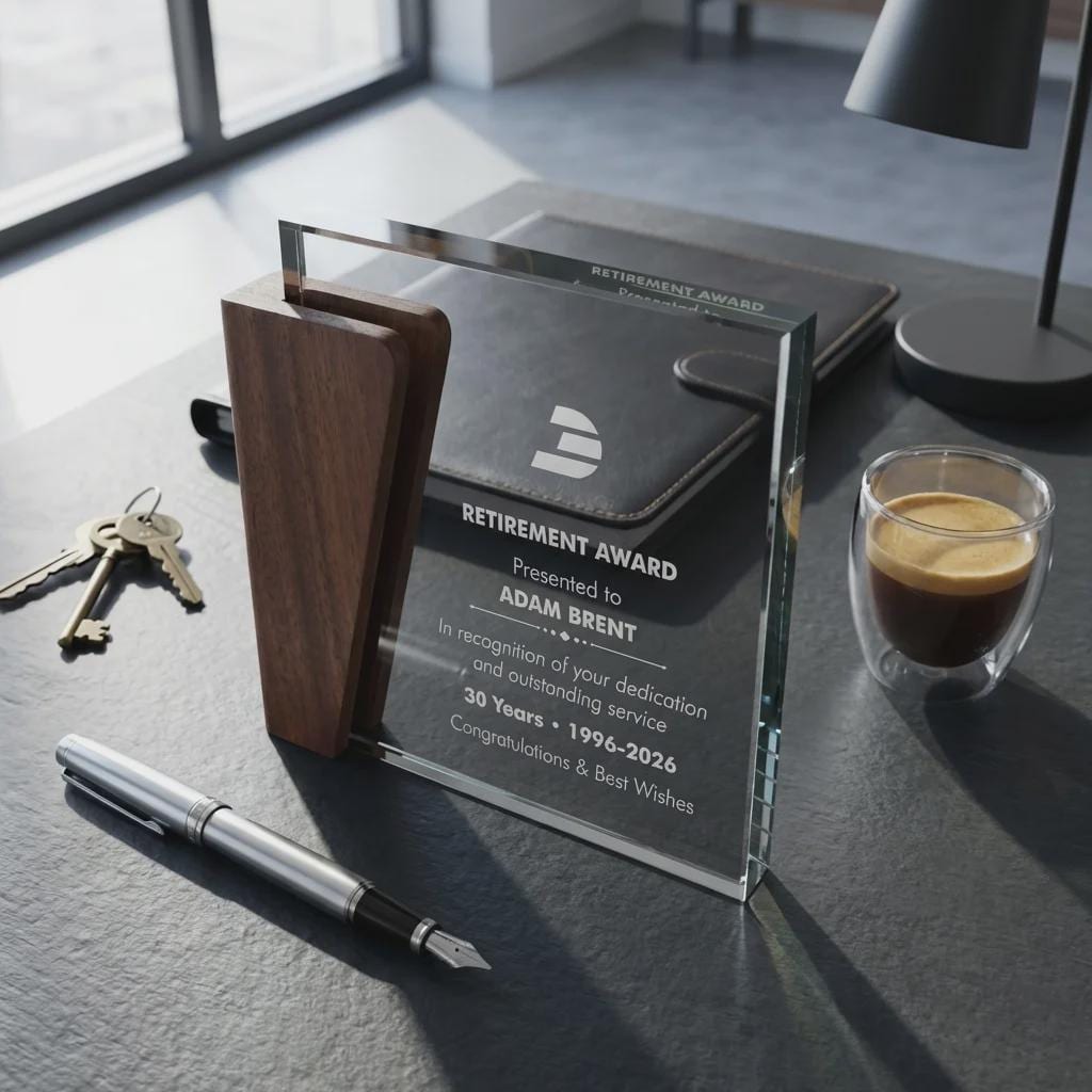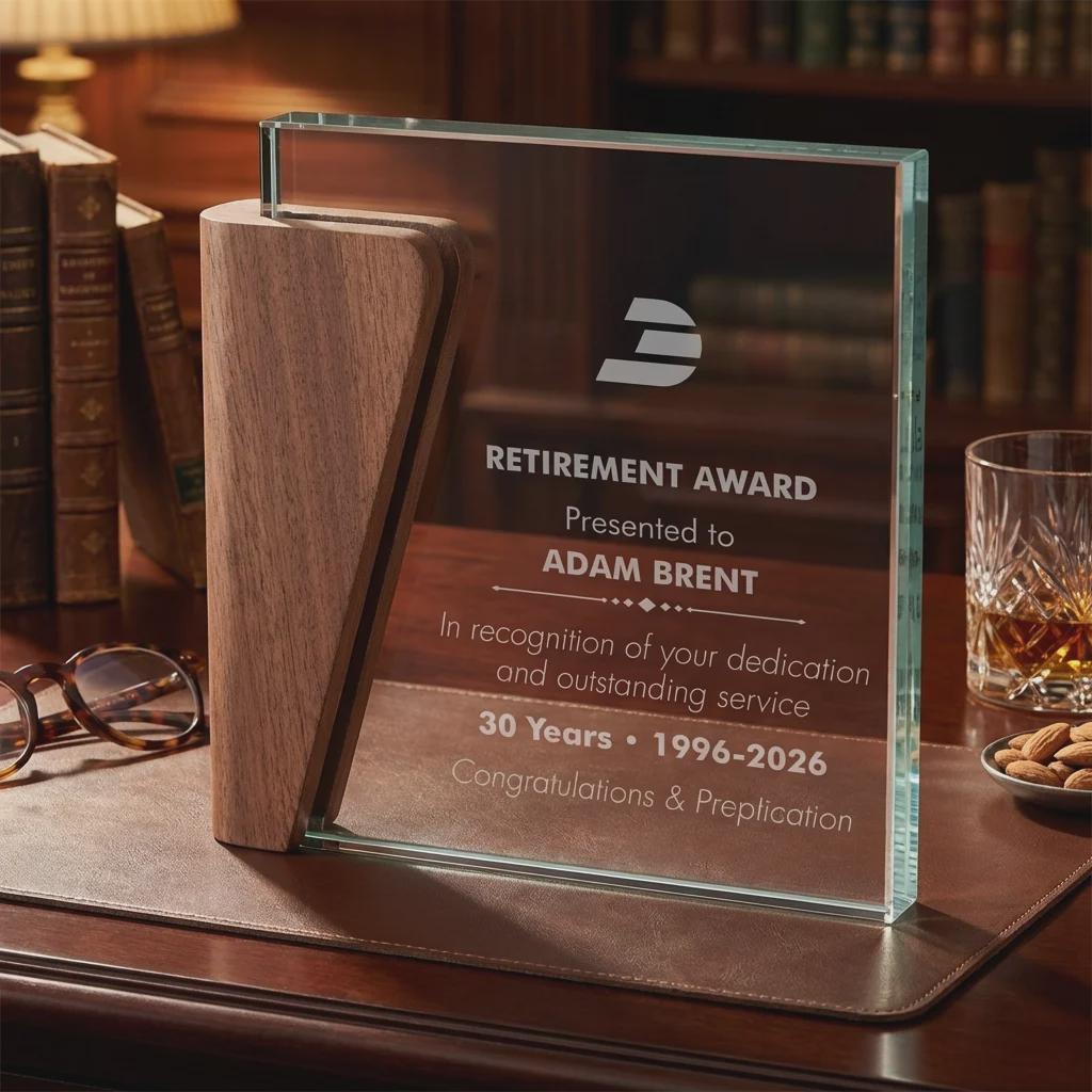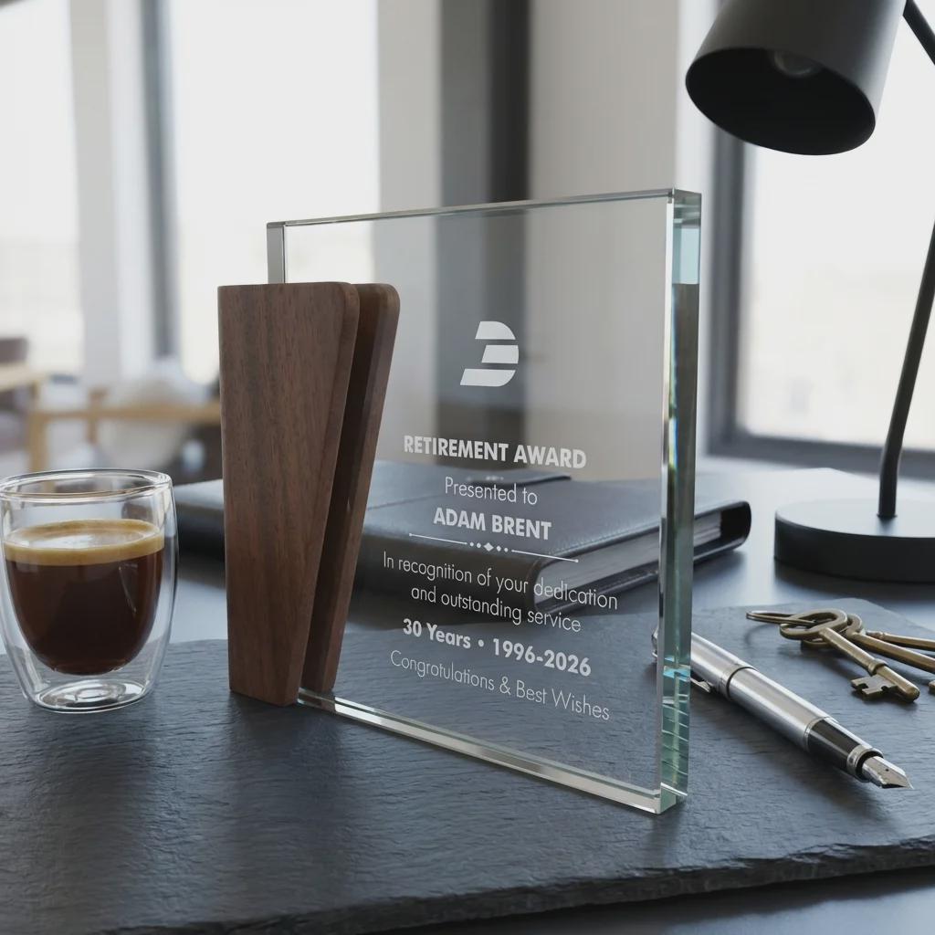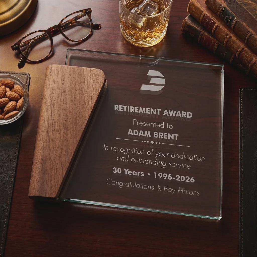 Personalized Retirement Award, Custom Crystal Glass and Wood Employee Appreciation Trophy, 7x6 inch