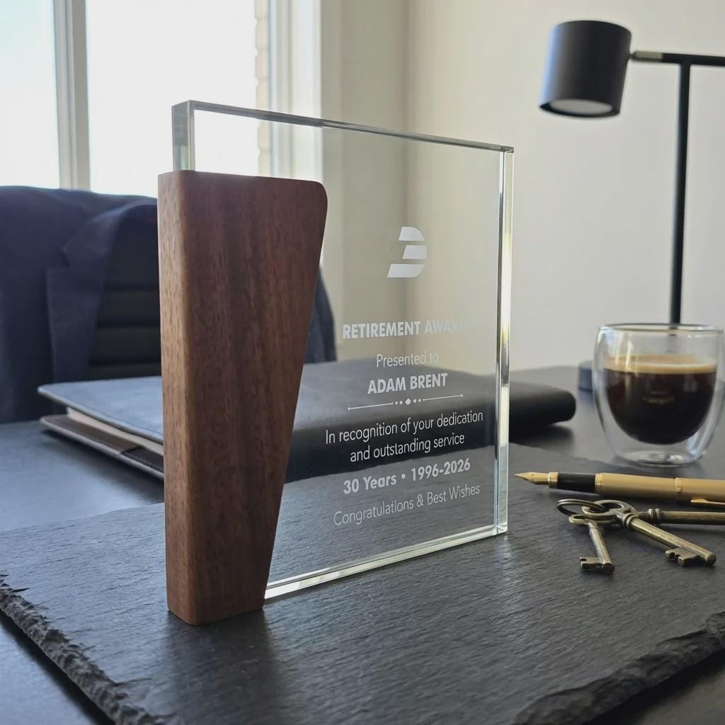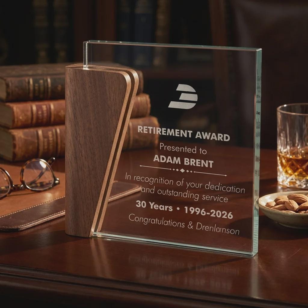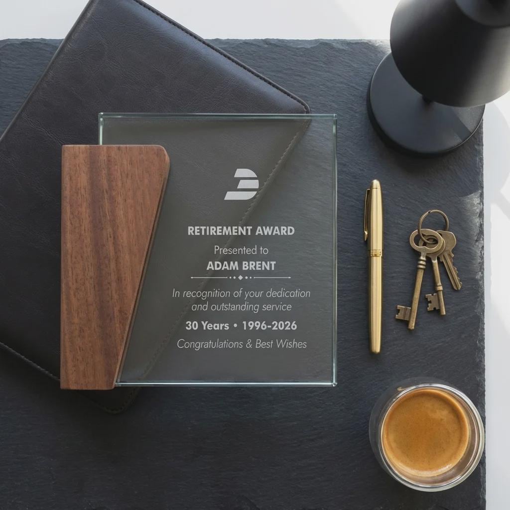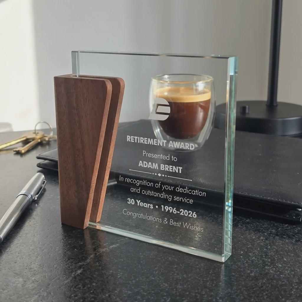 Personalized Retirement Award, Custom Crystal Glass and Wood Employee Appreciation Trophy, 7x6 inch