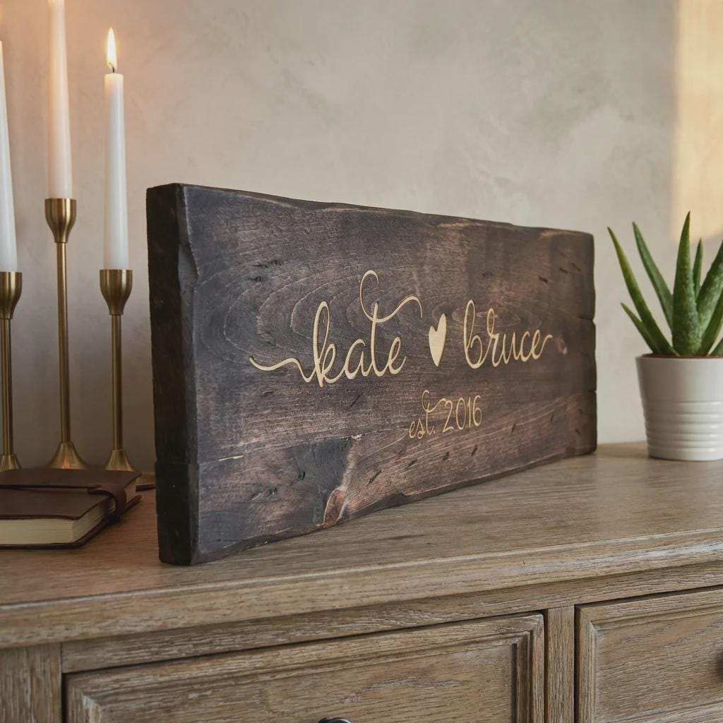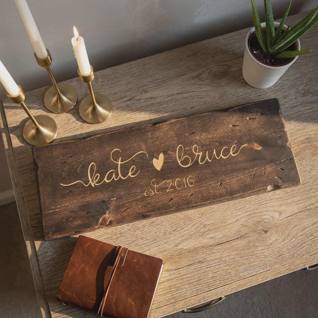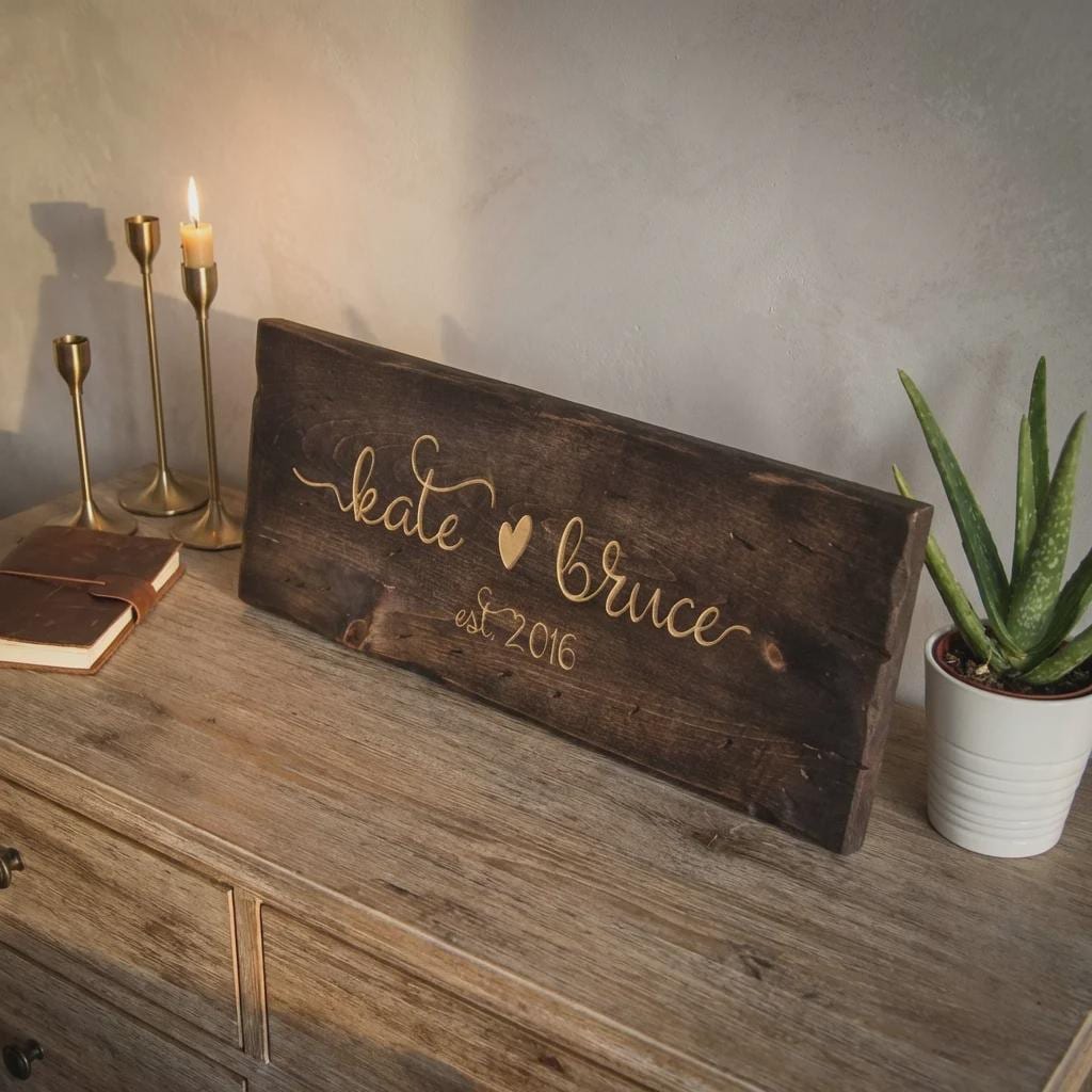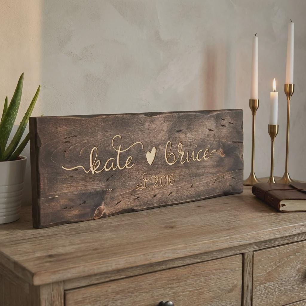 Elevate your entryway or living room with this personalized family name wood sign. Hand-crafted from solid pine wood and finished with a rich dark walnut stain, each sign is precision laser-engraved with your custom names, dates, or personal quotes. Featuring a rustic live-edge look and high-contrast engraving, it serves as a professional-grade centerpiece for home decor.