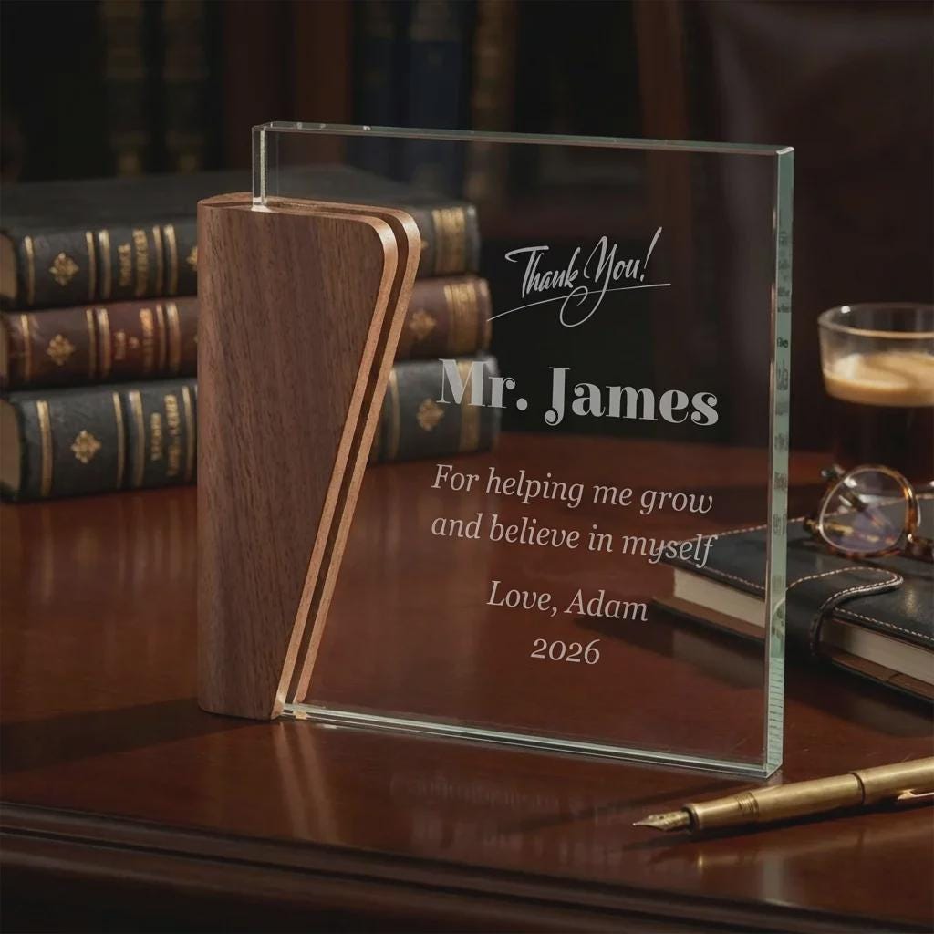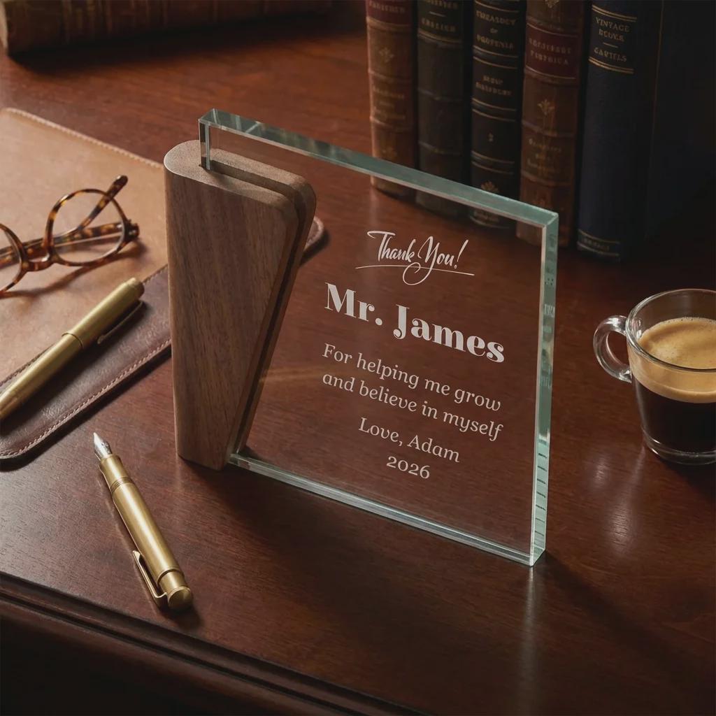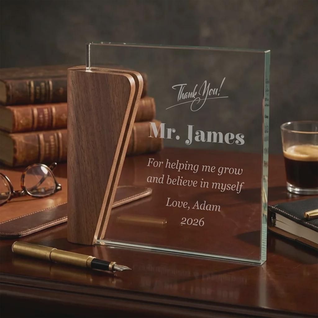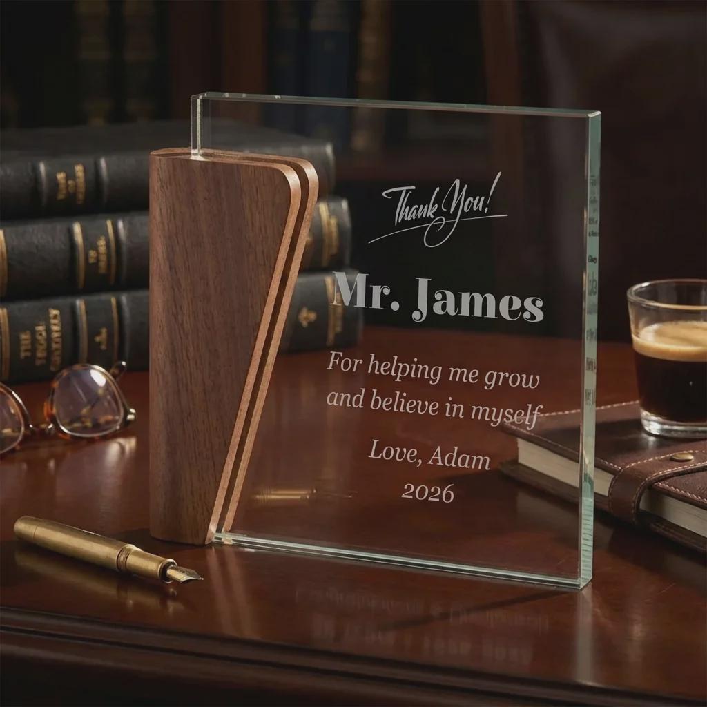 Personalized Teacher Appreciation Award, Custom Glass and Walnut Wood Trophy, Mentor Gift