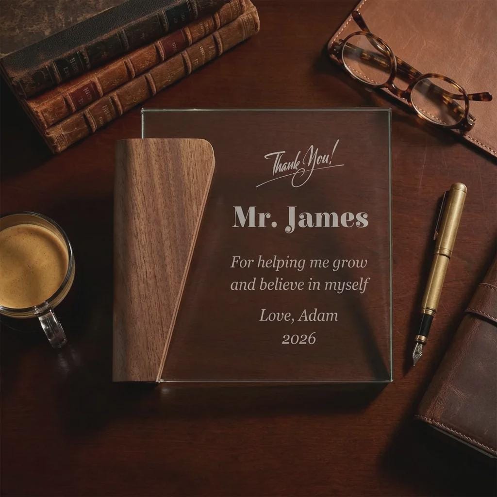 Recognize an educator's impact with this personalized teacher appreciation award. Hand-crafted with a solid wooden base and a high-contrast, heavy glass face, each trophy is precision laser-engraved with your custom coach's name, team message, and year. Featuring a modern, architectural silhouette, it serves as a professional-grade centerpiece for home offices, athletic facilities, or trophy mantels.