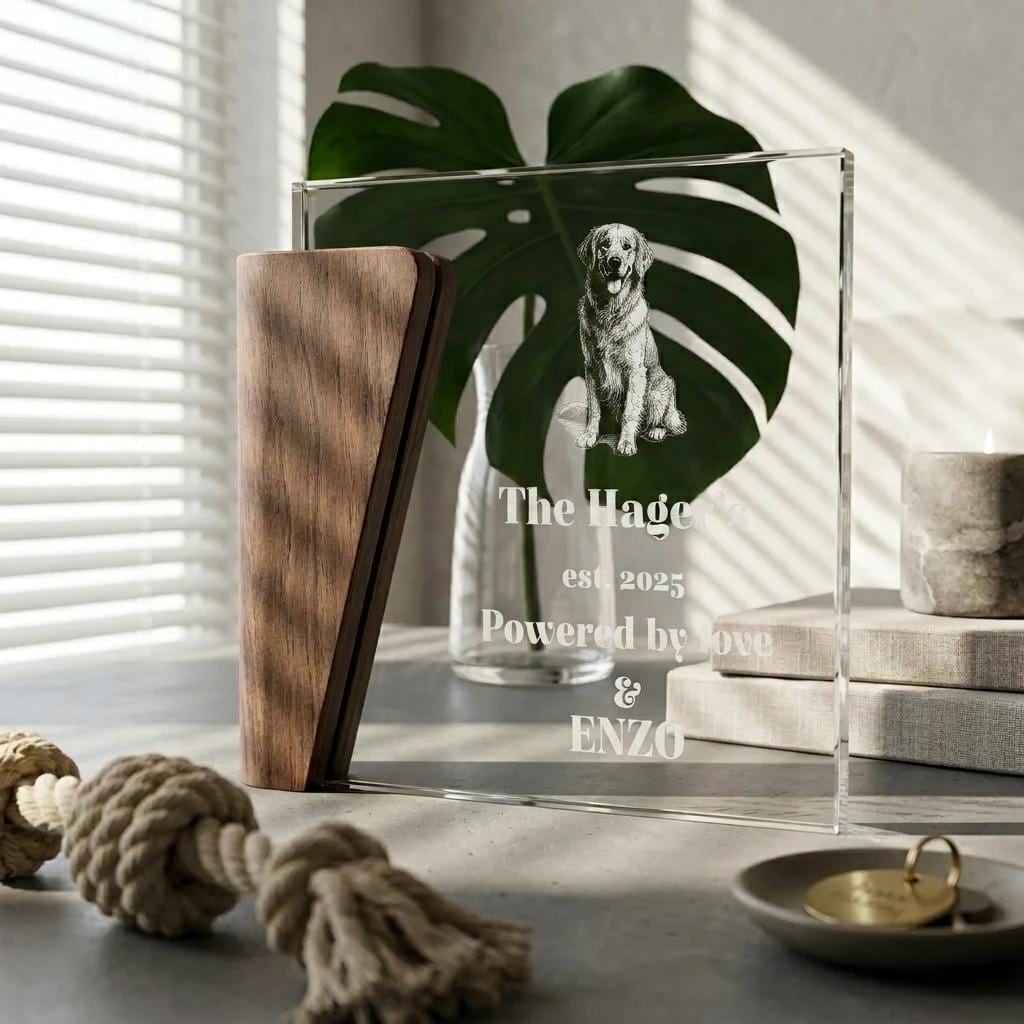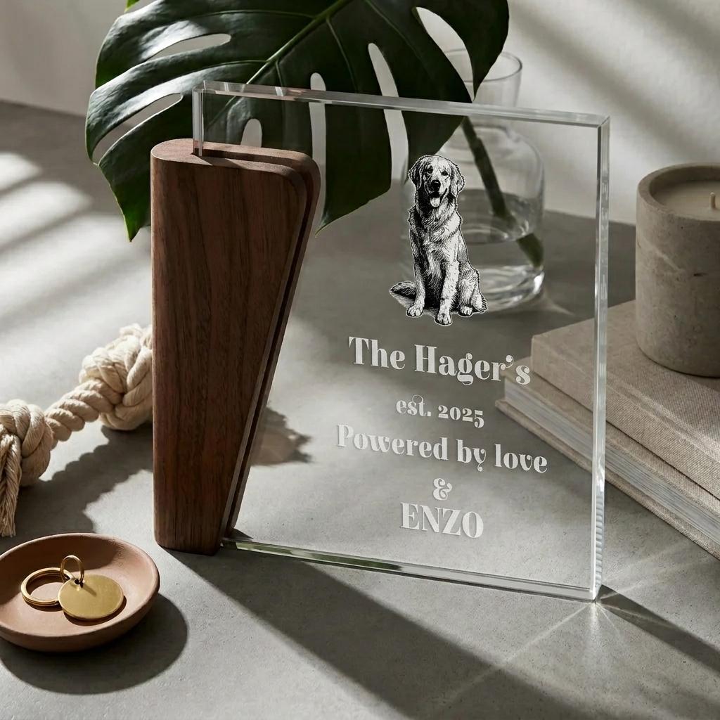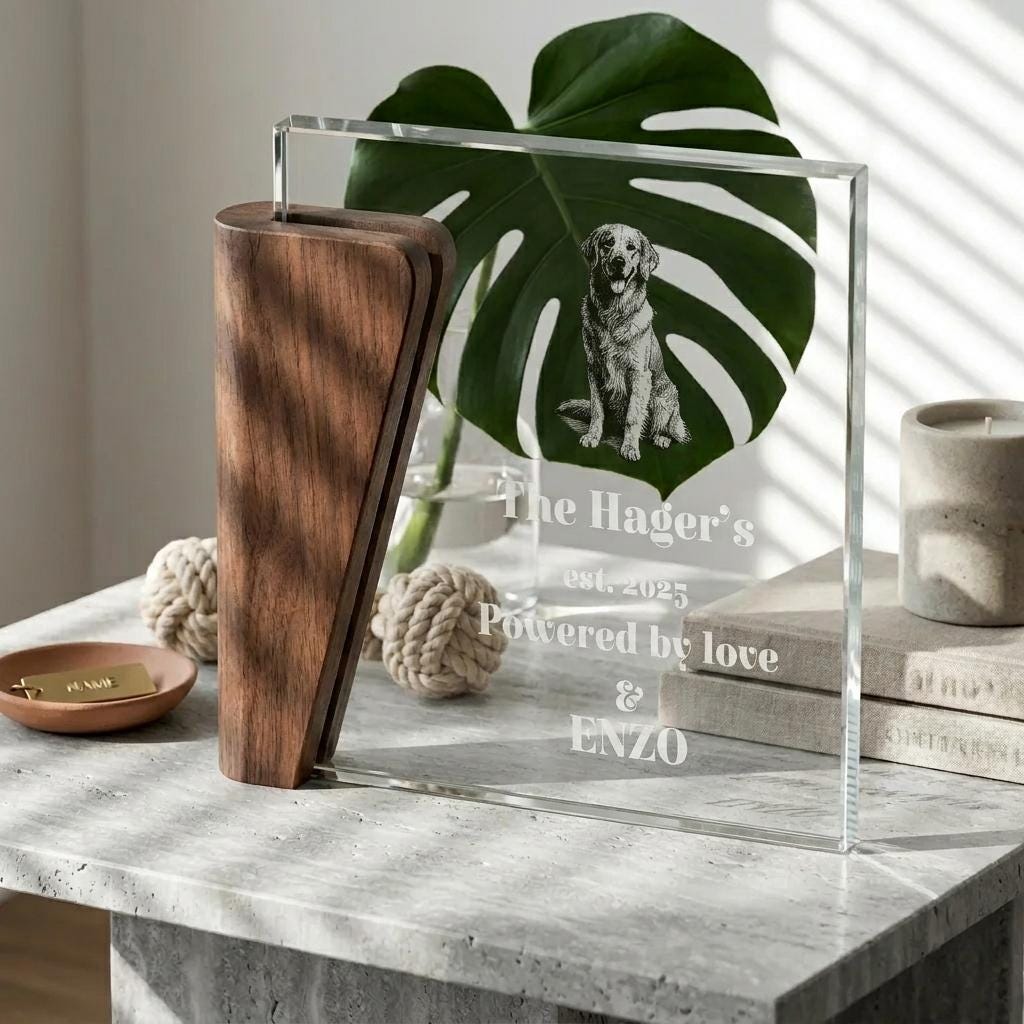 Turn your favorite pet photo into a professional-grade display with this personalized glass and wood award. Hand-crafted with a solid natural wood stand and a thick, high-clarity glass face, each trophy is precision laser etched with your pet's image, name, and a custom message. Its modern architectural silhouette makes it an objective centerpiece for home offices, mantels, or pet memorials.