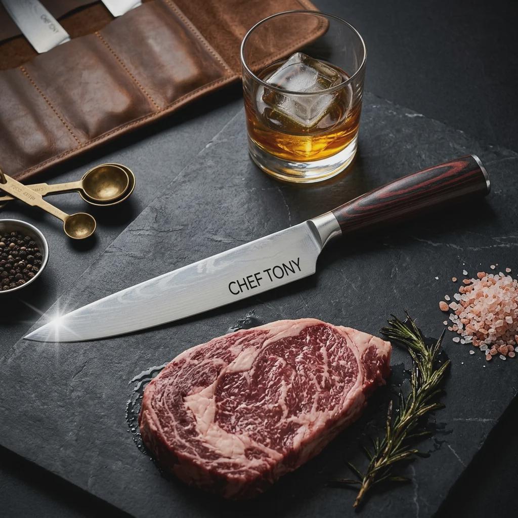 Upgrade your culinary toolkit with this personalized professional chef knife. Hand-crafted with an 8-inch high-carbon stainless steel blade, this knife is precision laser-engraved with your custom name or initials for a permanent finish. Designed for razor-sharp precision and balanced control, it features an ergonomic wood-grain handle and a metal finger protector, making it a functional tool for professional chefs and home cooks alike.