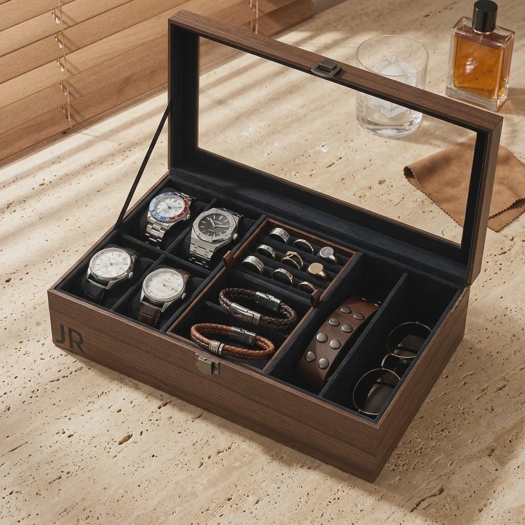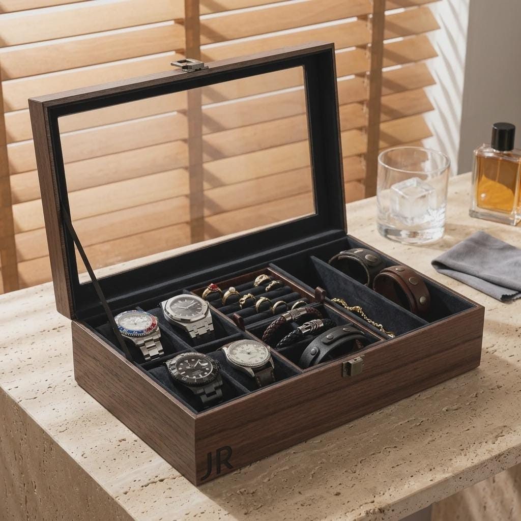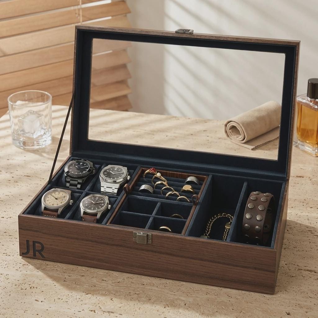 Personalized Watch Box and Jewelry Case for Men, Custom Engraved Wood Accessories Organizer with Glass Lid