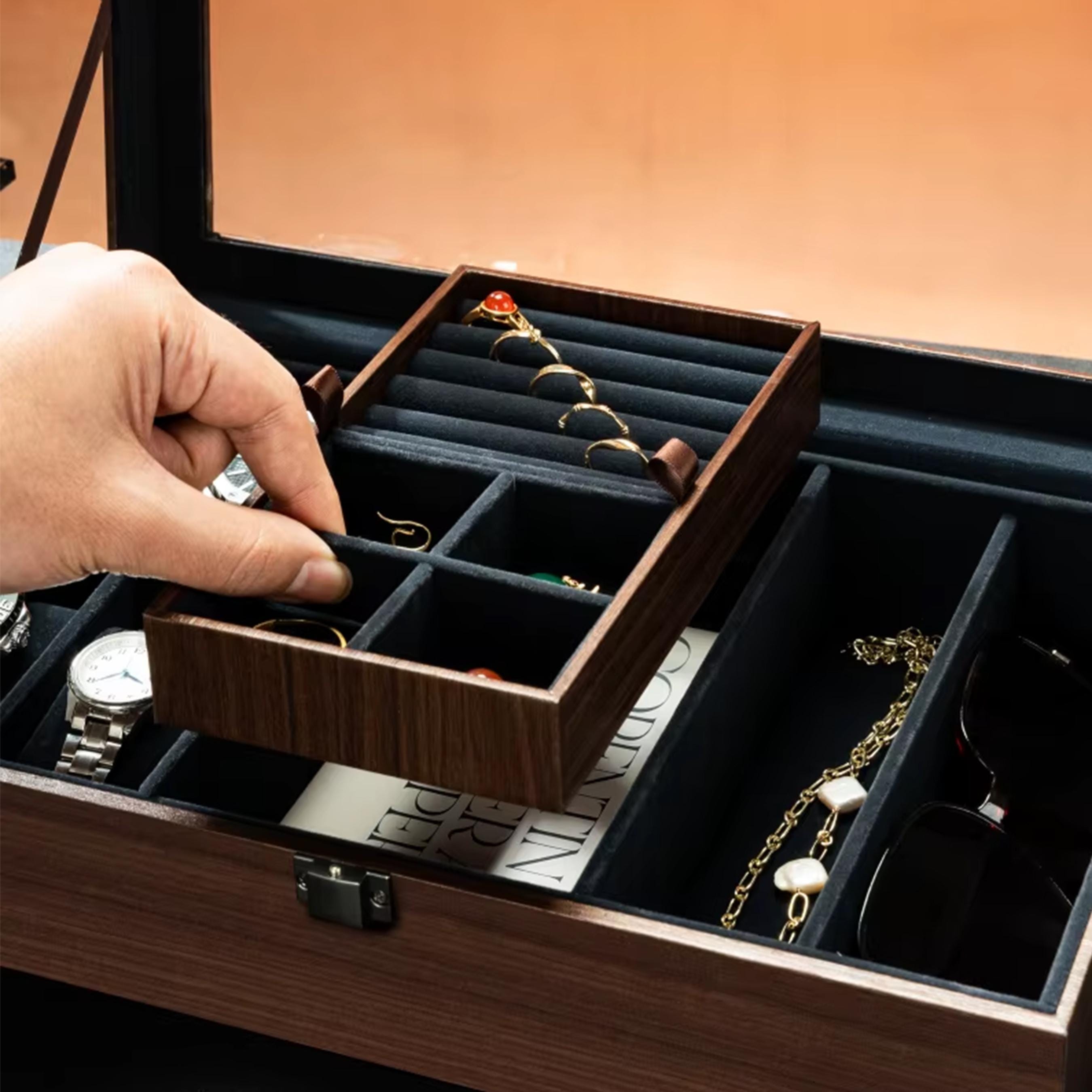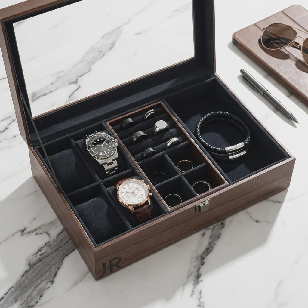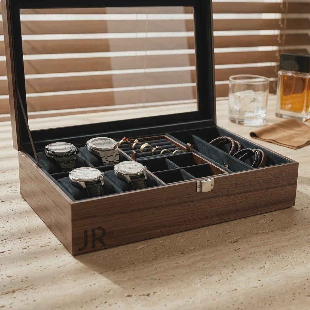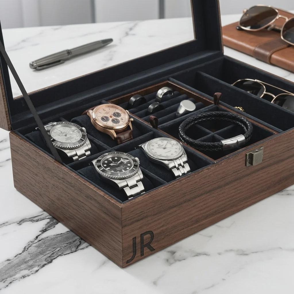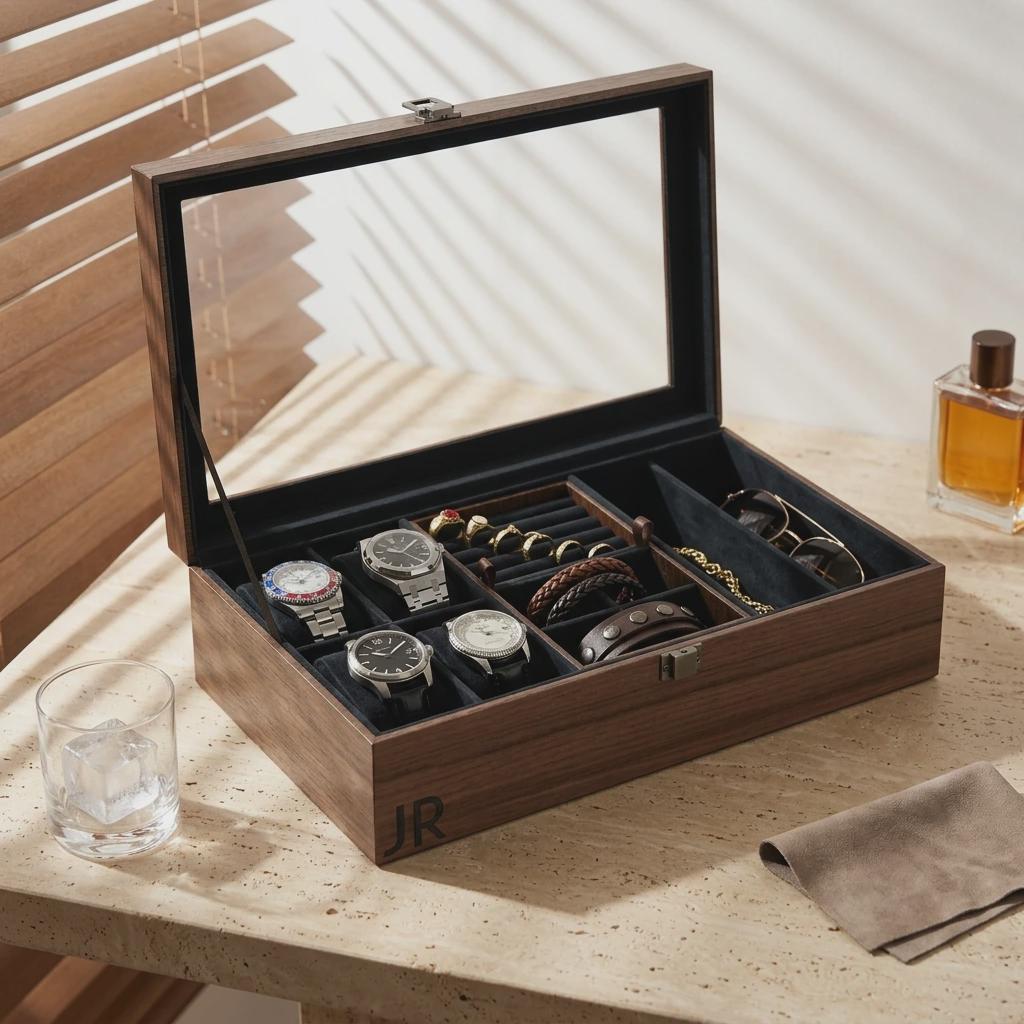 Elevate your organization with this premium personalized watch and jewelry box. Hand-crafted with a solid walnut-veneered MDF base and a high-clarity glass lid, this unit is precision laser-engraved for a permanent finish. Designed for versatile storage, it features a removable internal unit and soft velvet lining to protect timepieces, sunglasses, and rings.