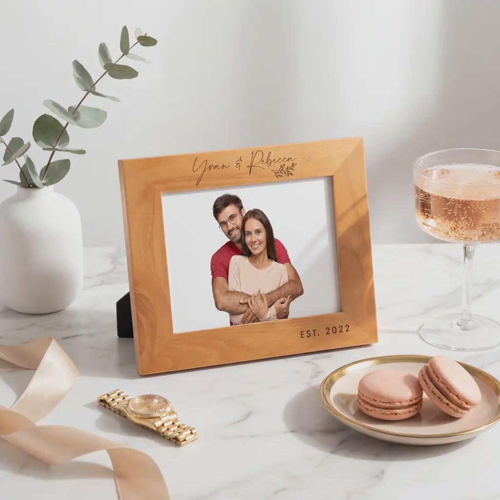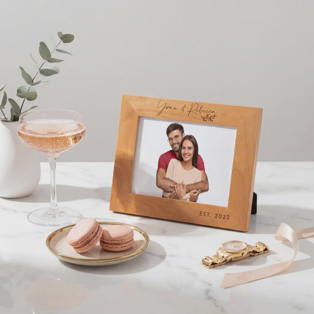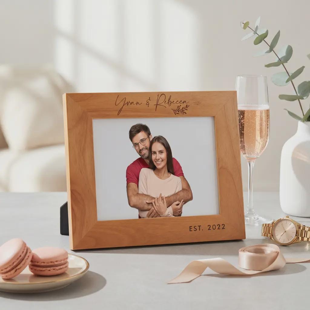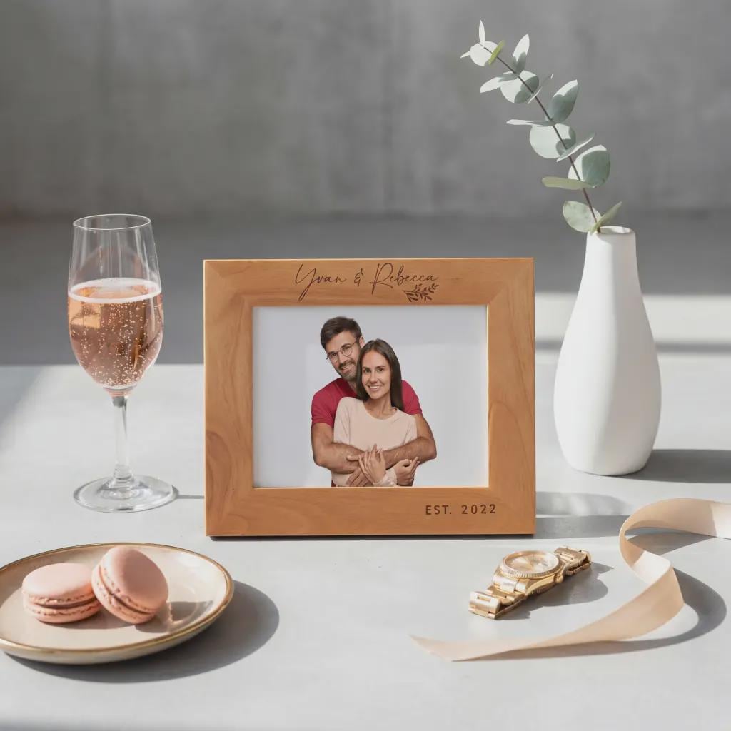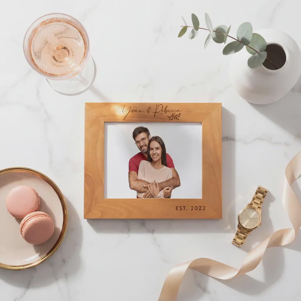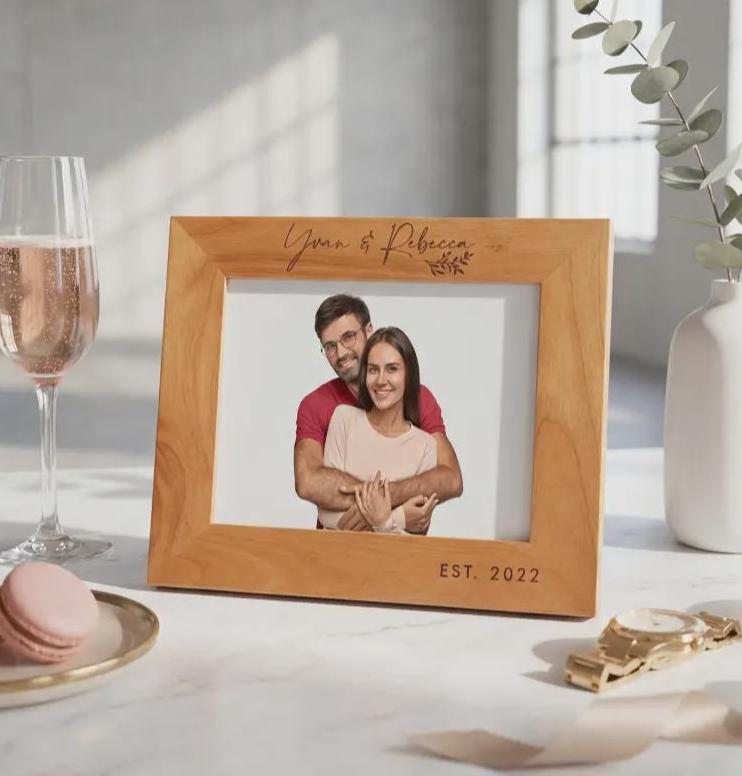 Transform your favorite memories into a timeless piece of art with our Personalized Wood Picture Frame. At JM la bonne impression, we believe that life's most beautiful milestones are weddings, engagements, and anniversaries. It deserves a frame that is just as special as the moment it holds. Crafted from high-quality, natural-finish wood and professionally engraved with your names and established date, this frame adds a touch of modern rustic charm to any home decor.