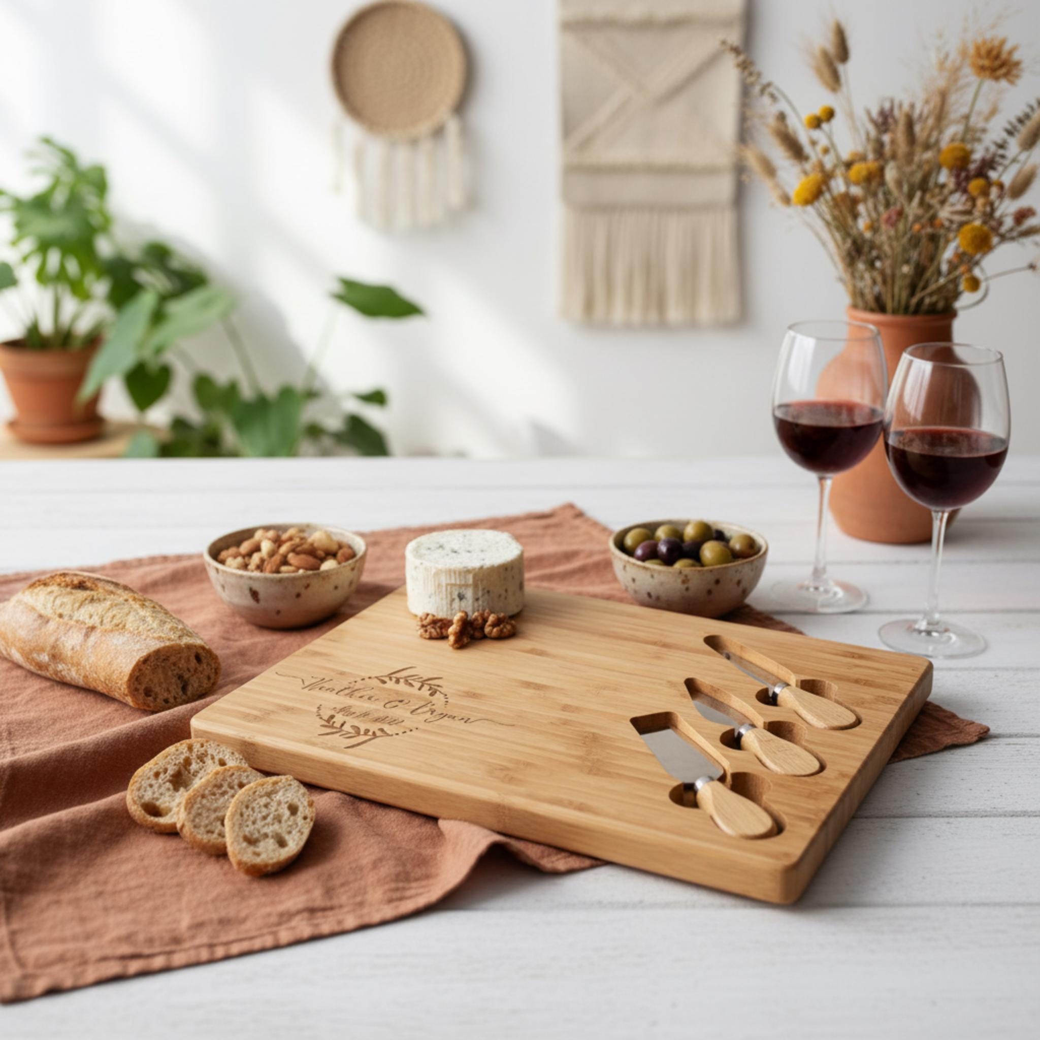 Overall, this personalized bamboo cheese board set can be a thoughtful and practical gift for cheese lovers or anyone who enjoys hosting gatherings and entertaining guests.