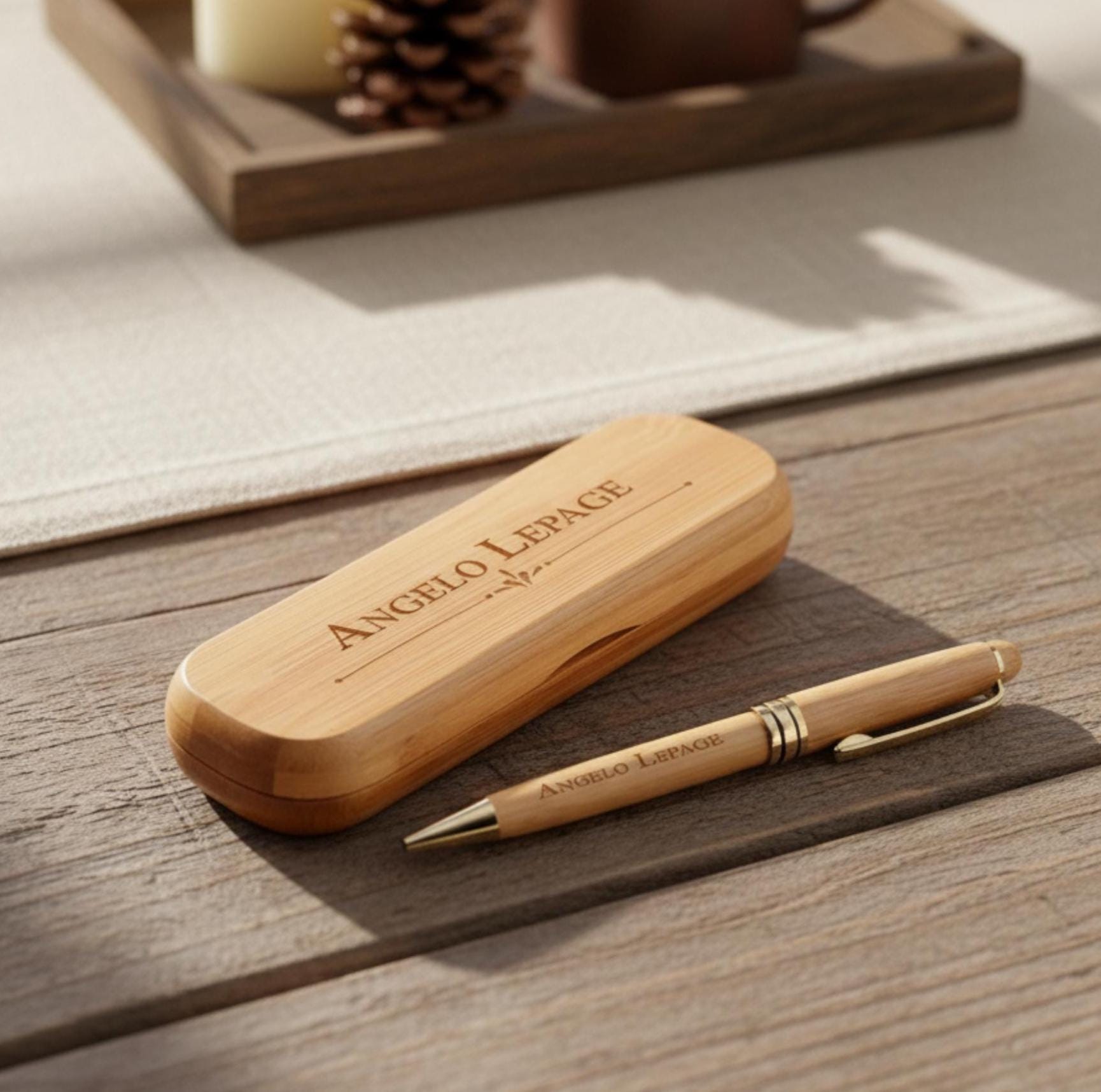 laser engraving message of three full line on wooden case and names on the wooden pen.