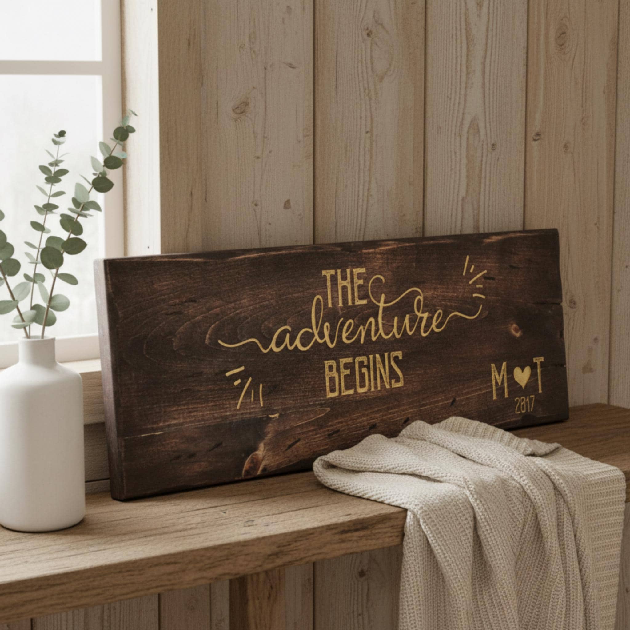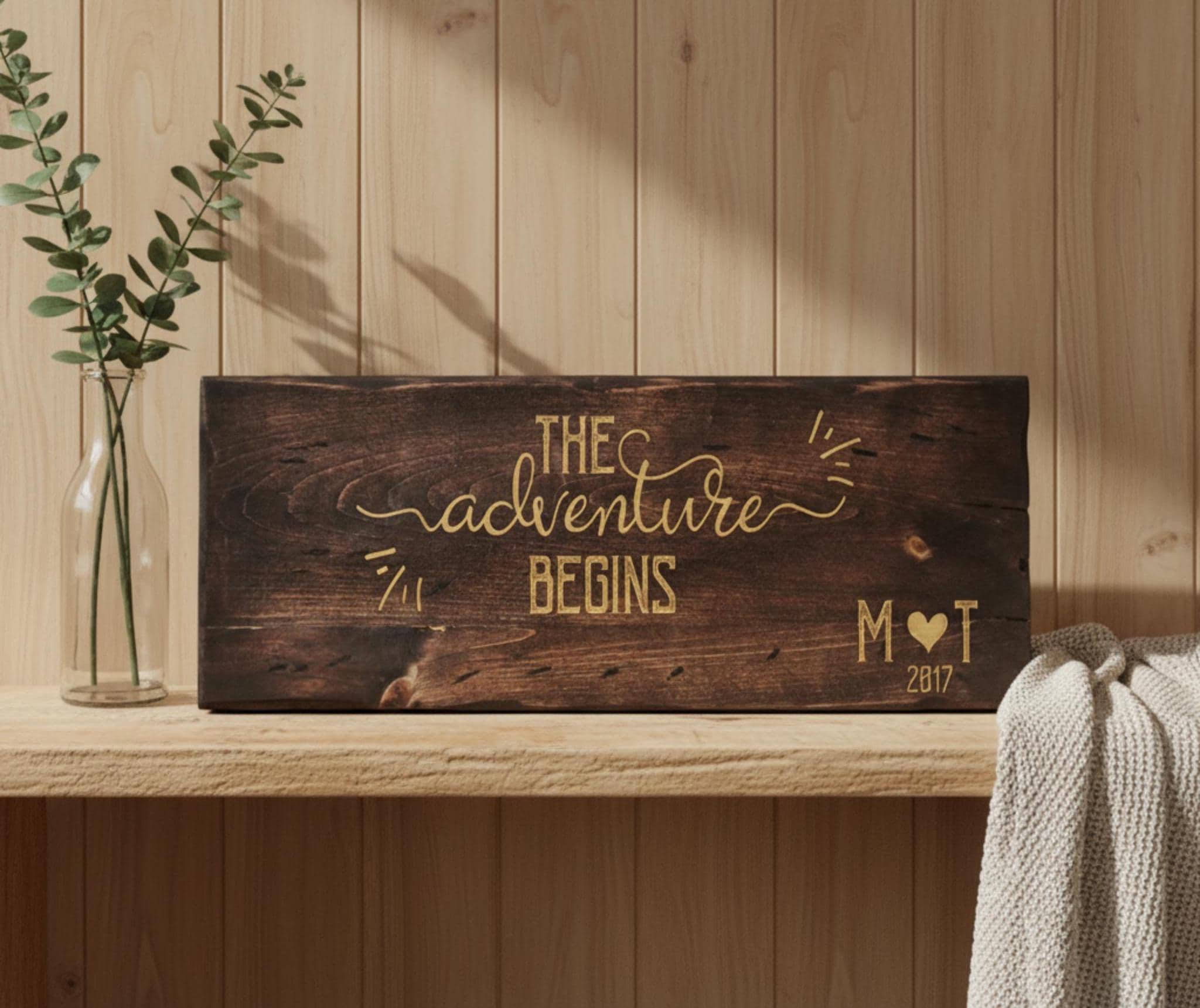 Personalized Rustic Wood Sign, Custom Engraved Wall Sign: The Adventure Begins - Farmhouse Style Decor, Housewarming and Couples Gift