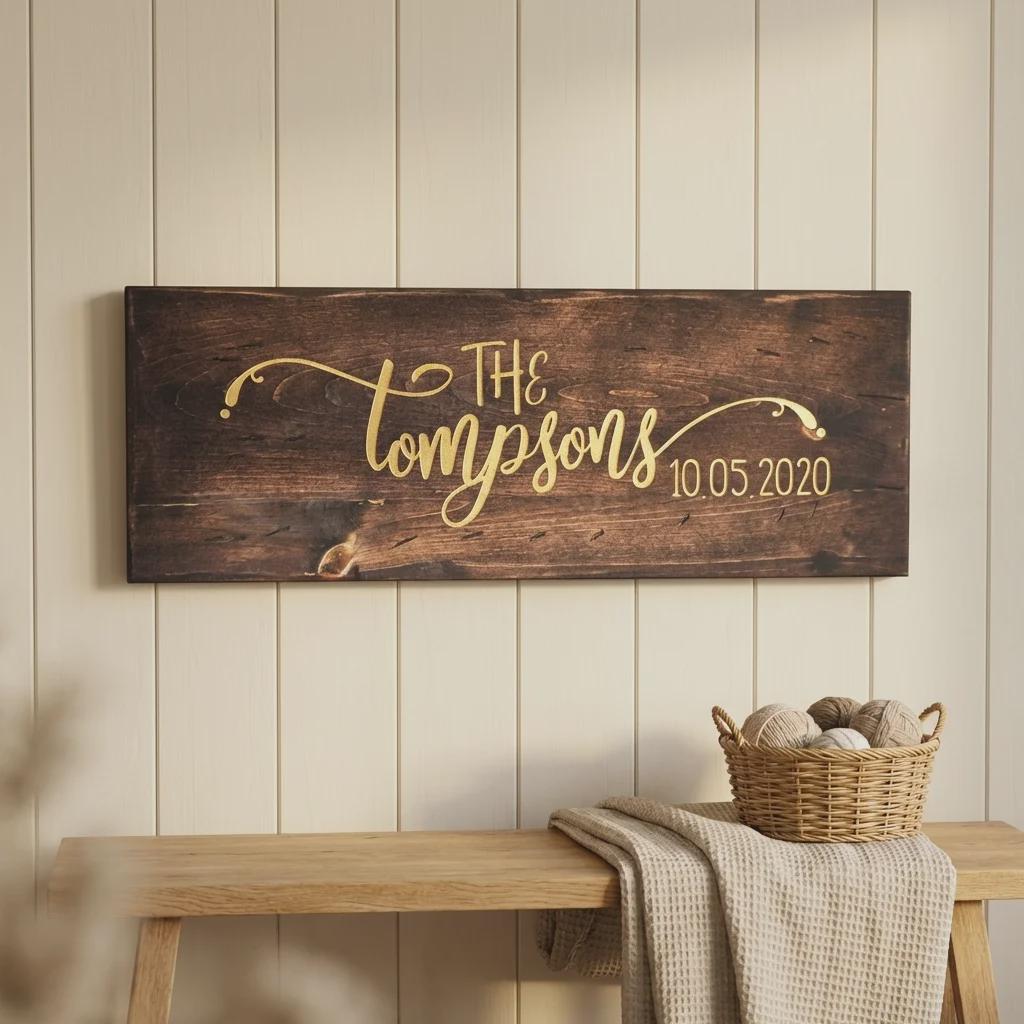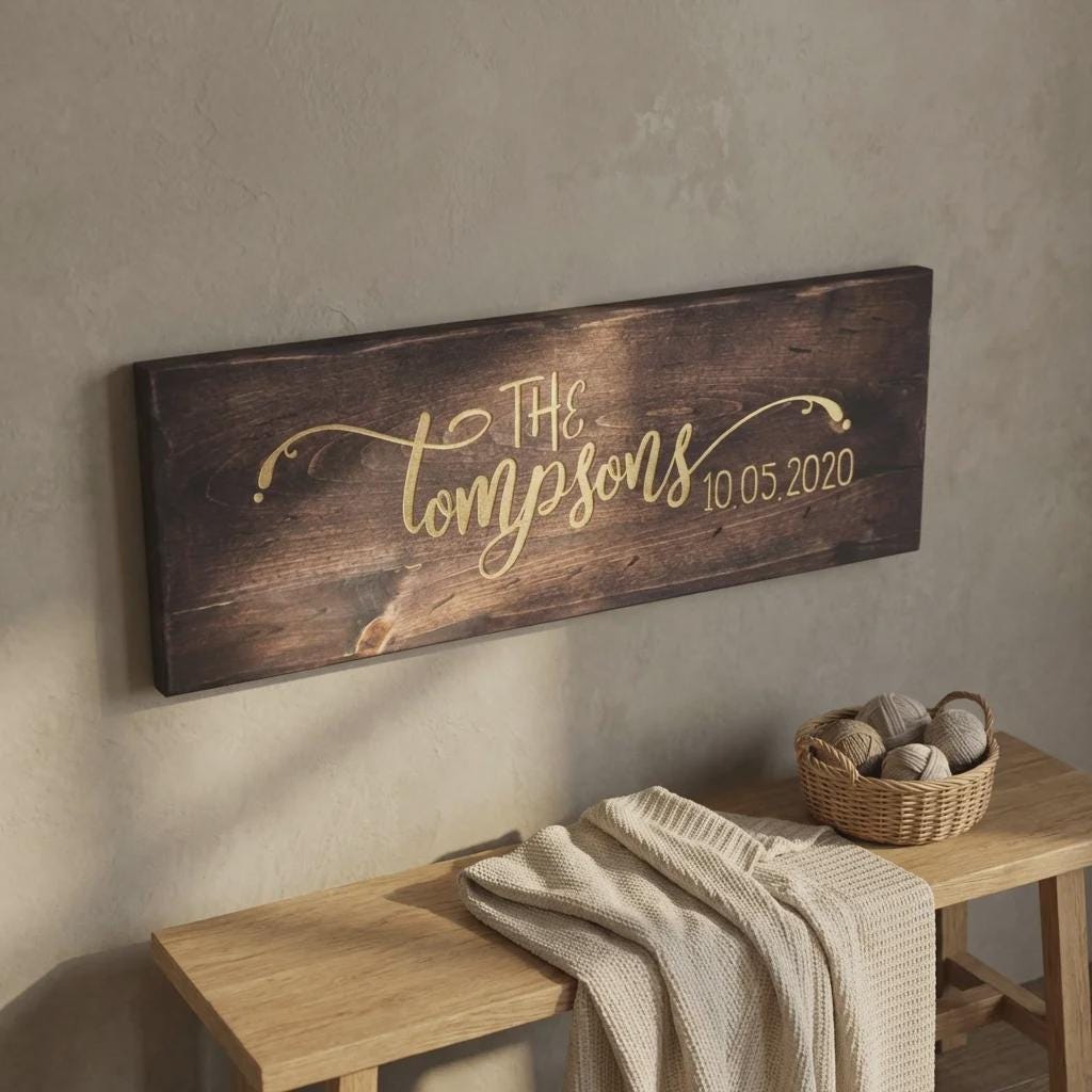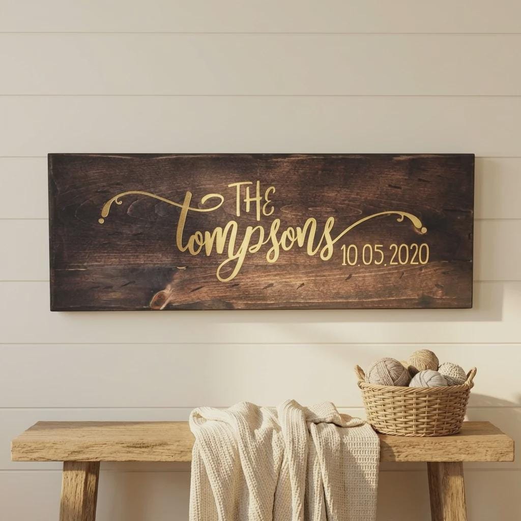 Decorate your space with this personalized family name wood sign. Hand-crafted by our in-house carpenter from solid pine wood and finished with a rich dark walnut stain, each sign is precision laser-engraved with your custom names, dates, or personal quotes. Available in three large horizontal formats, it serves as a professional-grade centerpiece for entryways, mantels, or bedroom walls.