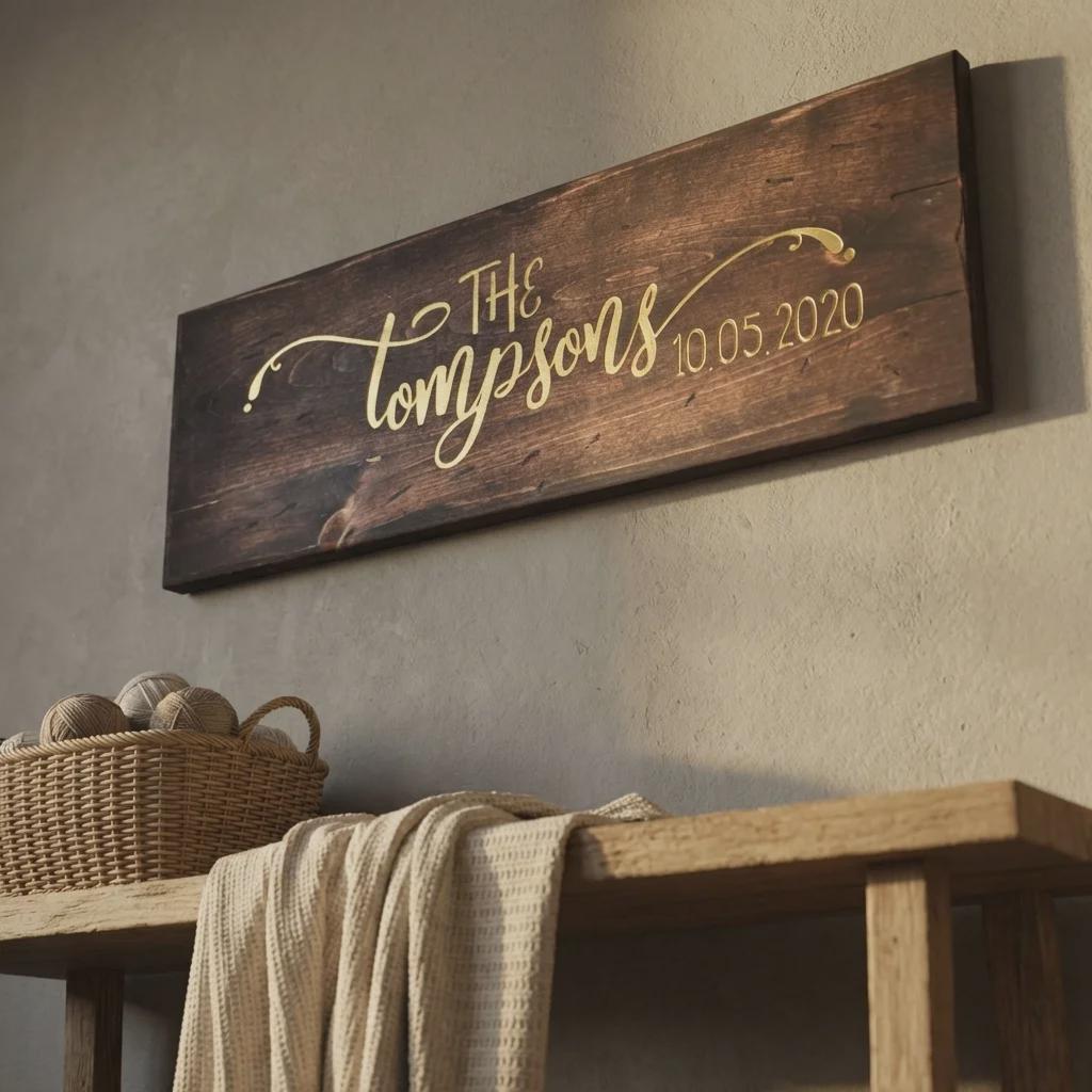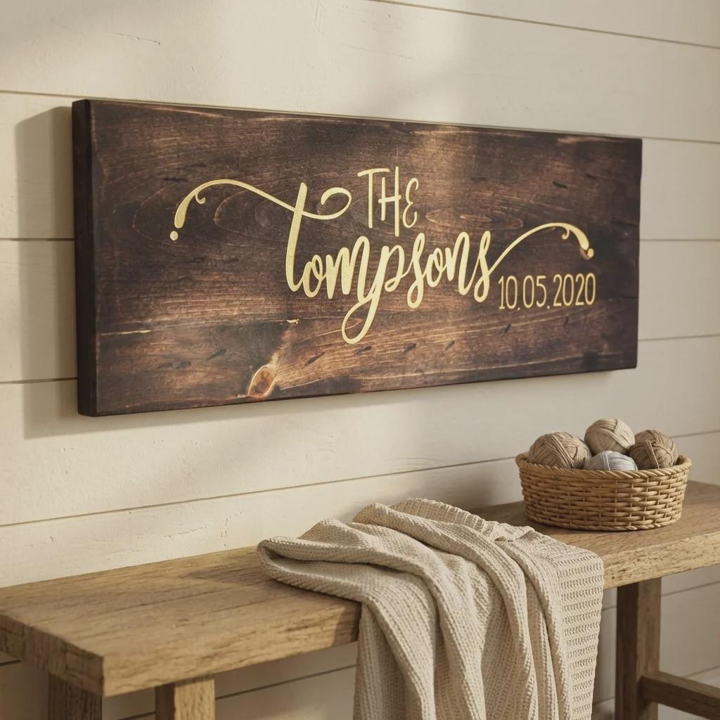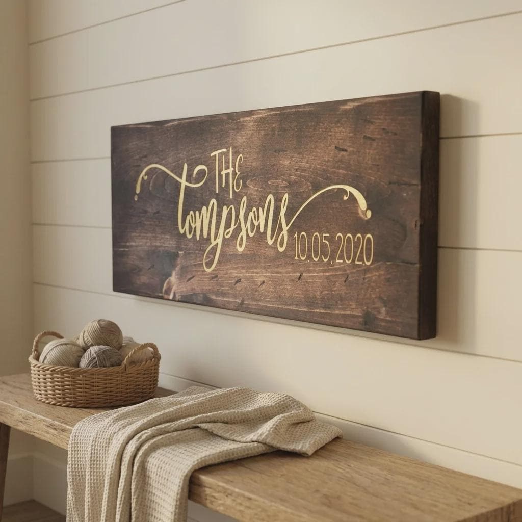 Decorate your space with this personalized family name wood sign. Hand-crafted by our in-house carpenter from solid pine wood and finished with a rich dark walnut stain, each sign is precision laser-engraved with your custom names, dates, or personal quotes. Available in three large horizontal formats, it serves as a professional-grade centerpiece for entryways, mantels, or bedroom walls.