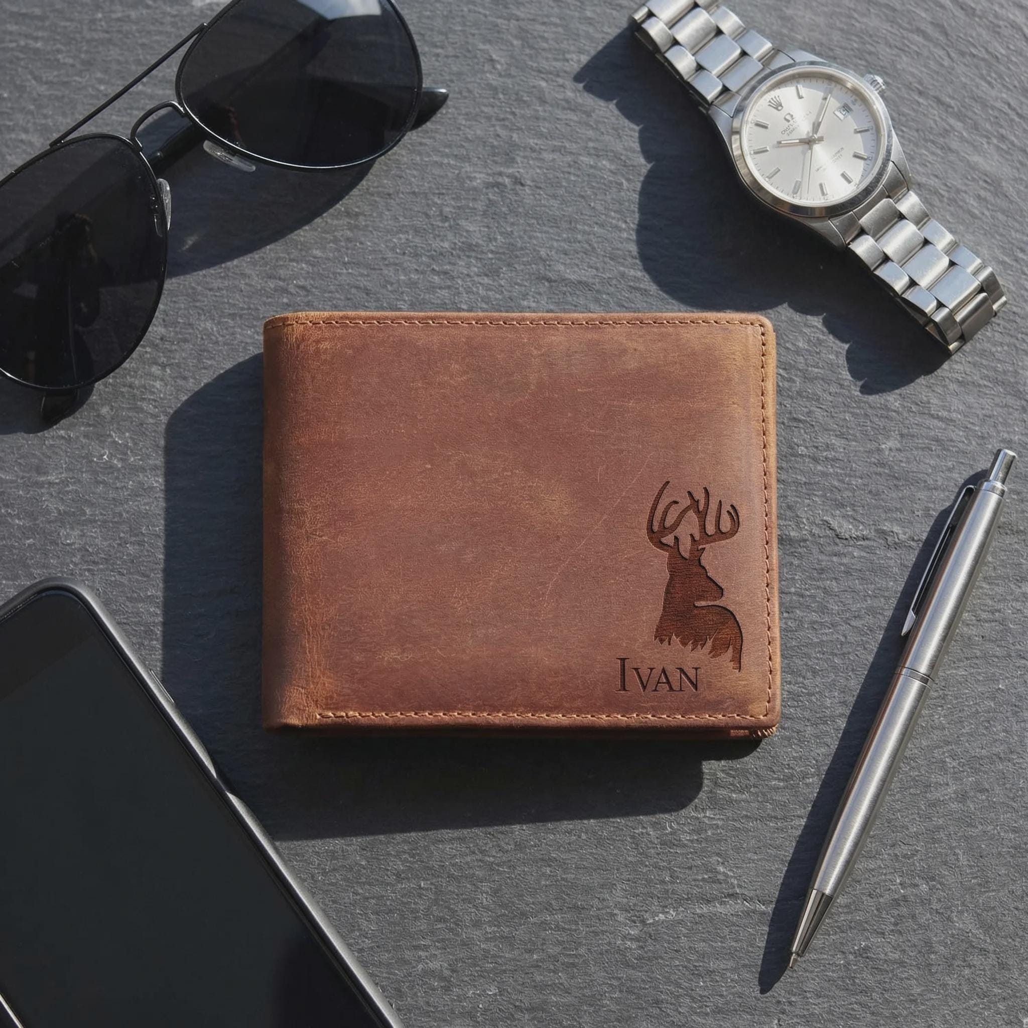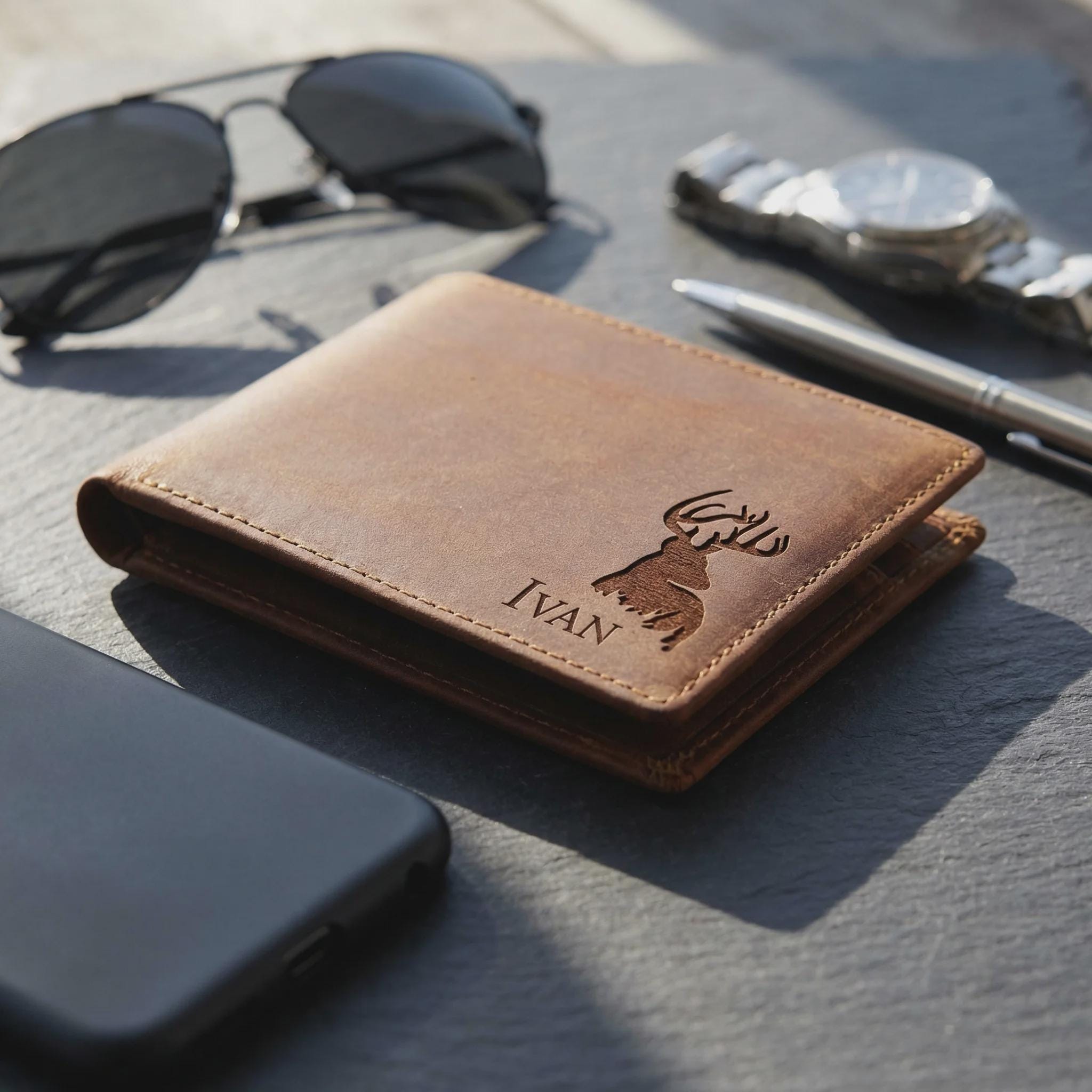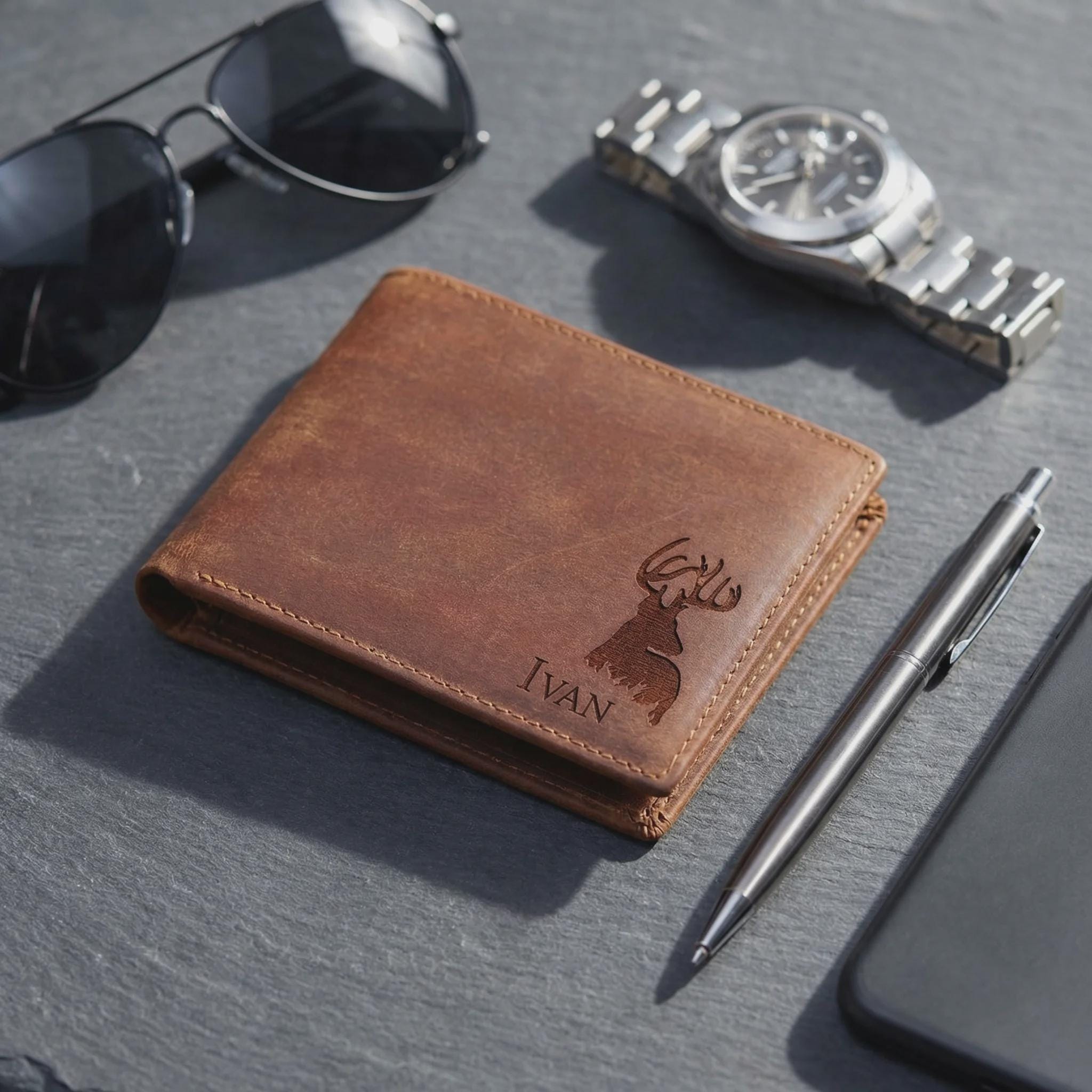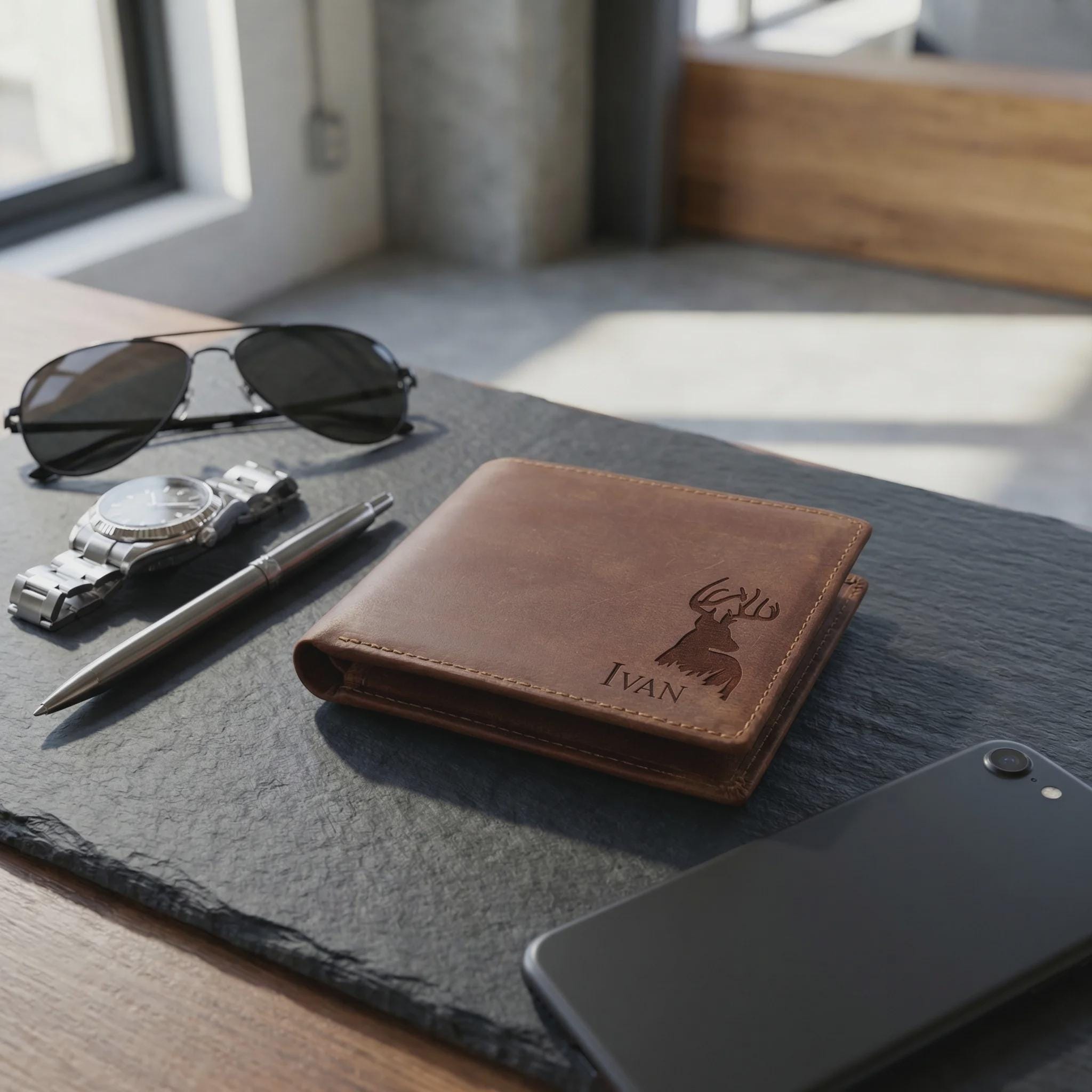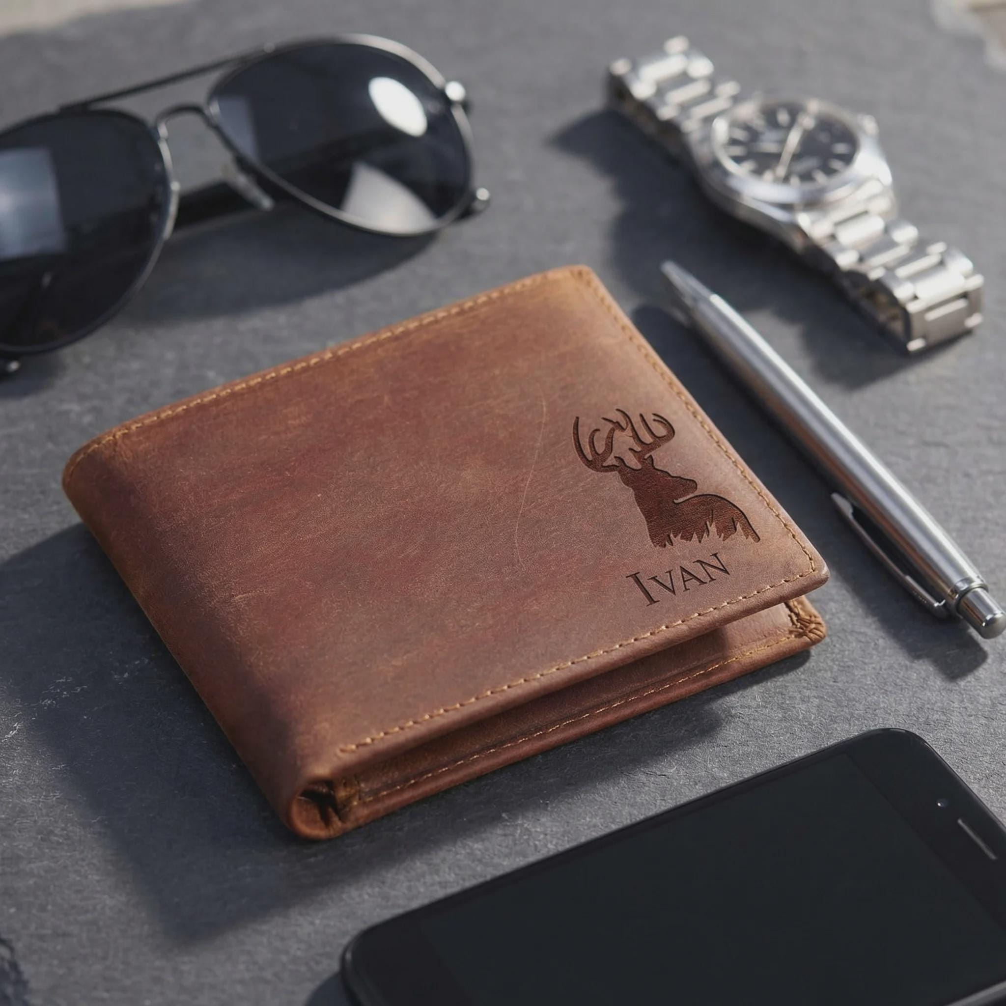Personalized Genuine Leather Wallet for Men, Custom Engraved Crazy Horse Bifold with 6 Card Slots