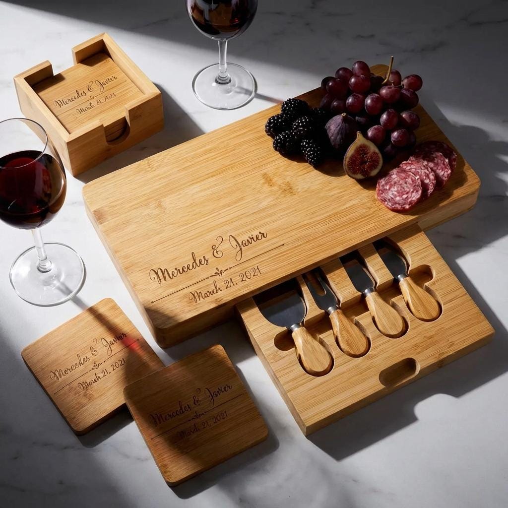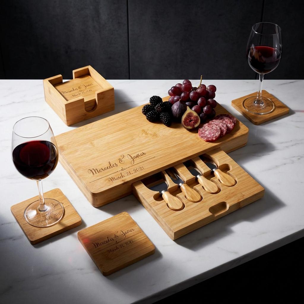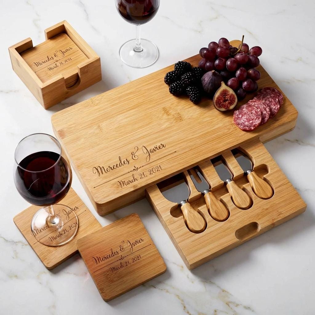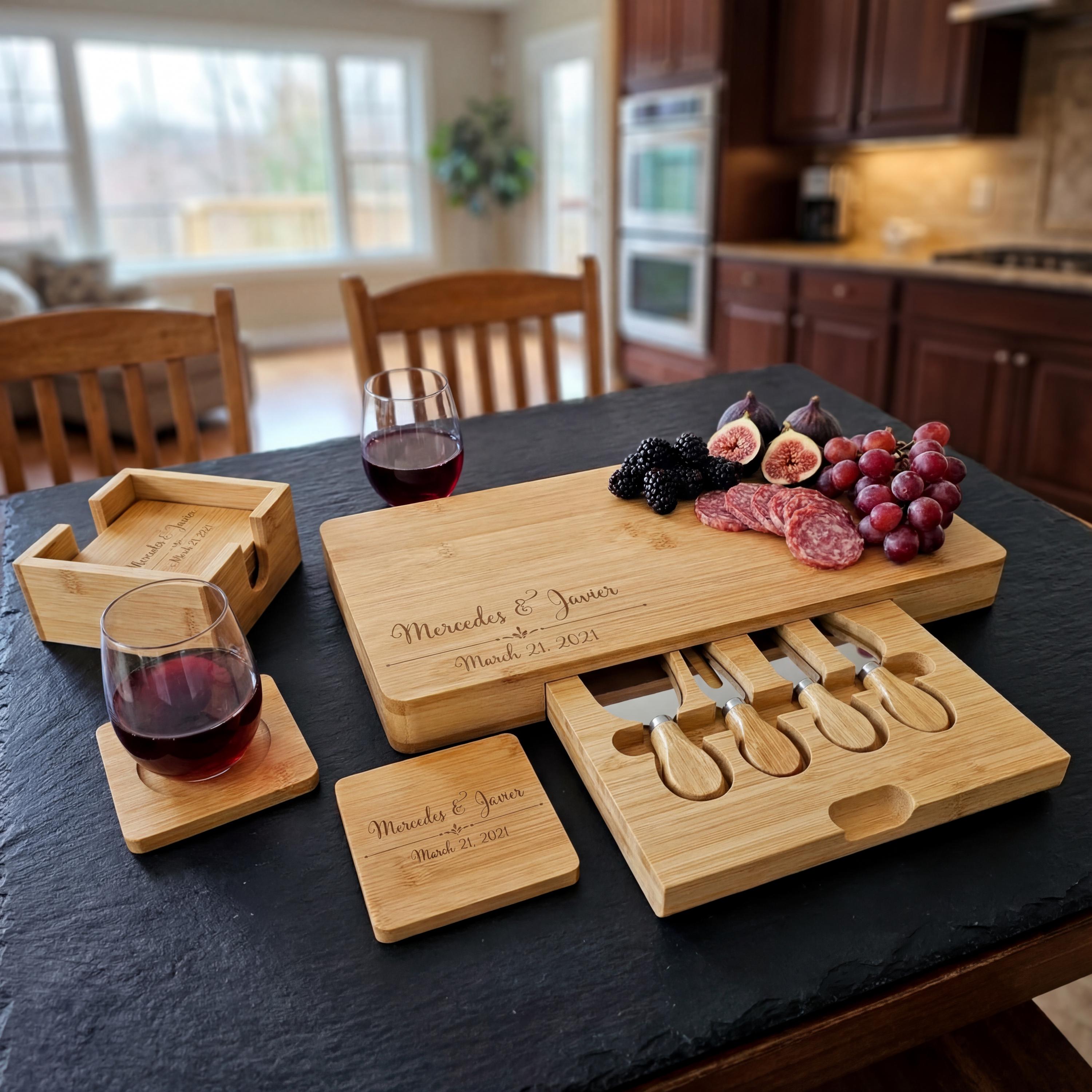 Bamboo Coaster Set: A chic 5-piece coaster set (each coaster 4" x 4") with a stylish holder that complements the board.