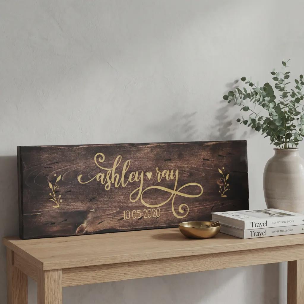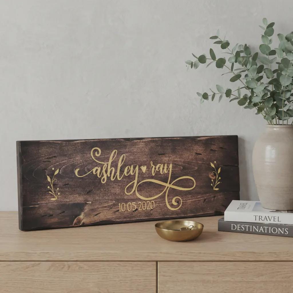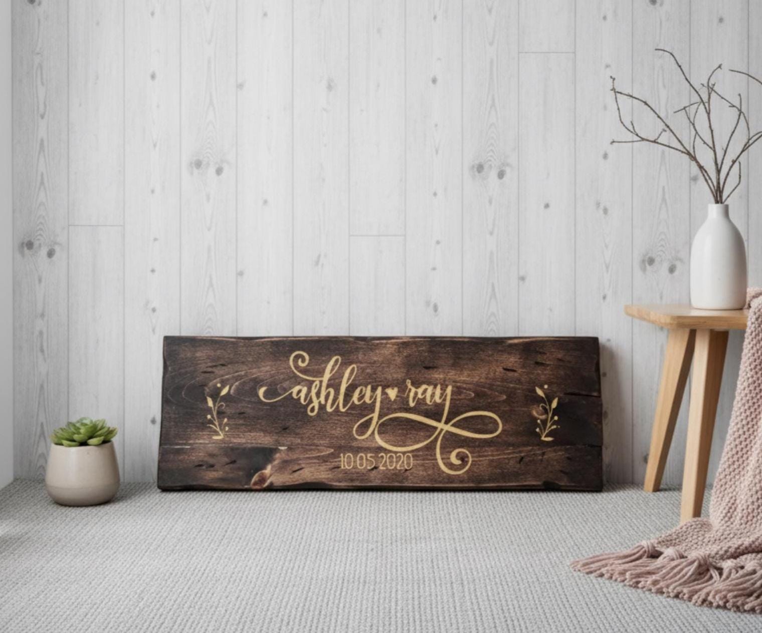 Each of our signs is beautifully handcrafted by our skilled carpenter using pine wood, stained with a dark walnut color to give it a timeless and elegant finish. Since every piece is unique in color and grain, you can be sure that your sign will be one-of-a-kind.