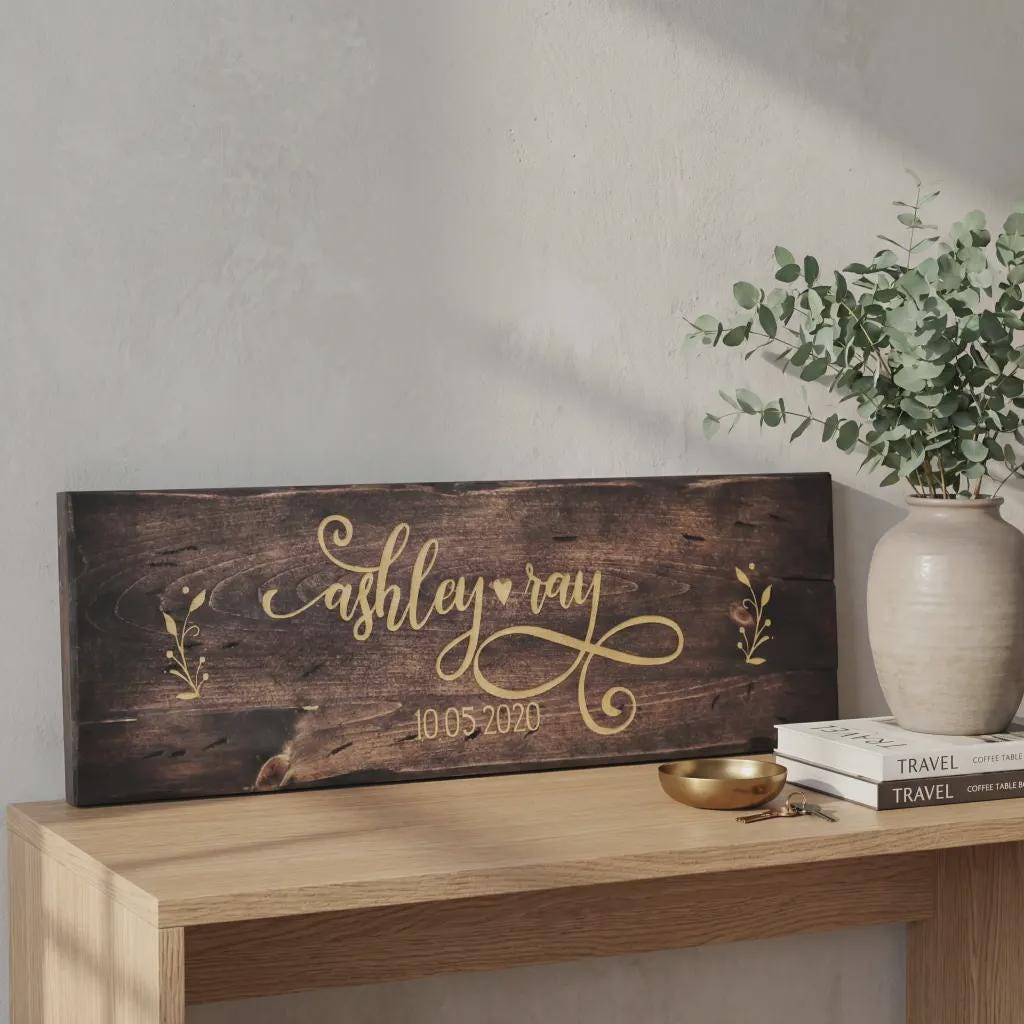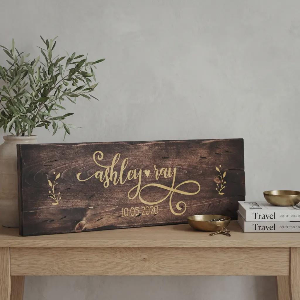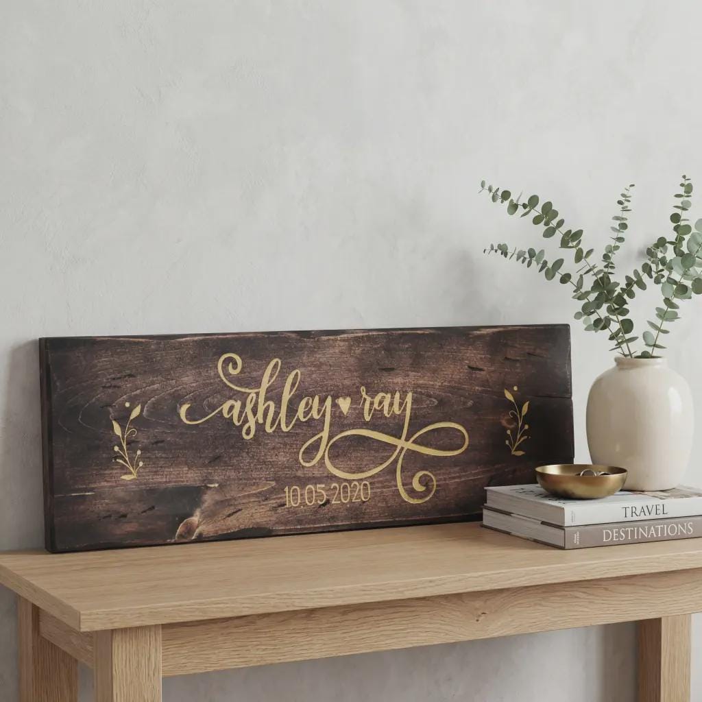 Each of our signs is beautifully handcrafted by our skilled carpenter using pine wood, stained with a dark walnut color to give it a timeless and elegant finish. Since every piece is unique in color and grain, you can be sure that your sign will be one-of-a-kind.