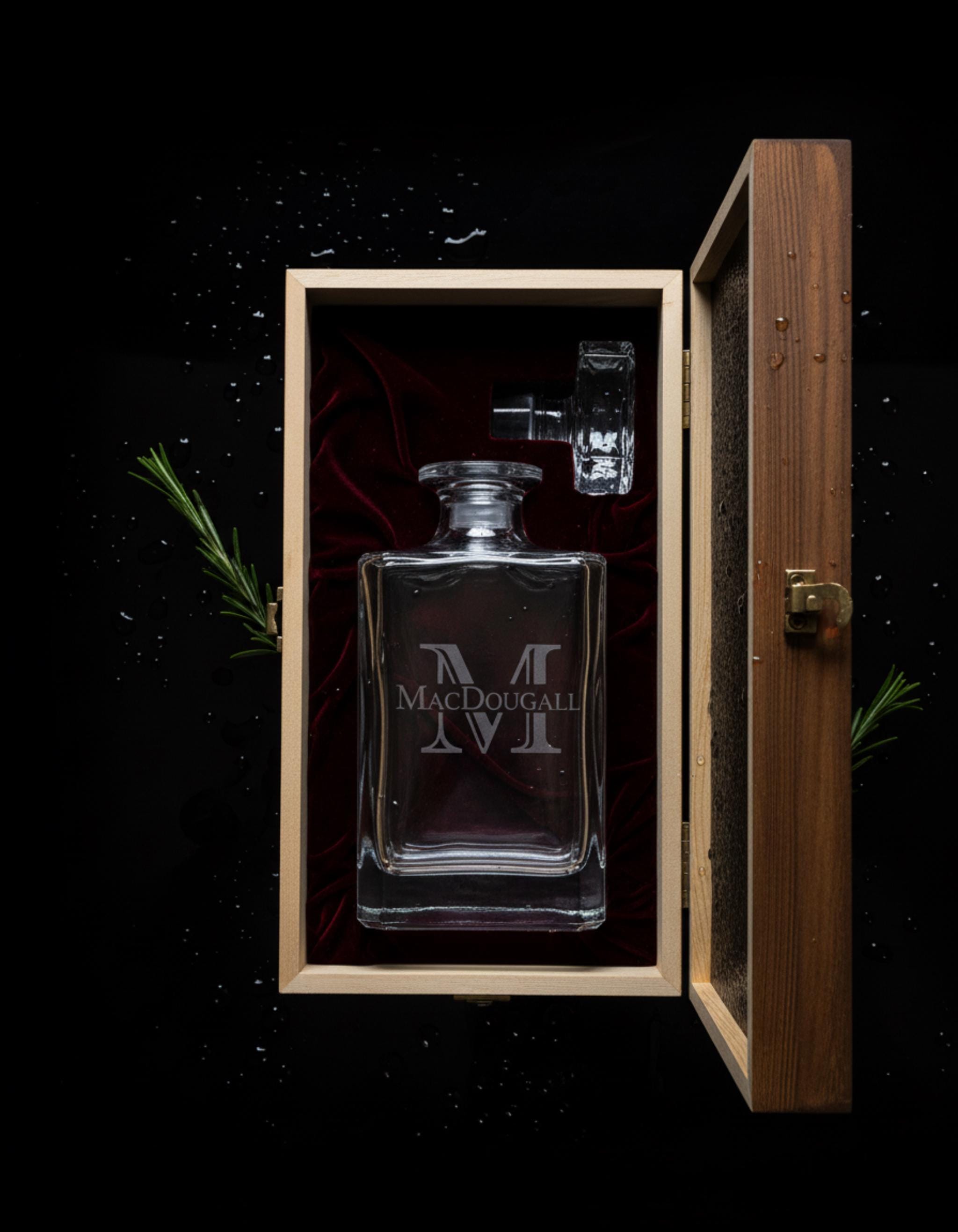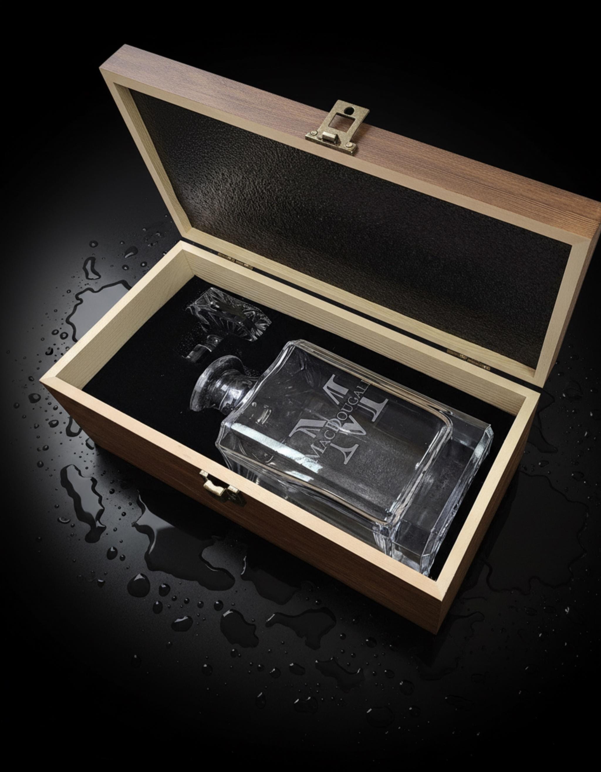 4- Decanter plus 2 glasses in a luxury wooden engraved box