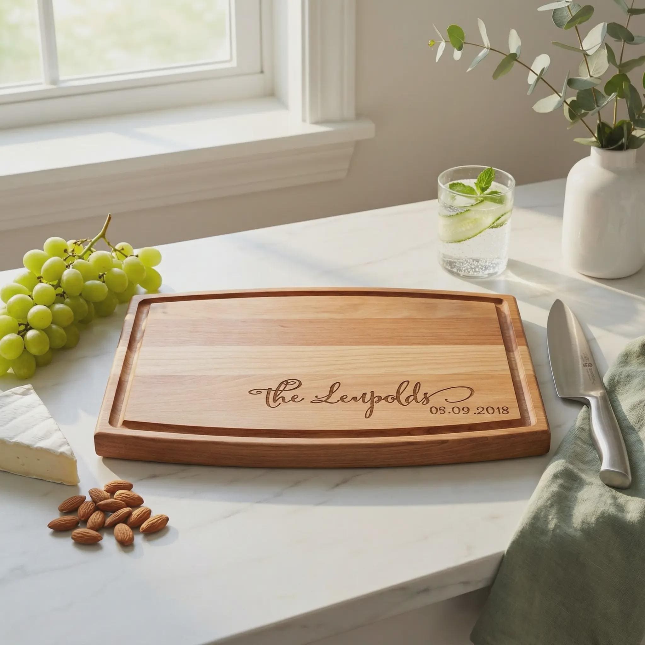 Celebrate their new beginning with this personalized family name cutting board. Featuring a classic script engraving and deep juice groove, this custom wood charcuterie board is the ultimate wedding gift for couples or a 5th anniversary keepsake.