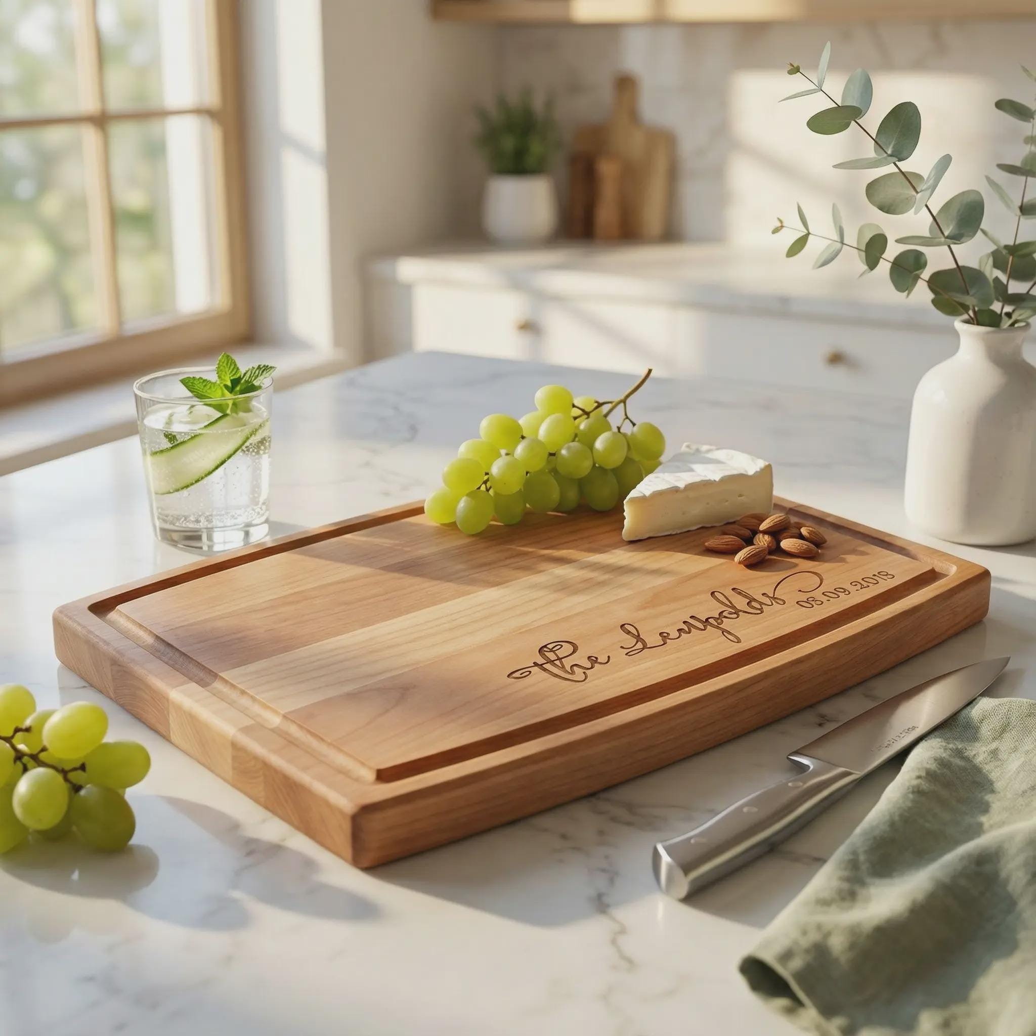 Family Name Wedding Gift | Personalized Cutting Board & Custom Wood Charcuterie Platter with Juice Groove
