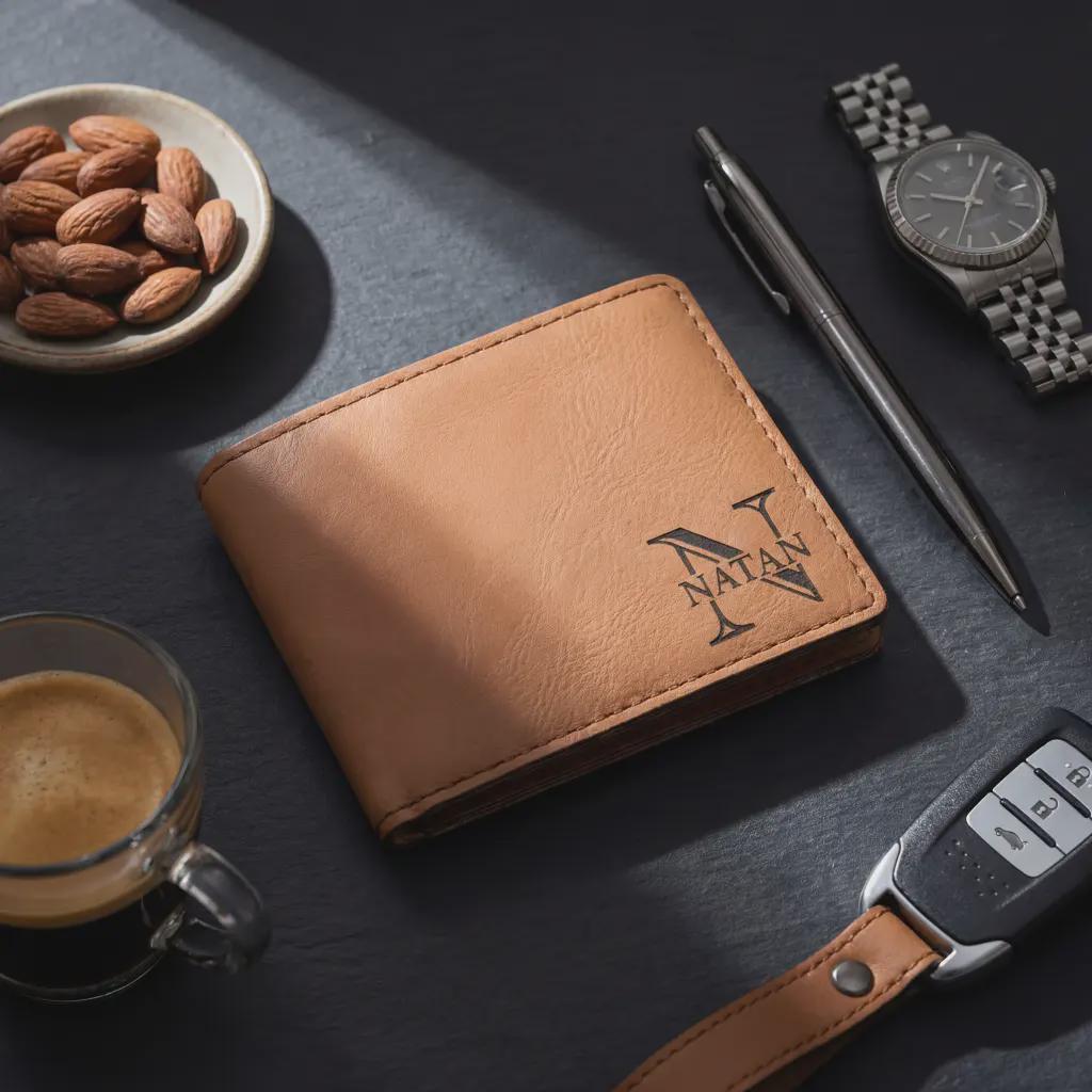 Elevate his everyday essentials with our personalized vegan leather bifold—a sophisticated accessory designed for the modern man.