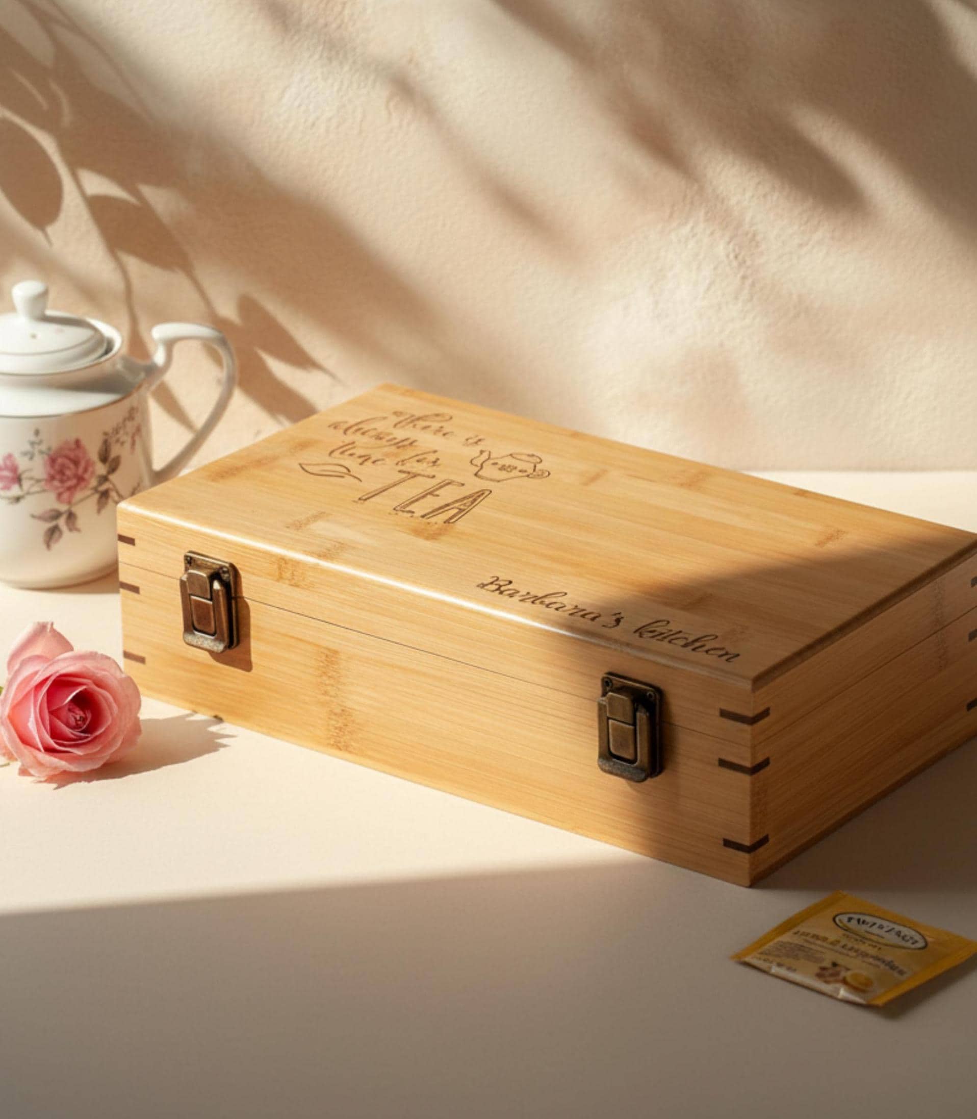 What really sets this tea box apart is its customizable engraving option. You can add anything from a cherished name to an inspiring quote, turning this organizer into a truly one-of-a-kind treasure. The elegant bamboo finish and refined design make it an eye-catching addition wherever it's placed, whether in your tea collection or as a special gift for moms, grandmas, and tea lovers alike.