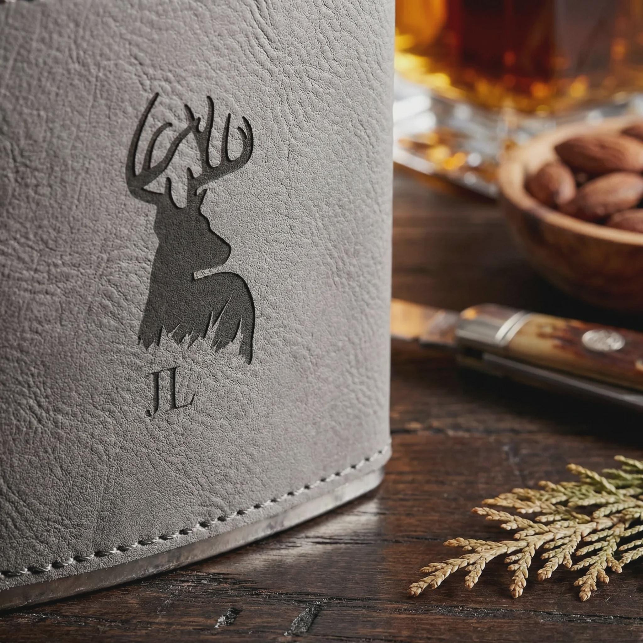 Choose between the elegant 6 oz flask on its own or the complete set, which comes in a sophisticated gray leatherette gift box and includes one flask, two shot glasses, and a filling funnel.