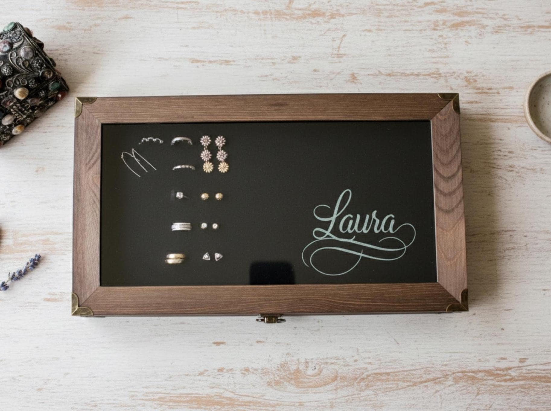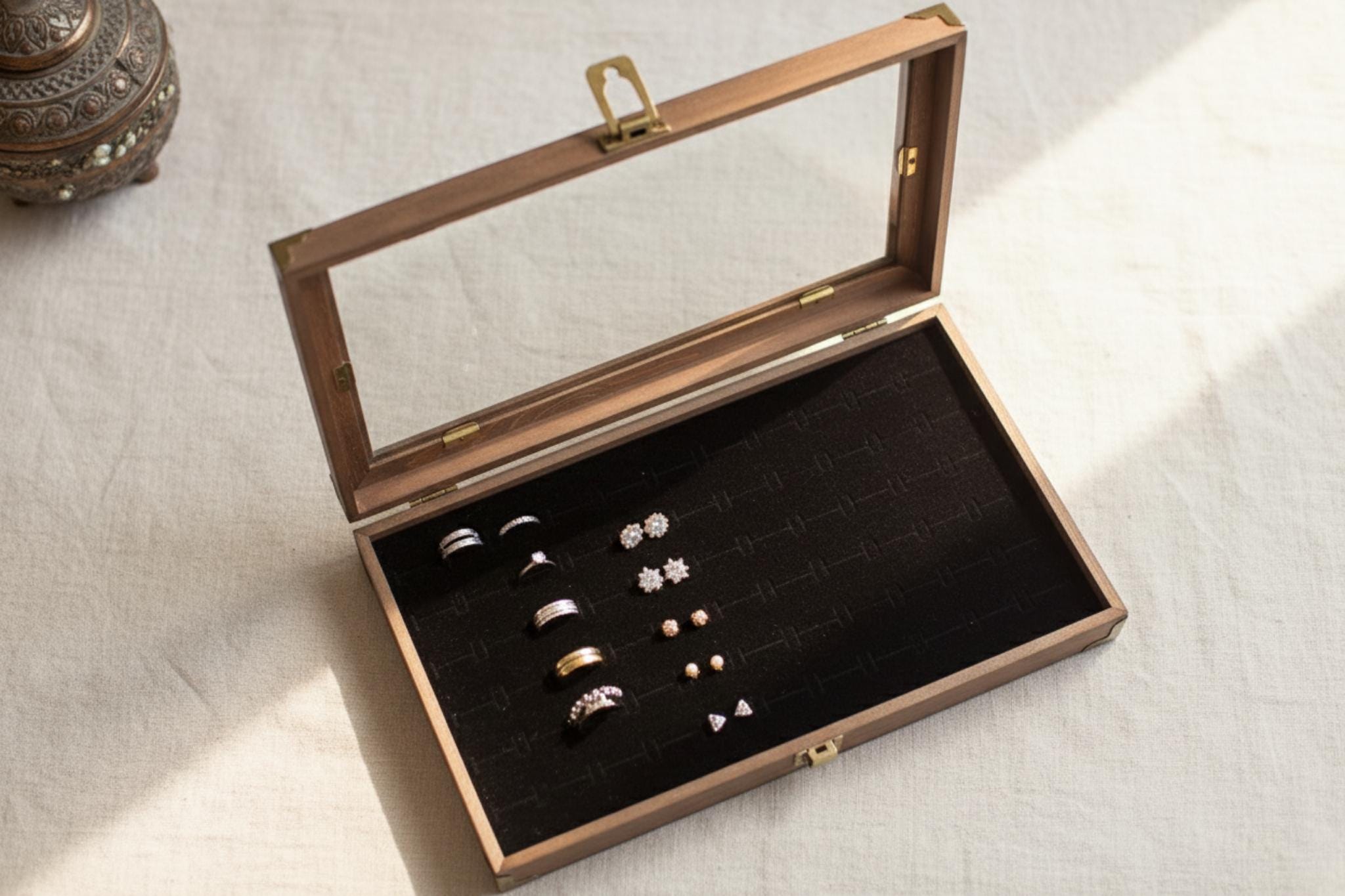 Give the special women in your life a gift they’ll treasure for years. Our handcrafted wooden jewelry box features a crystal‑clear glass lid for beautiful display and a plush black velvet insert that holds up to 66 rings or stud earrings securely in place.