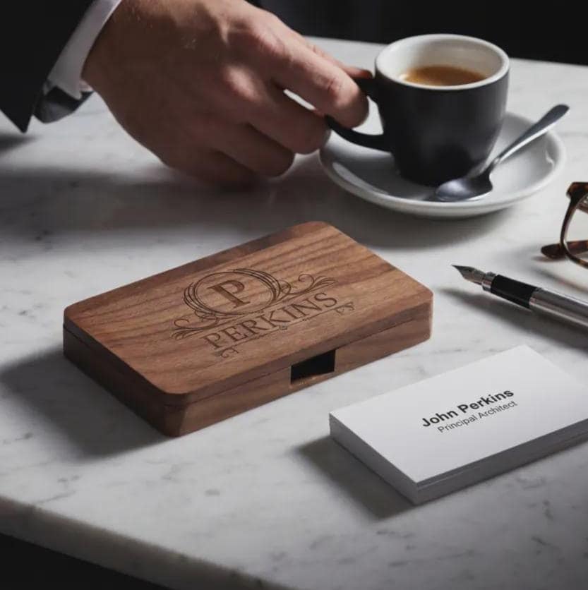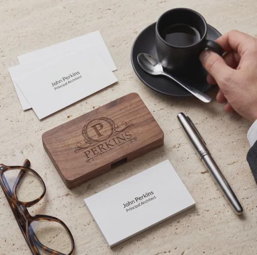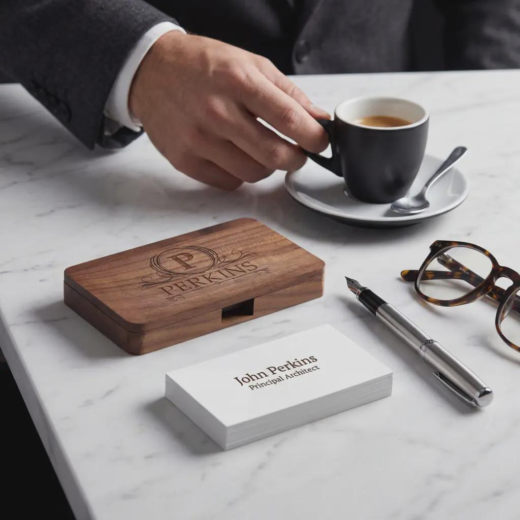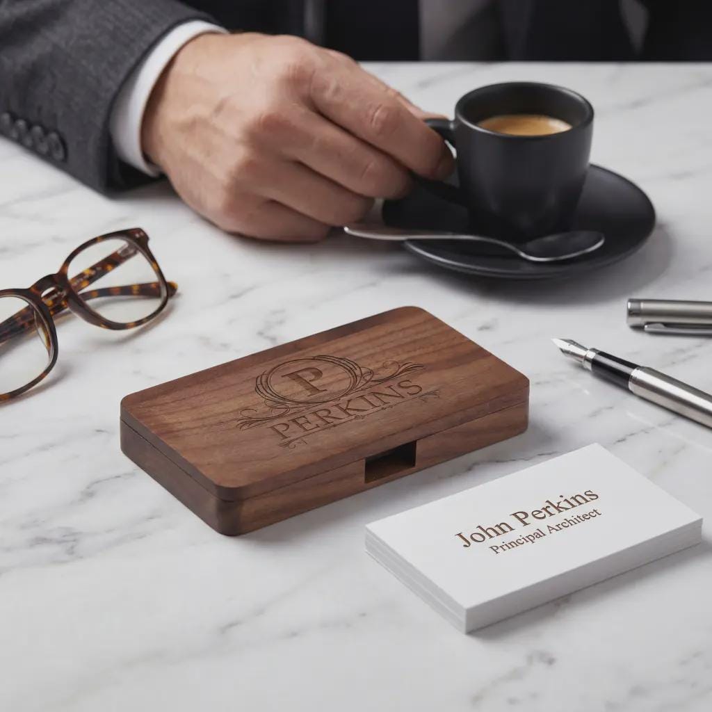 This personalized walnut business card holder features custom laser engraving. A professional wood case for executives, new job gifts, and office desk decor.