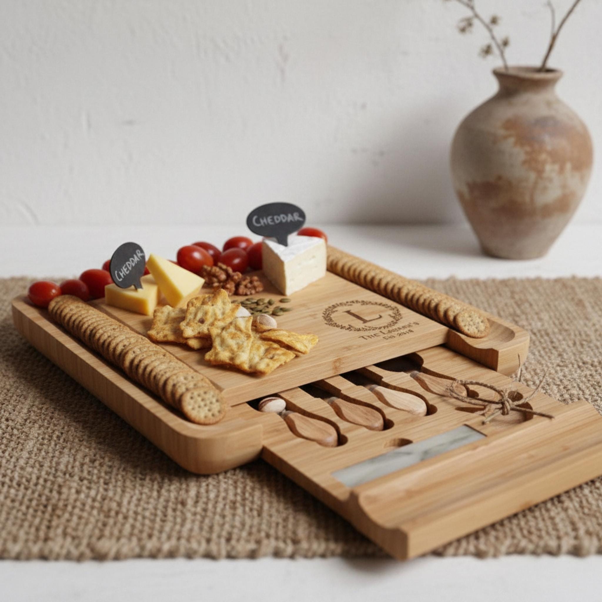This personalized bamboo cheese board set can be a thoughtful and practical gift for many occasions, such as weddings, bridal showers, engagements, or housewarming parties. The set includes a wooden board, a cheese fork, three cheese knives, two natural slate labels, and two markers, making it a complete package for hosting a cheese party or entertaining guests.