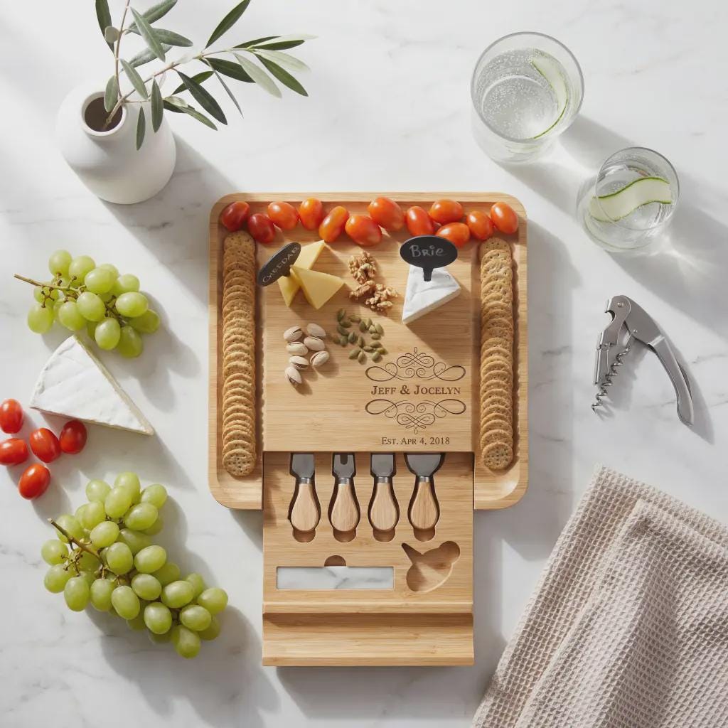 Elevate your hosting game with this elegant personalized bamboo charcuterie board, expertly engraved with your custom names and special date. This comprehensive serving set features a clever slide-out drawer that houses four professional stainless steel cheese knives and integrated slate markers for a sophisticated presentation. Crafted from sustainable, high-quality bamboo, it serves as a meaningful wedding keepsake, a unique housewarming surprise for a new couple, or a timeless 5th-anniversary gift for those who love to entertain in style.