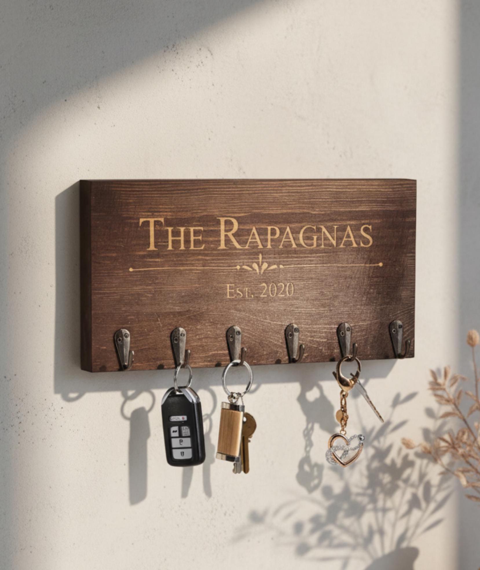 Welcome guests and keep your keys organized in style with our personalized rustic key hanger! This unique, custom-engraved key holder is more than just a practical accessory; it's a charming wall-mounted home decor that adds warmth and character to any entryway, mudroom, or kitchen.