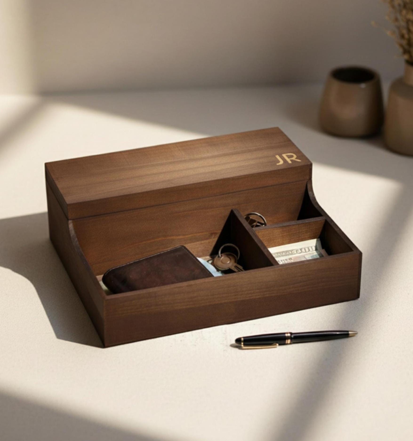 This wooden box has 3 compartments: