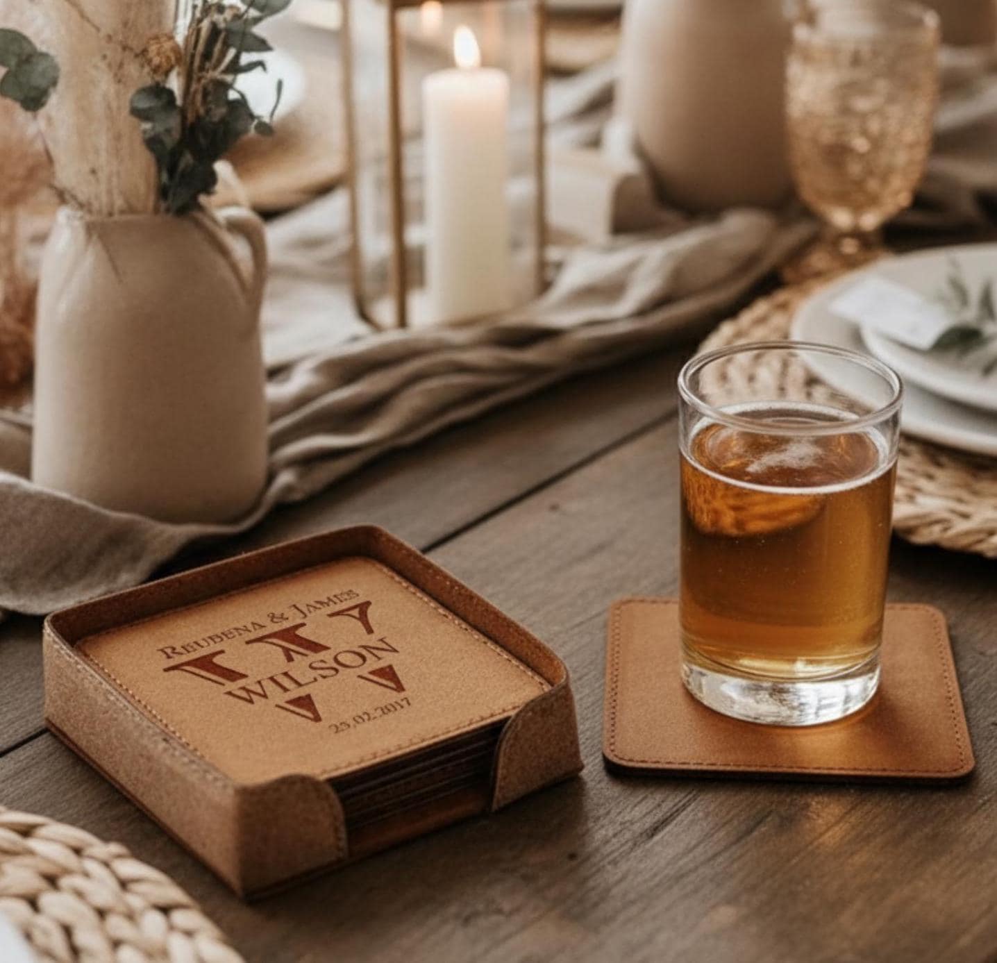 our personalized bamboo coasters sets are great for weddings, birthdays, house-warming, or any special occasion