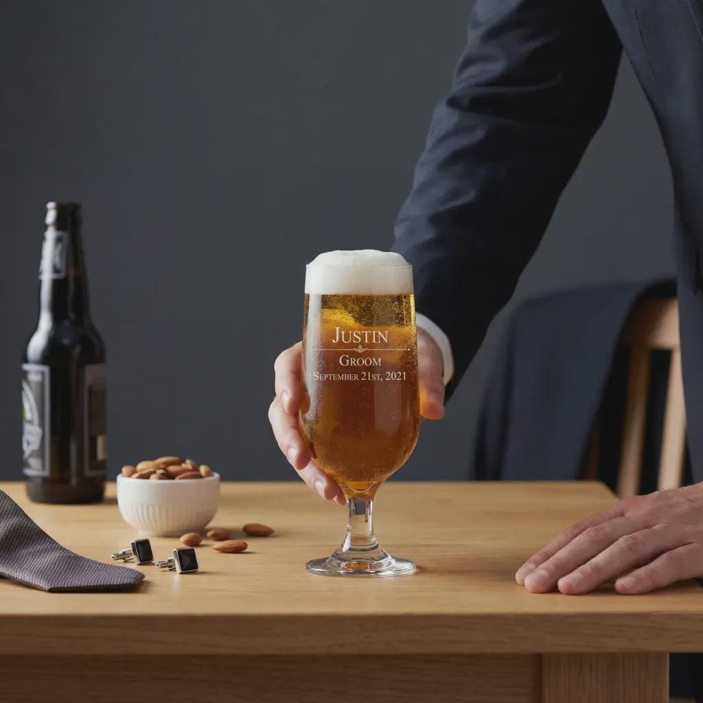 At JM la bonne impression, we create sophisticated, high-end barware designed to make your wedding toasts unforgettable. This premium stemmed pilsner glass is professionally laser-engraved with names, roles (such as "Groom" or "Best Man"), and wedding dates. Featuring a slender, graceful profile, it is the perfect marriage of a refined aesthetic and the classic utility every beer lover appreciates.