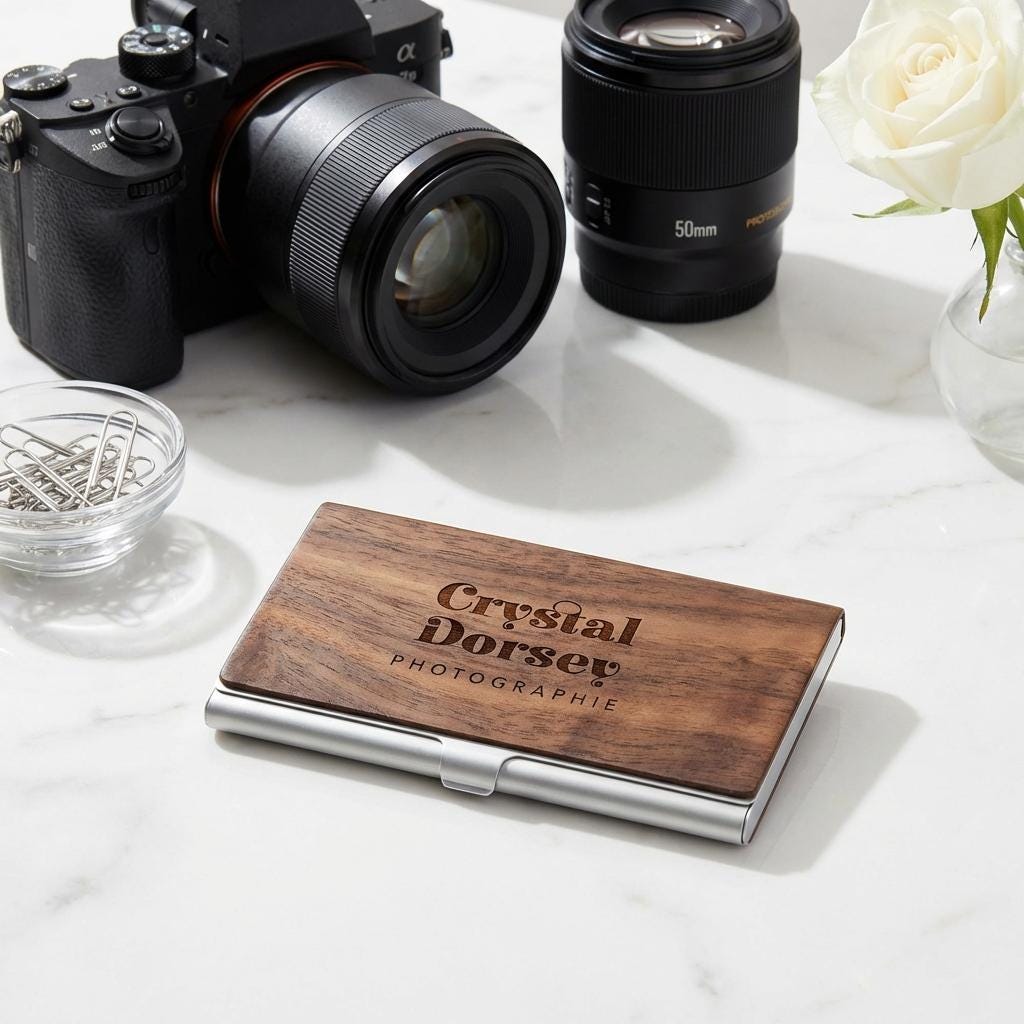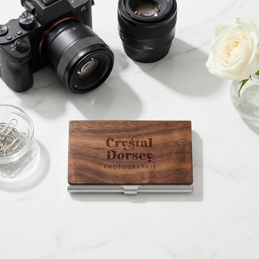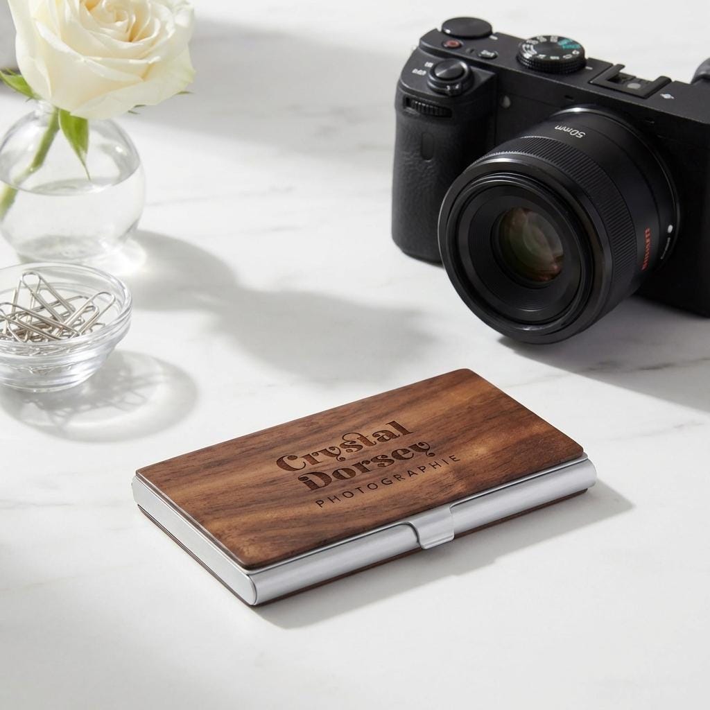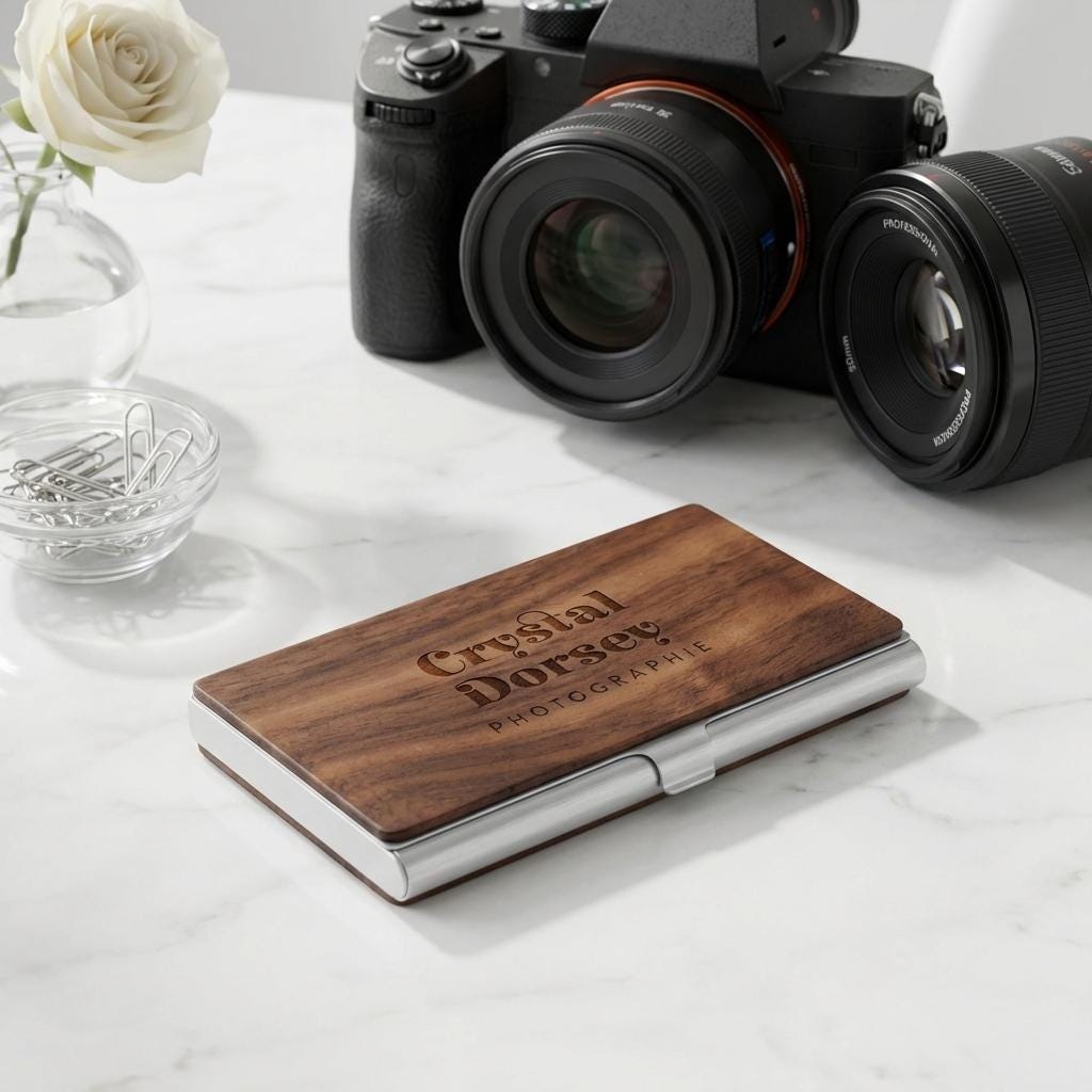 Elevate your professional networking with this personalized wood business card holder. Handcrafted from genuine North American maple or walnut with a durable metal frame, this slim case is designed for both desk display and portable use. Each holder is precision laser-engraved with names, titles, or custom logos for a permanent, high-contrast finish.